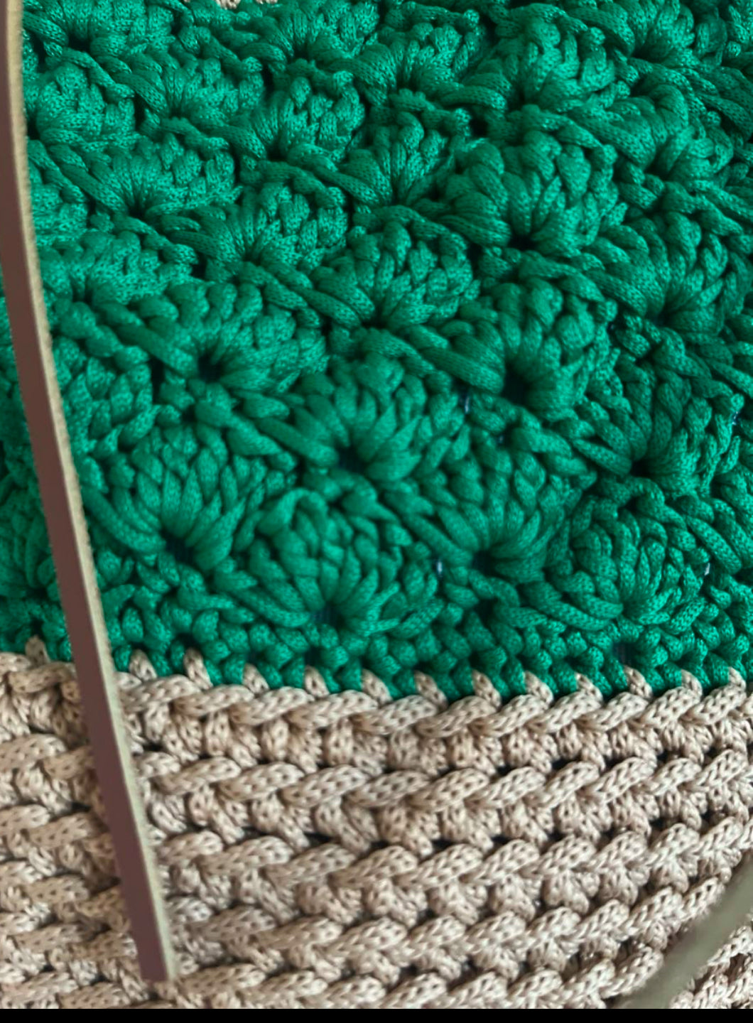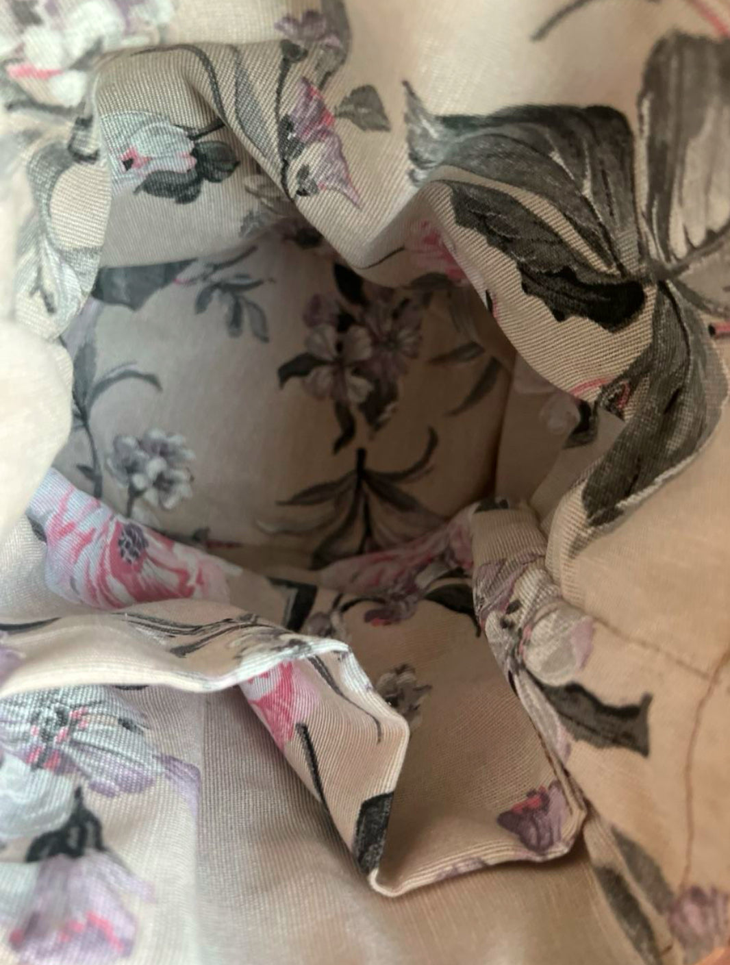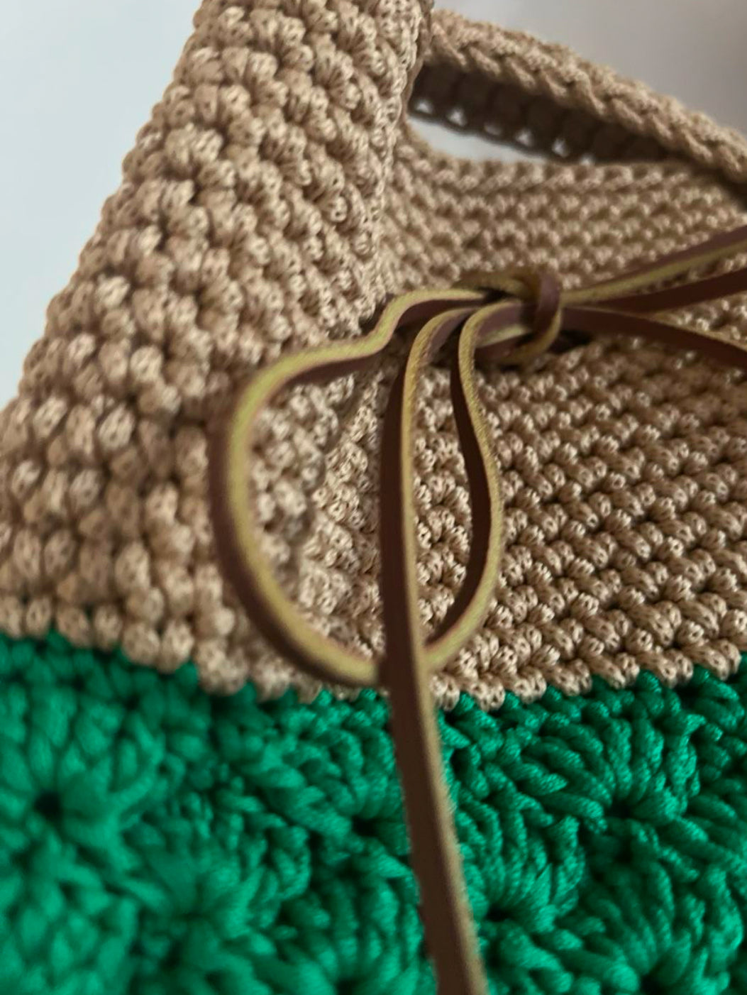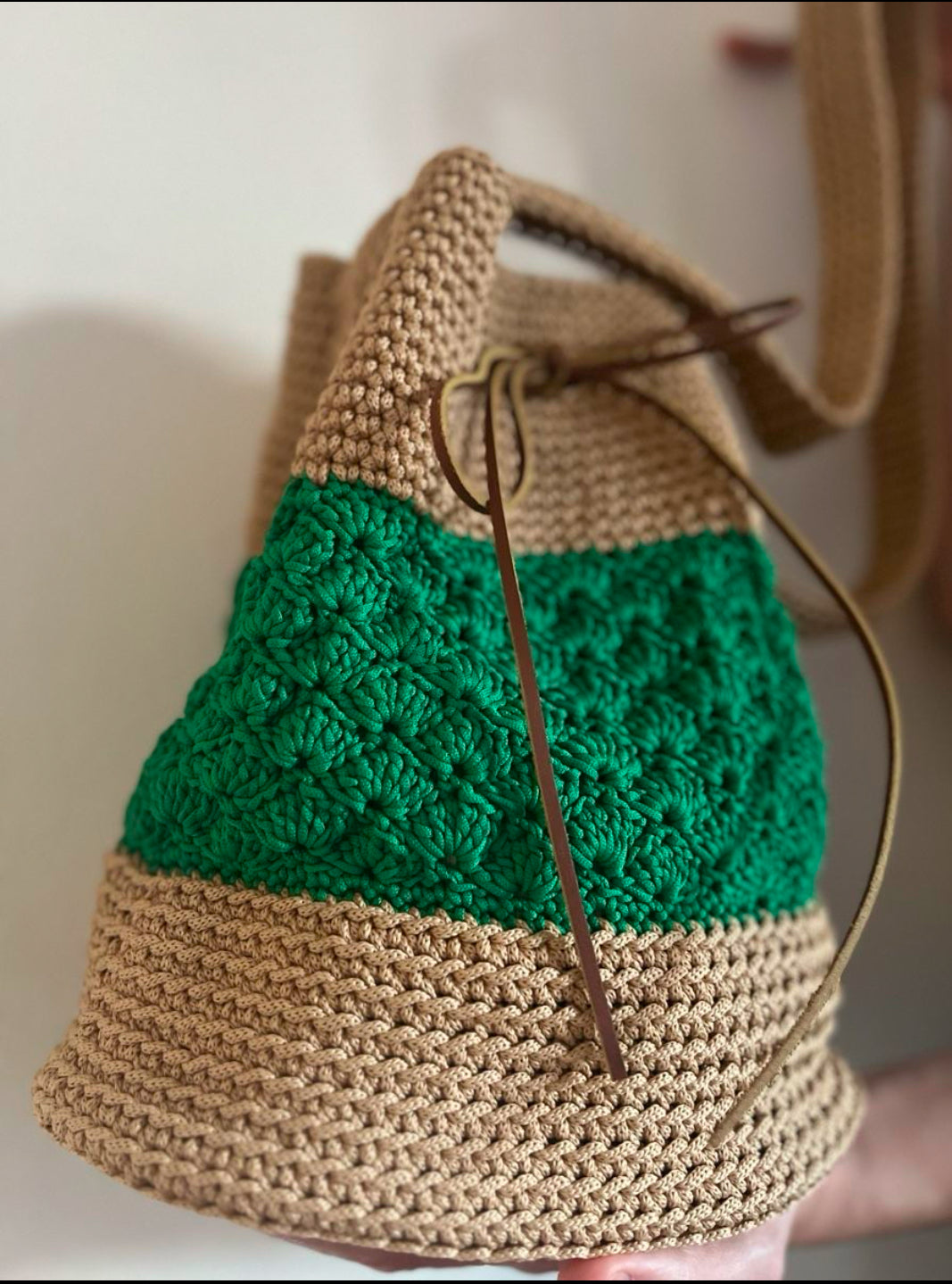 Diese Beuteltasche kombiniert auf elegante Weise Beige und Grün in einer perfekten Balance natürlicher Farben. Es ist sehr praktisch und geräumig, das schöne Innenfutter mit Blumenmuster verleiht ihm einen Hauch von Raffinesse und Frische.