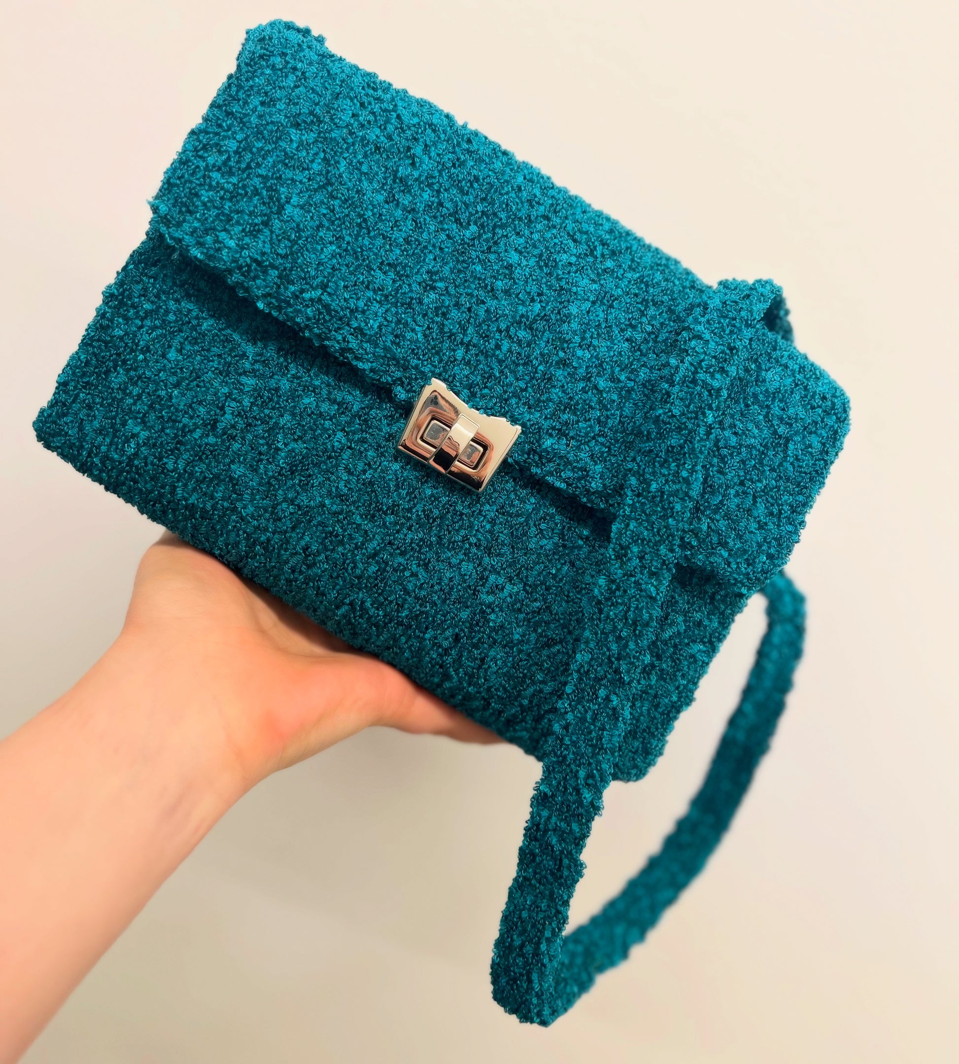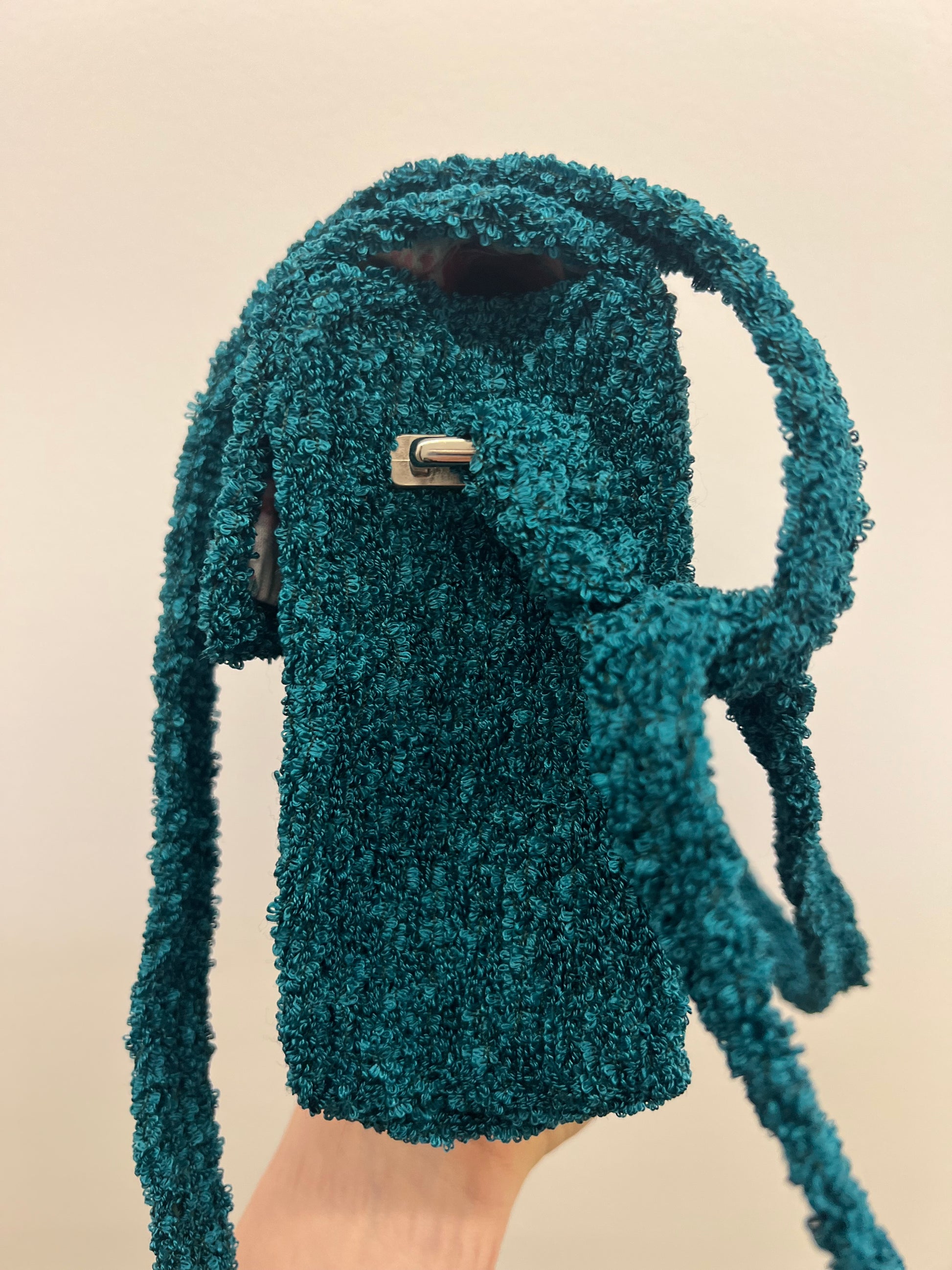 Borsa realizzata in filato bouclé verde, dalla texture ricca e originale. L’interno è foderato in raso floreale, per un tocco elegante e sorprendente. Dotata di tracolla fissa, è pensata per essere indossata a tracolla con stile.