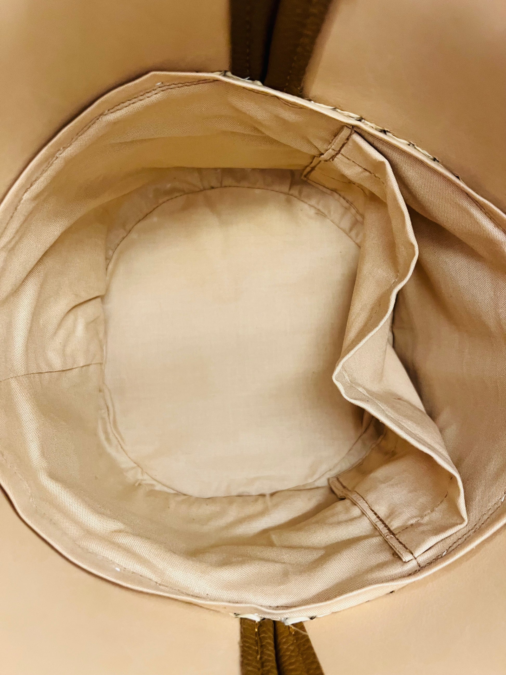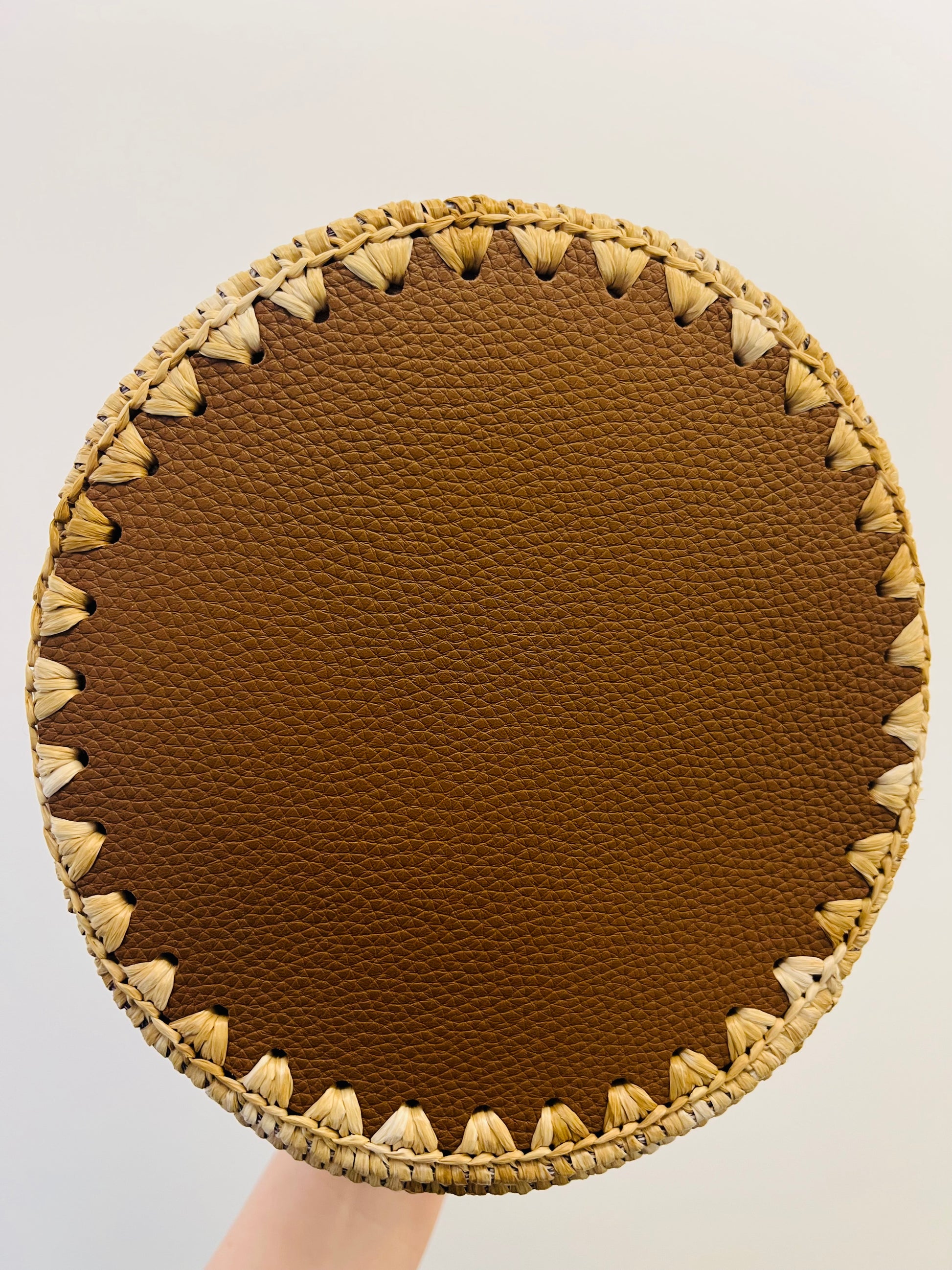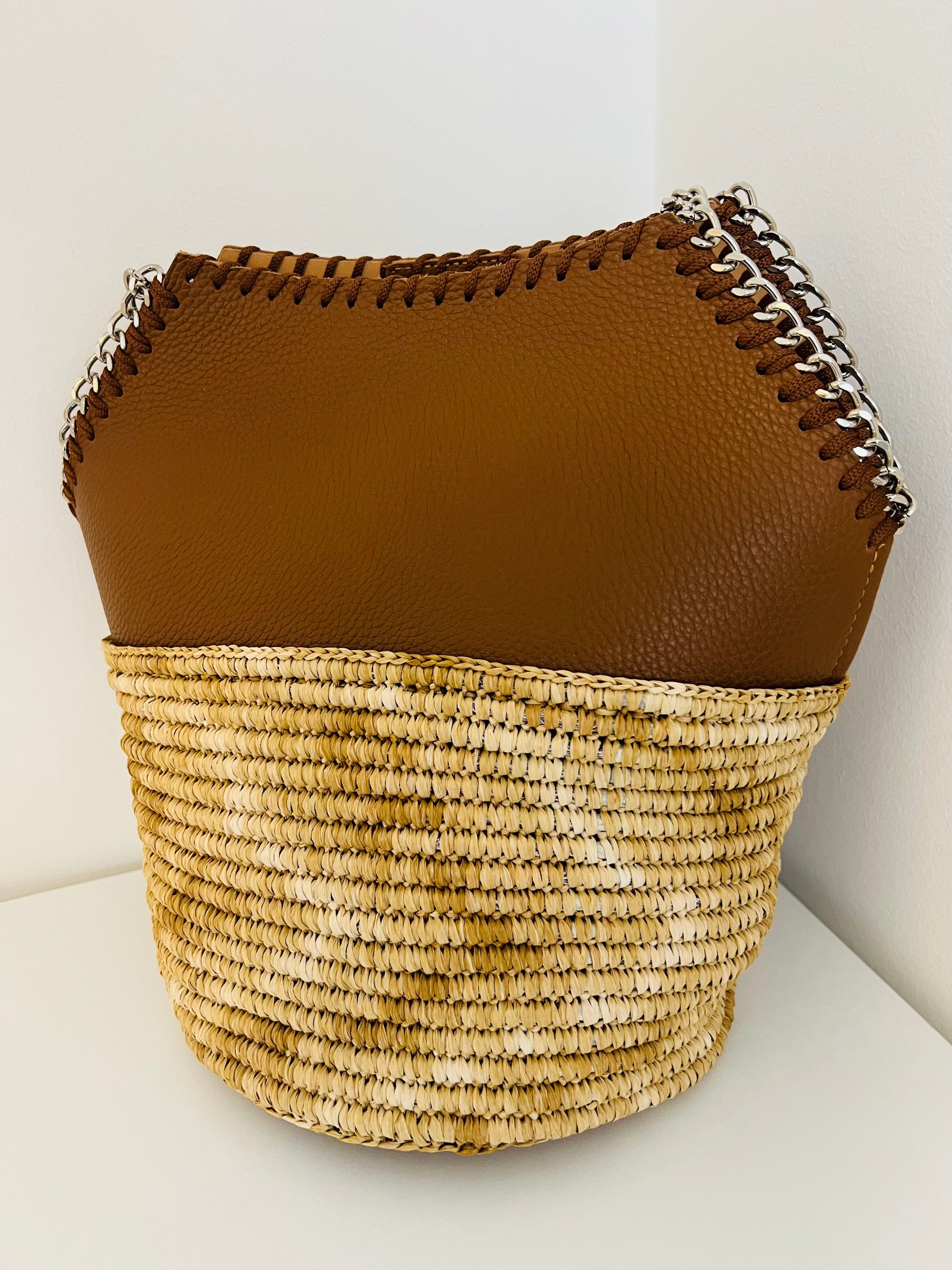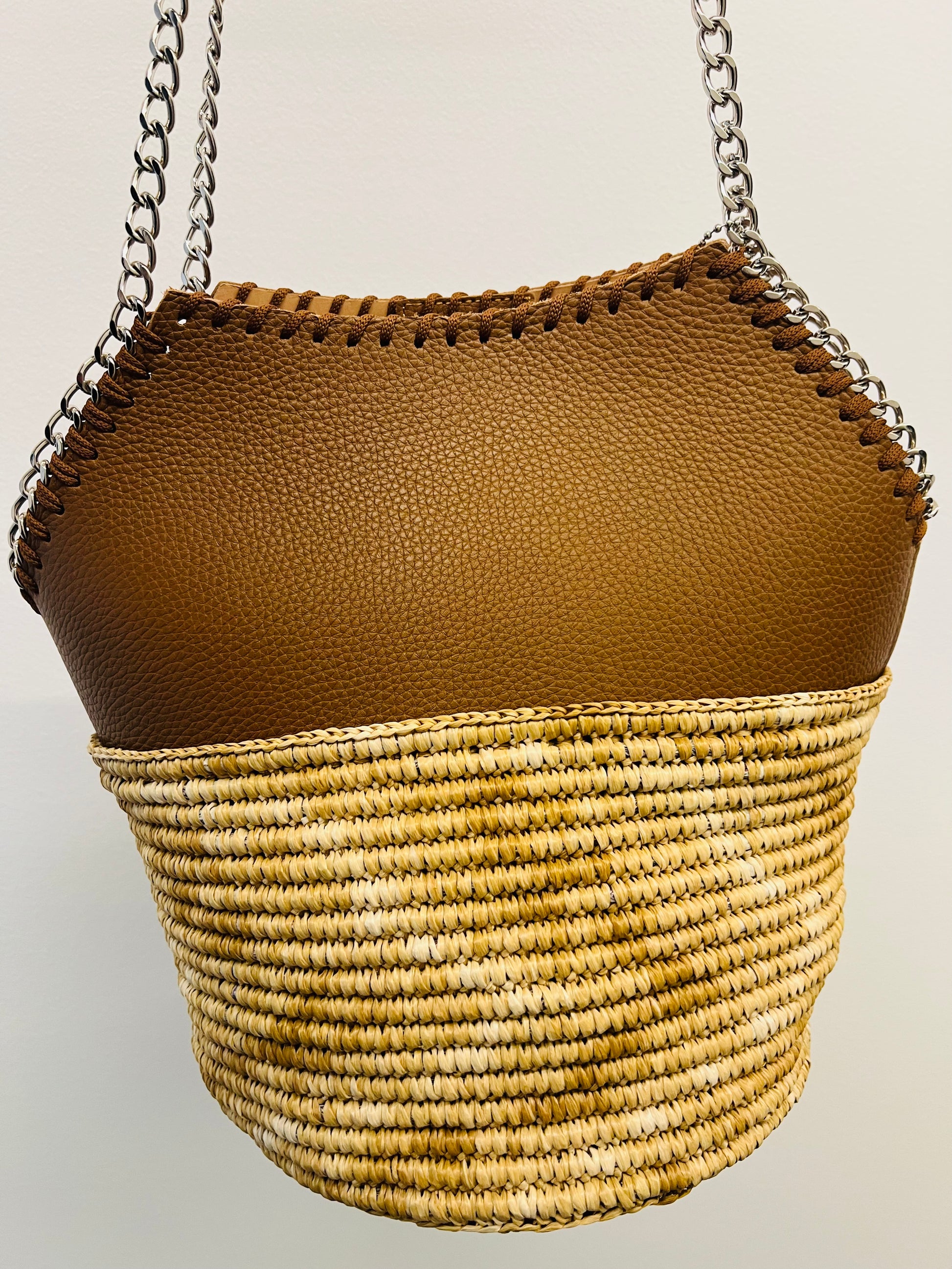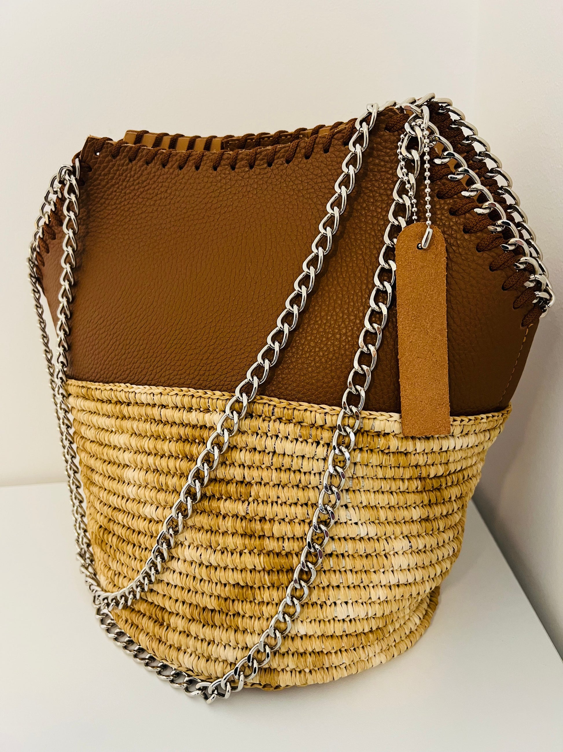 Borsa elegante in rafia e vera pelle, un connubio raffinato dai colori neutri e naturali.