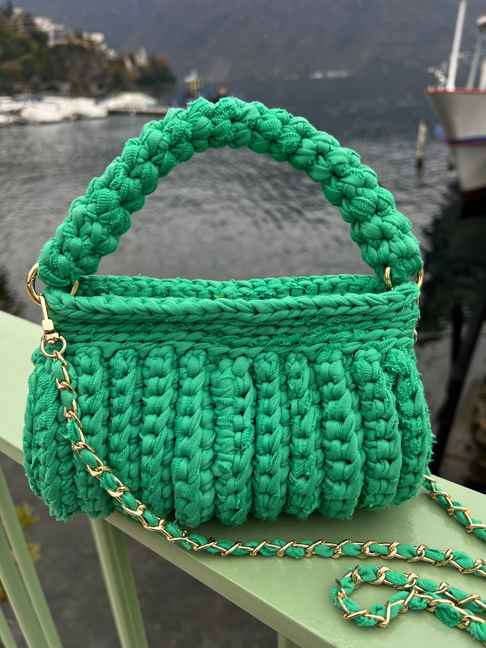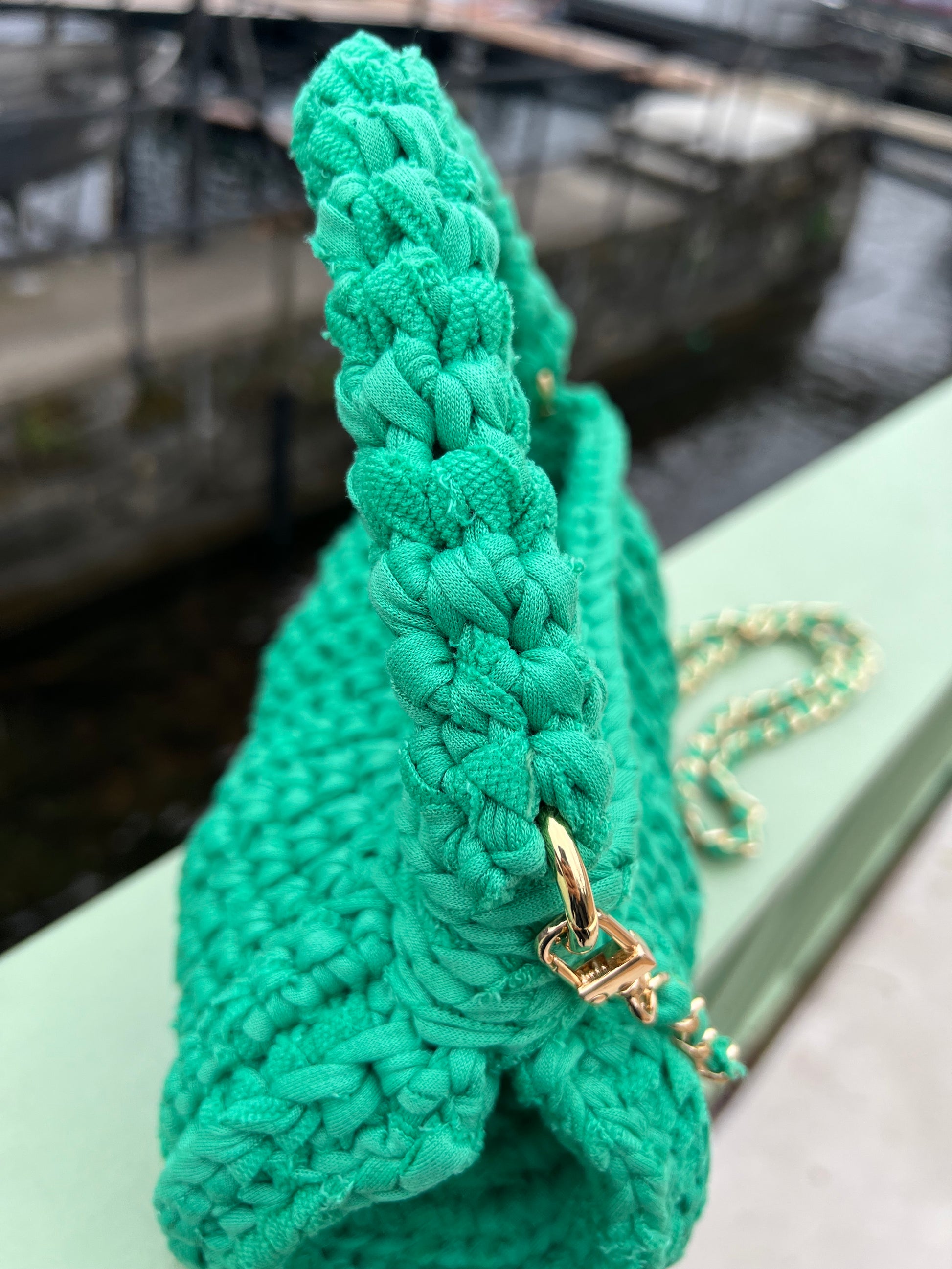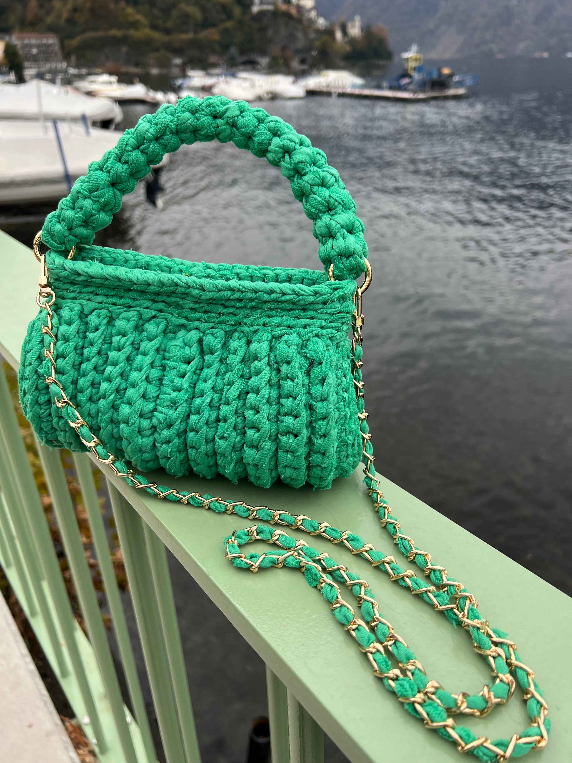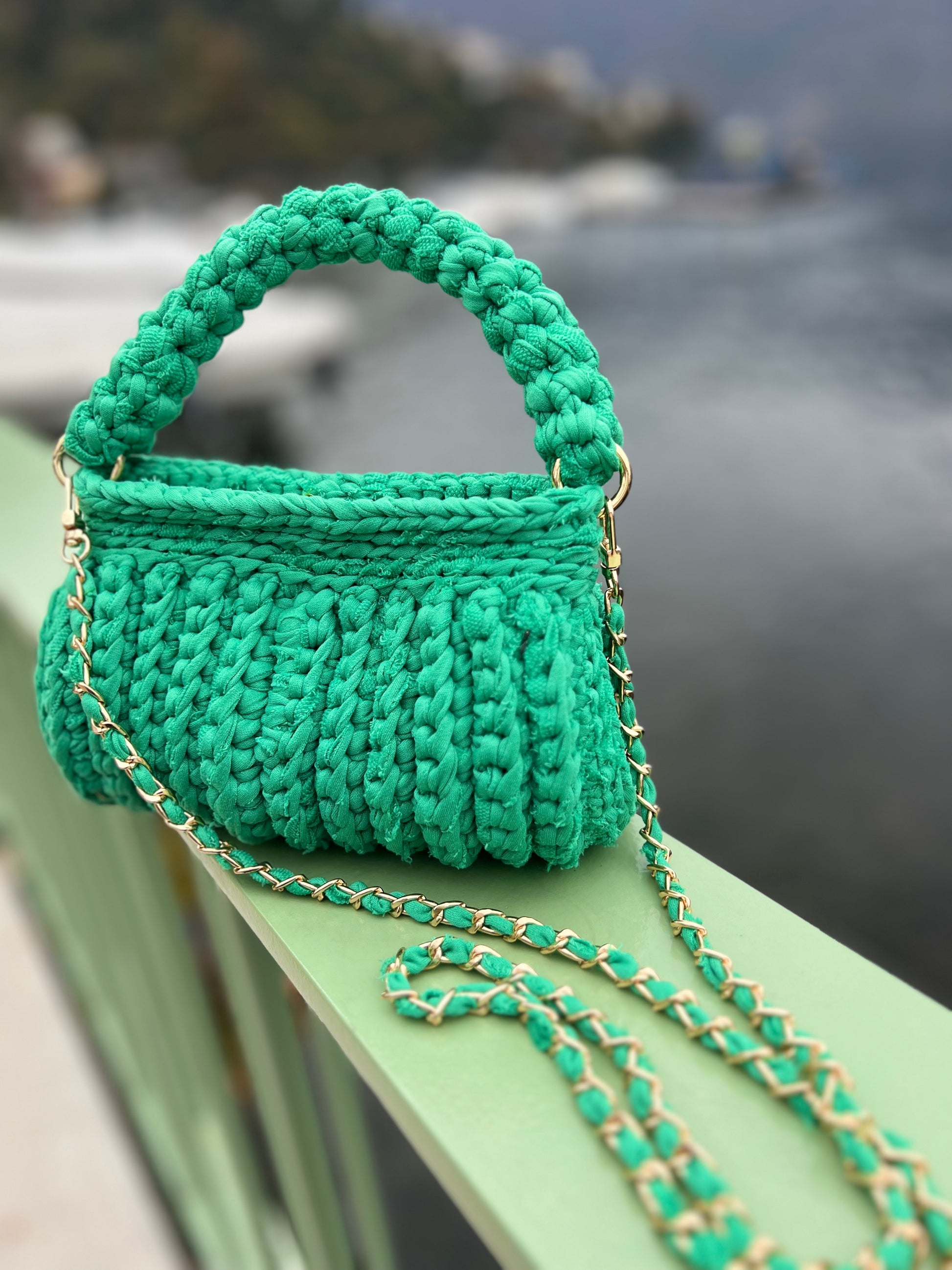 Borsa cilindrica in crochet, piccola ma sorprendentemente capiente, realizzata in un elegante verde intenso.