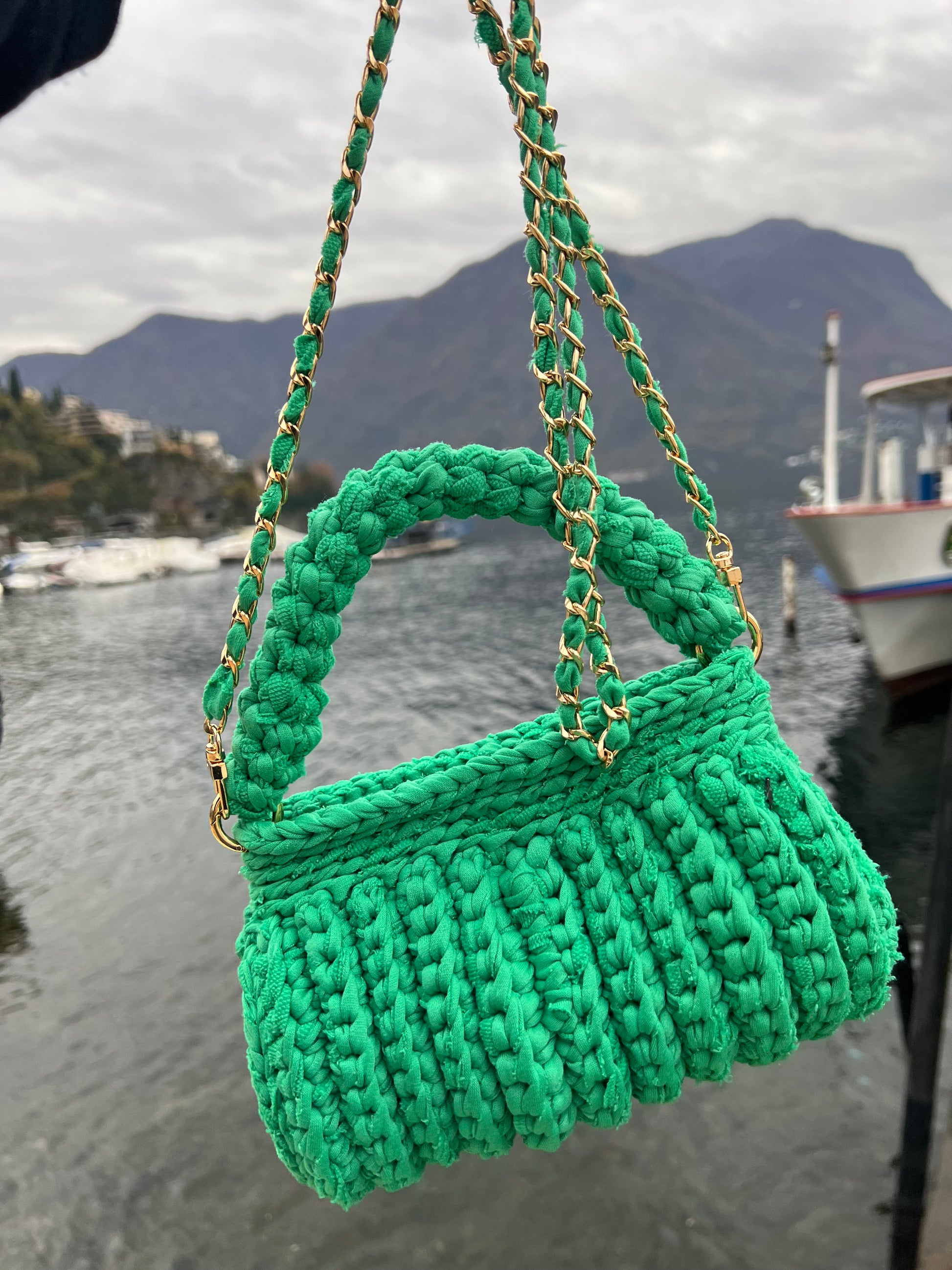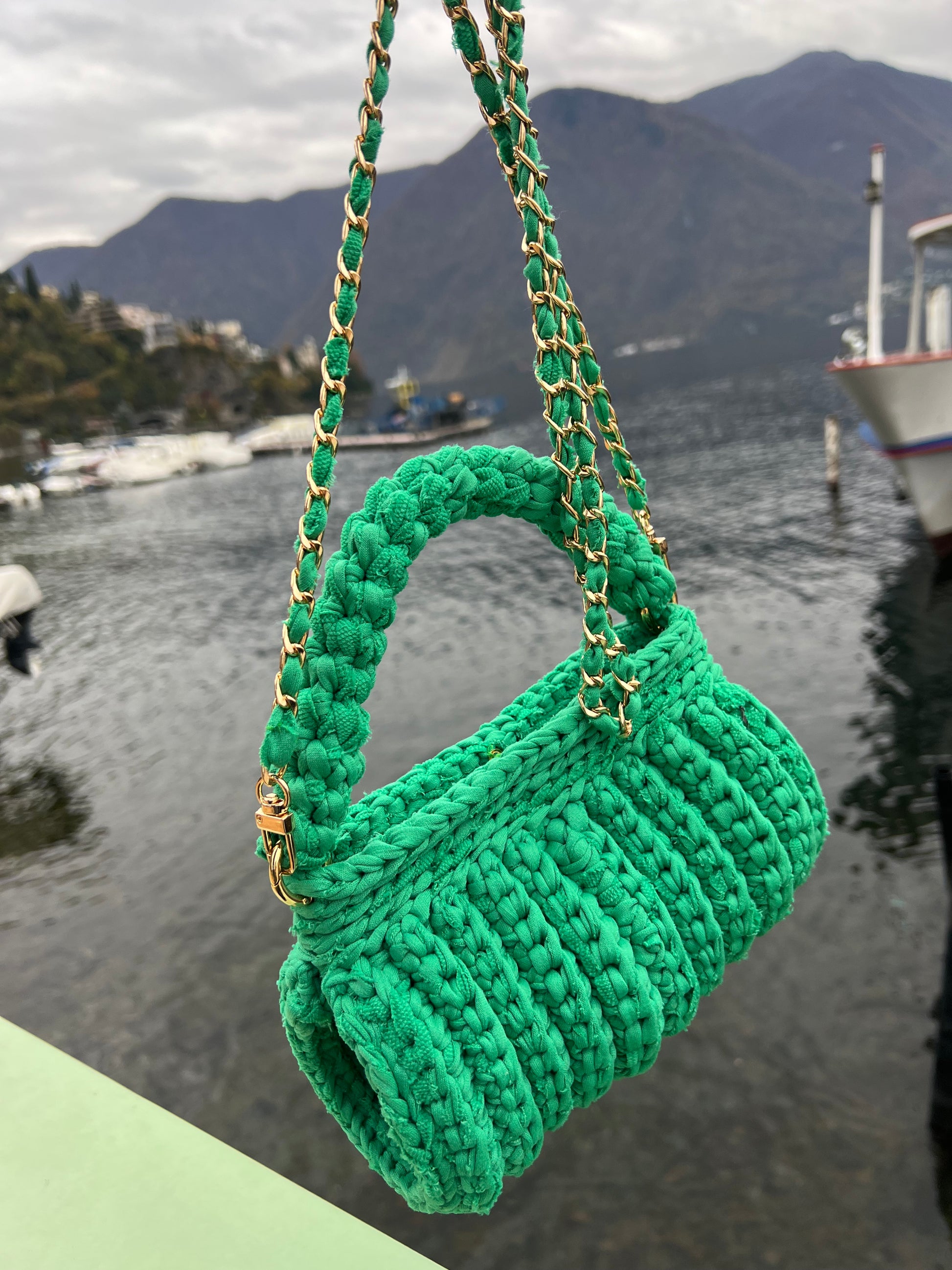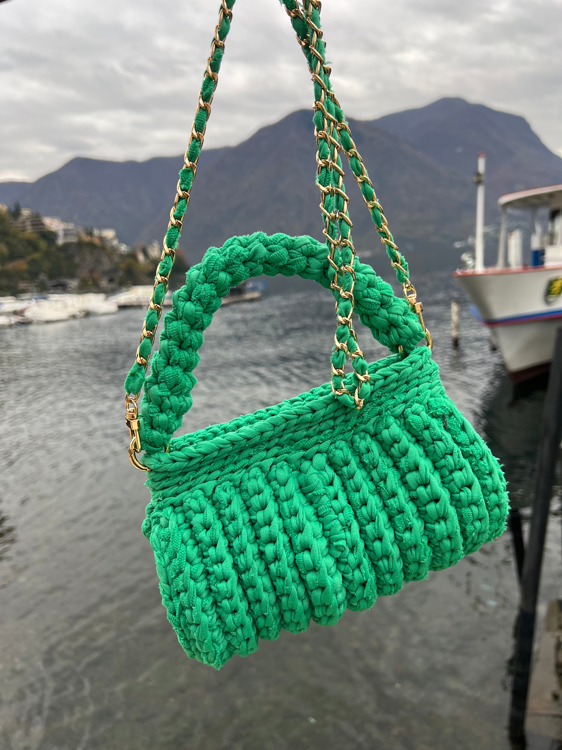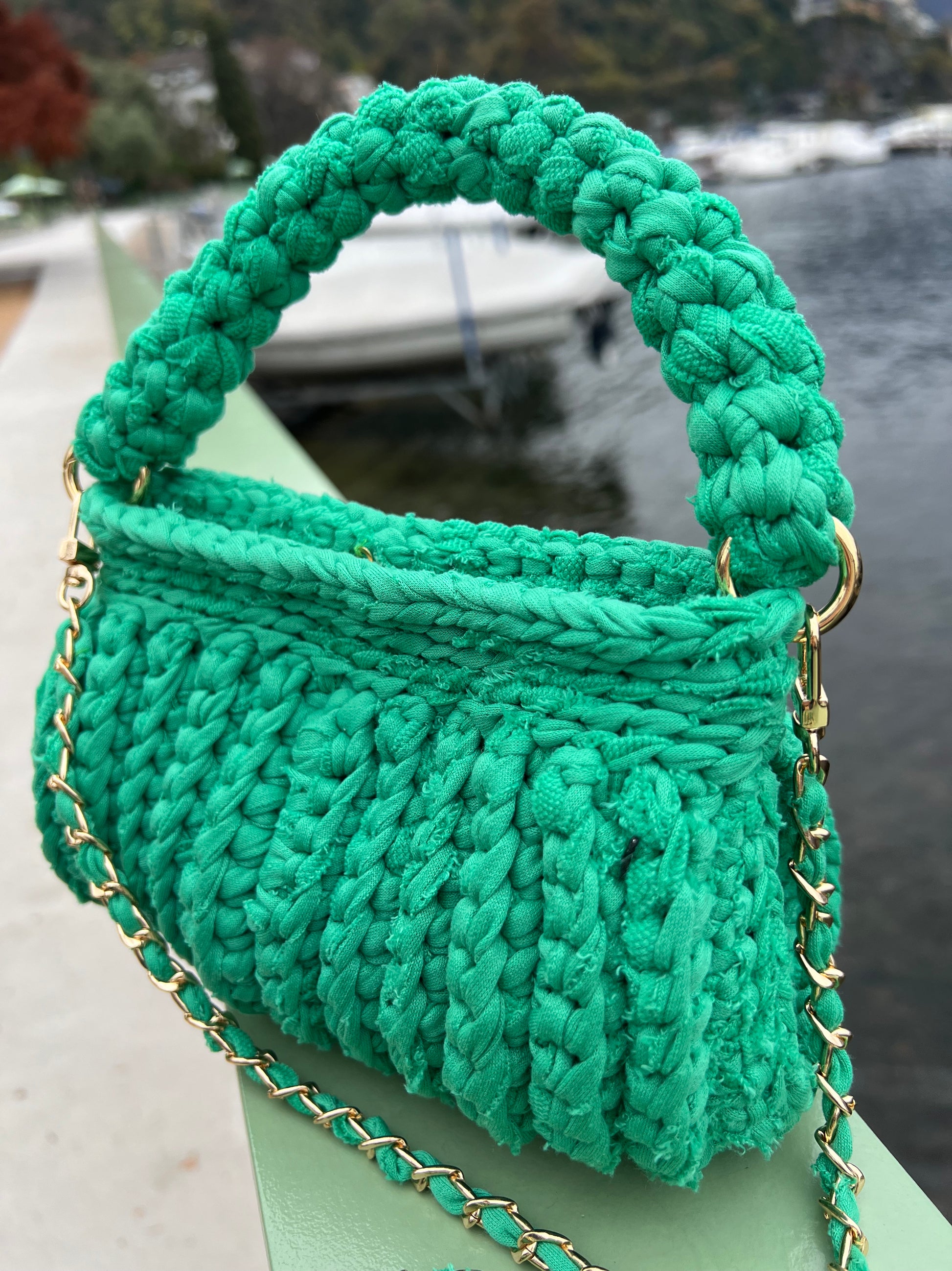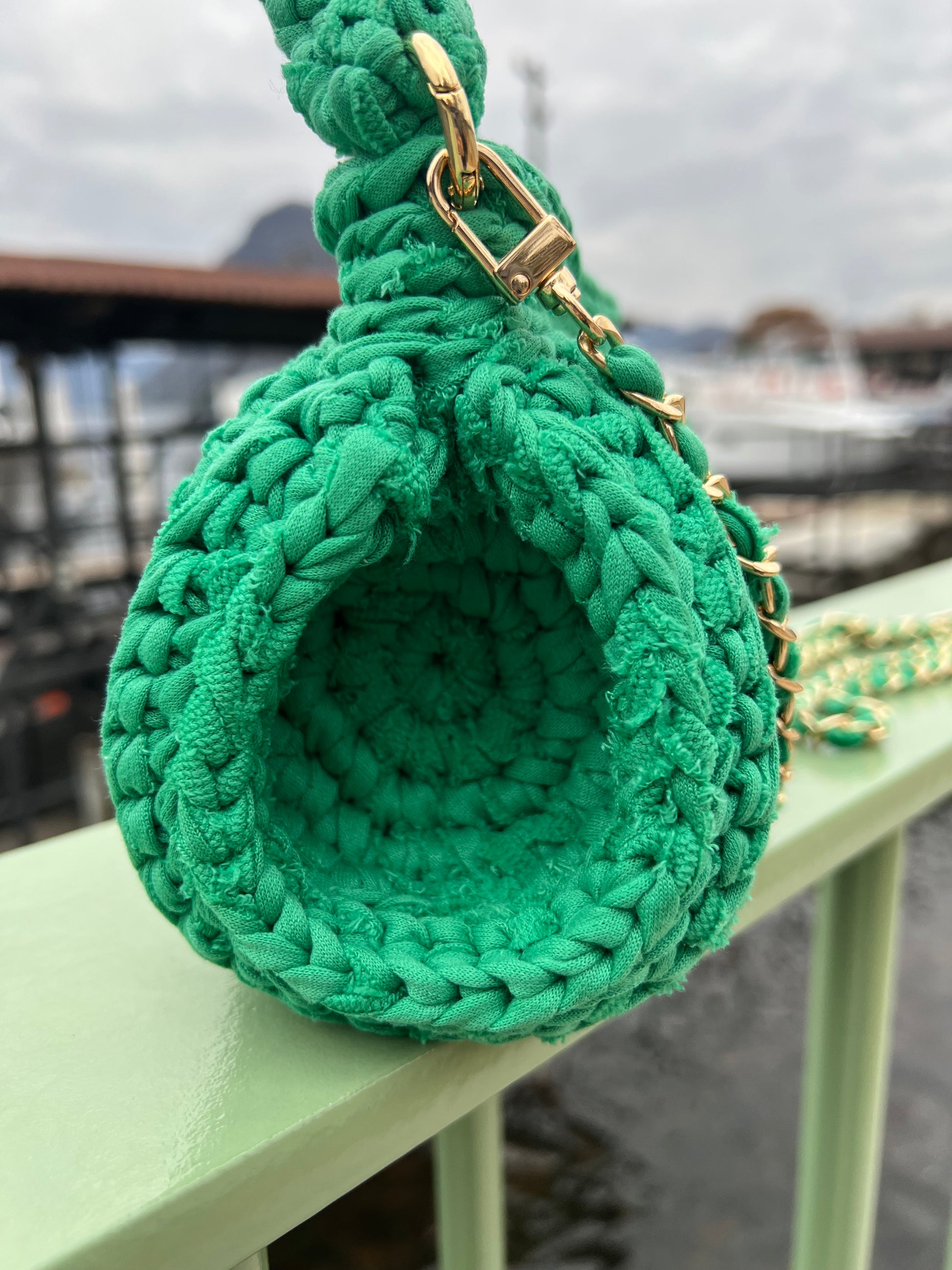Borsa cilindrica in crochet, piccola ma sorprendentemente capiente, realizzata in un elegante verde intenso.