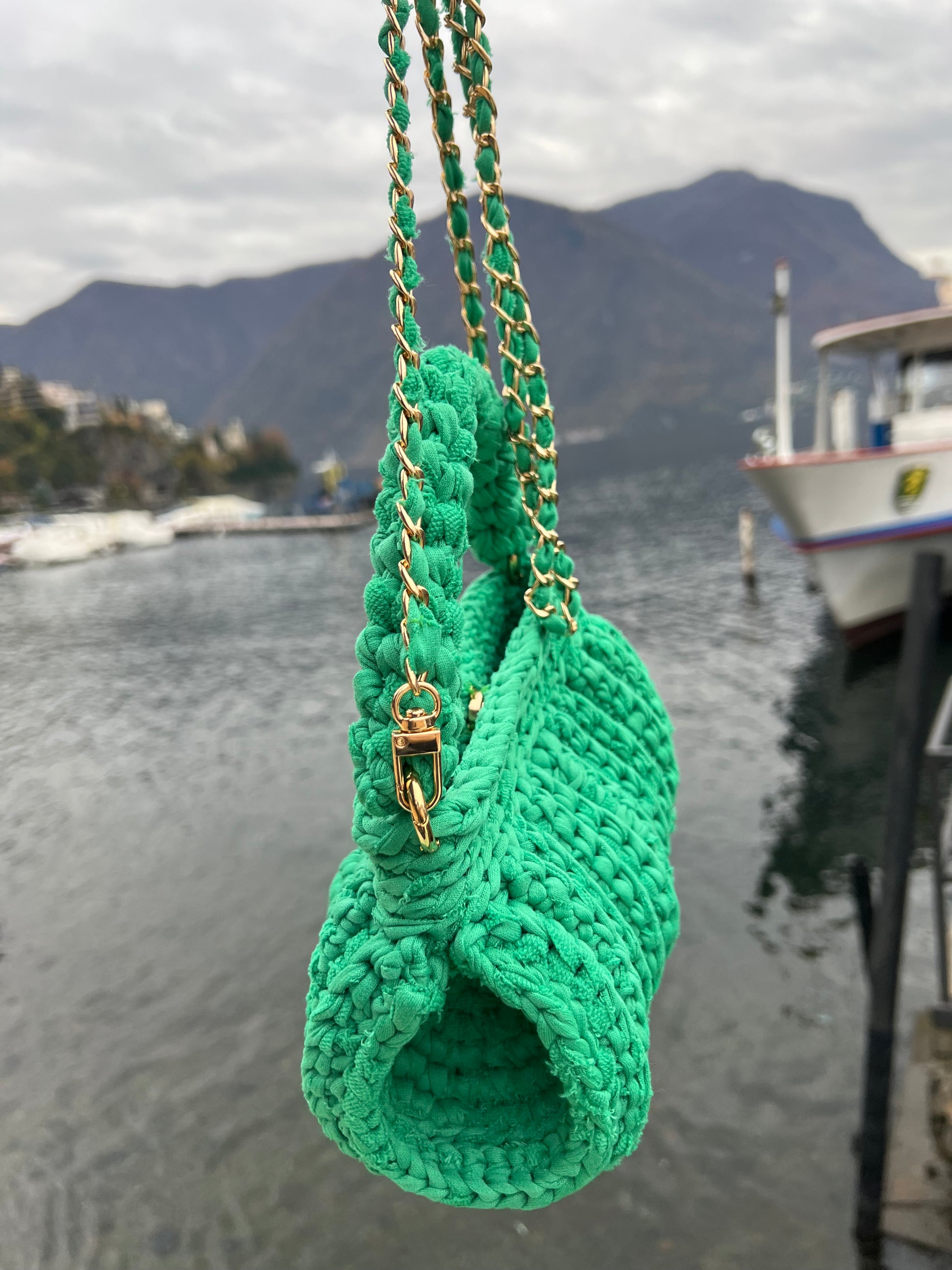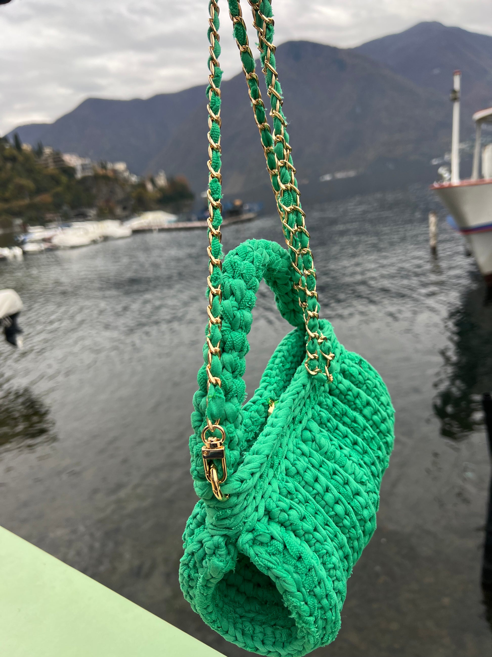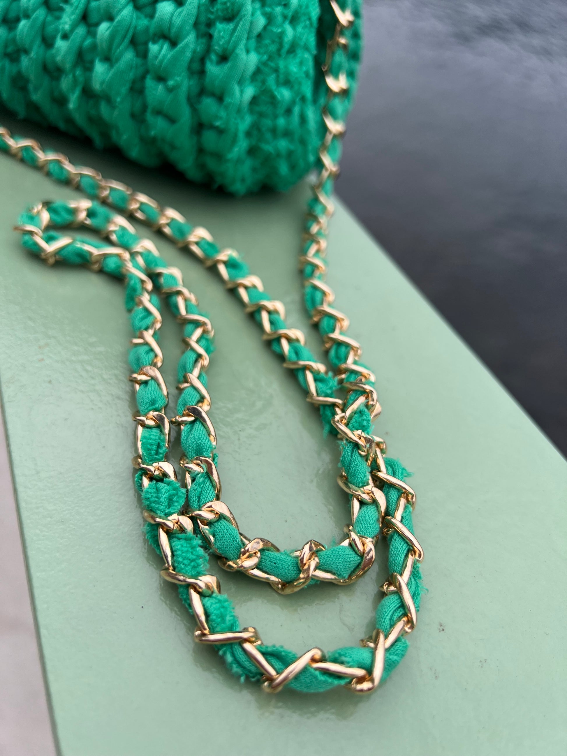 Completata da una tracolla removibile in catena oro intrecciata al filato verde, per un tocco luminoso e raffinato.