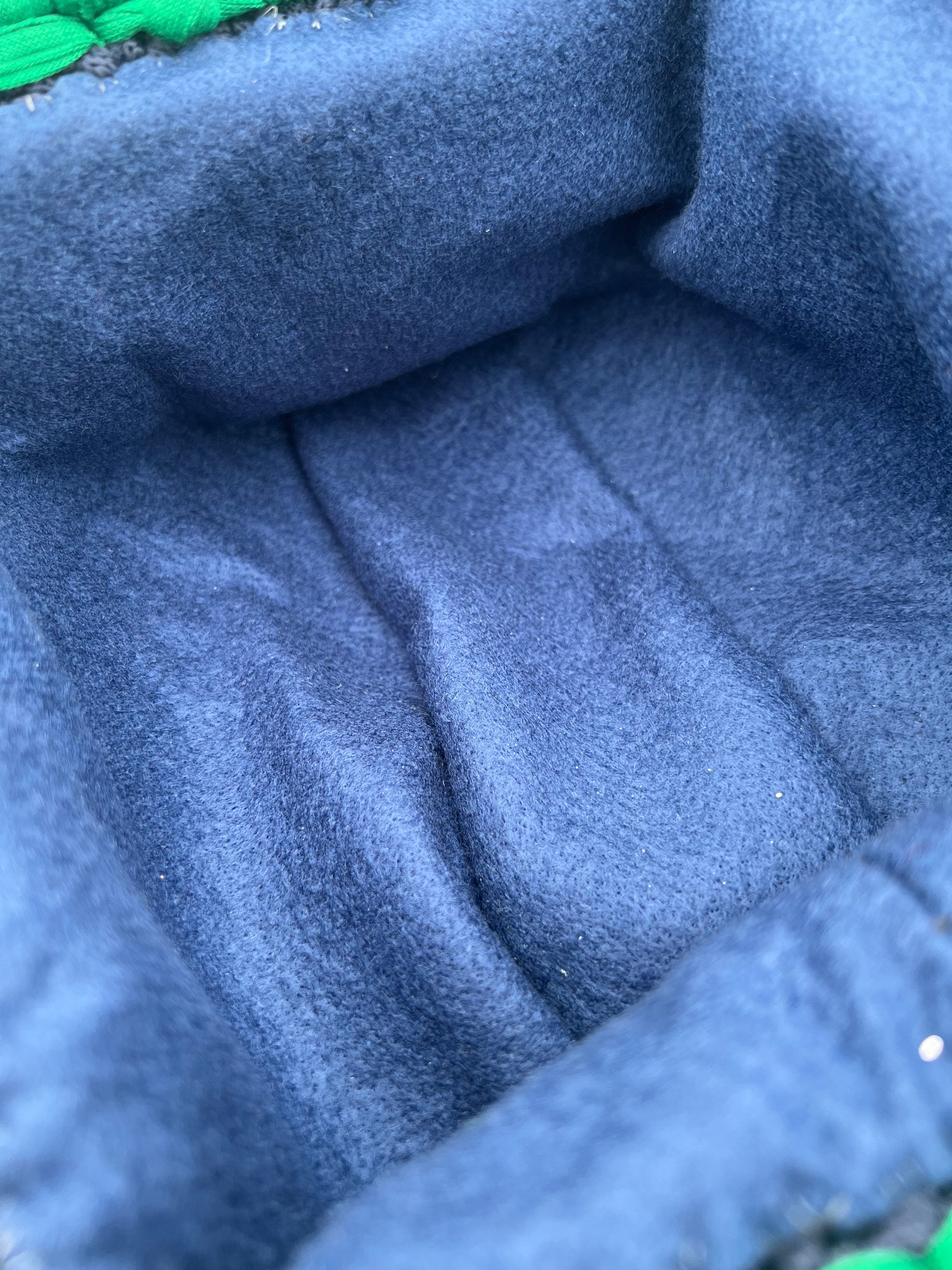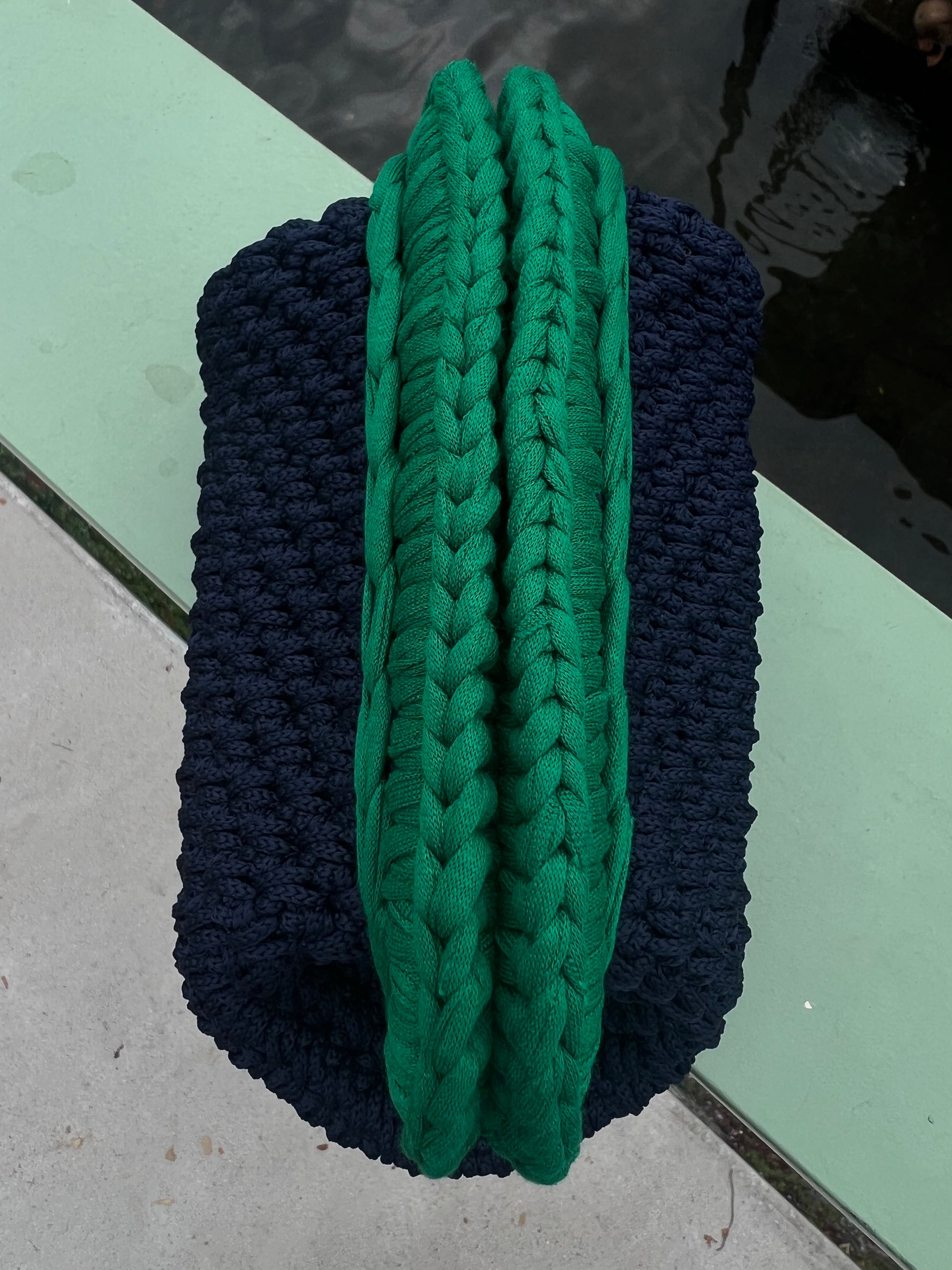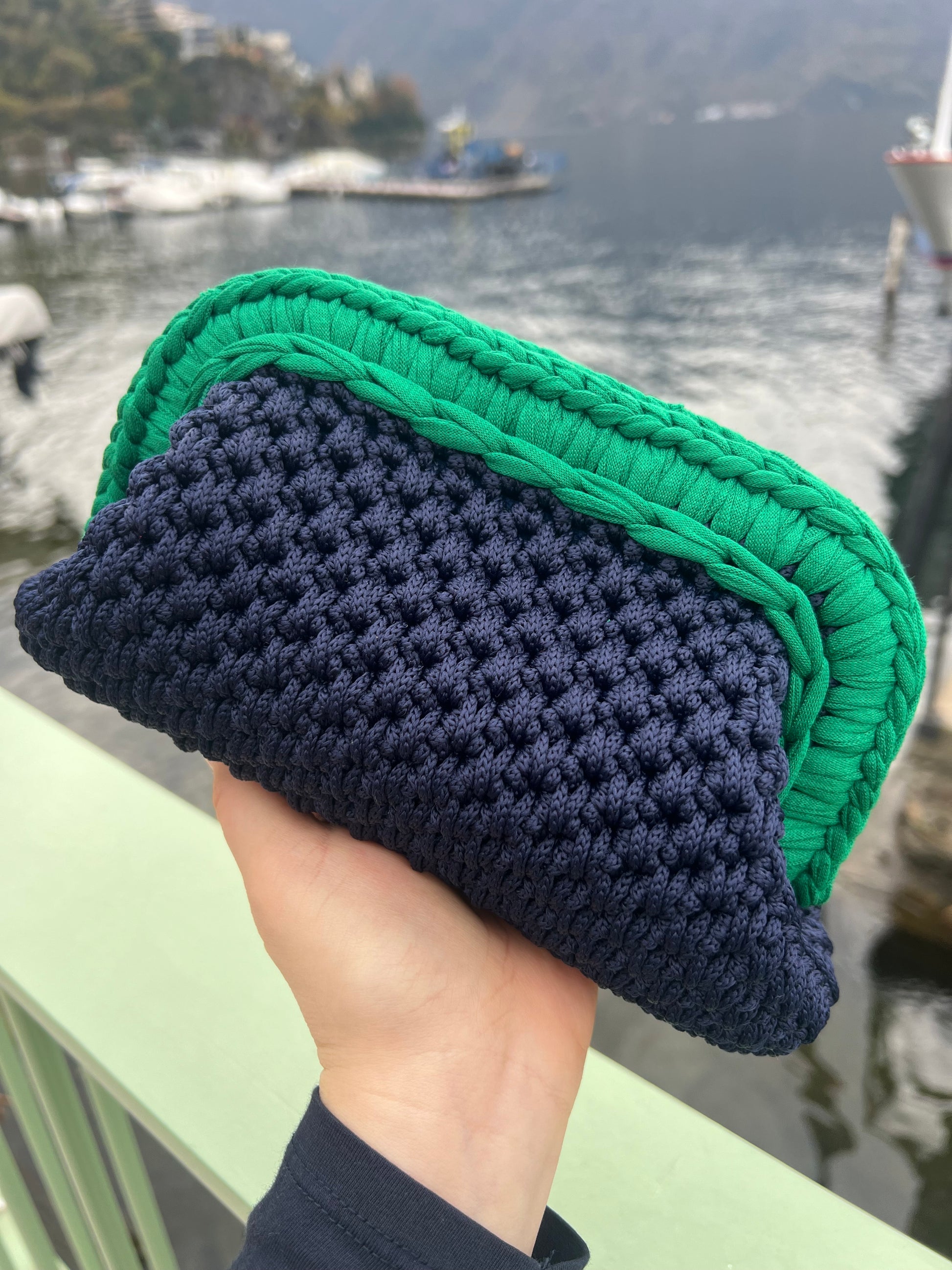 Clutch elegante in cordino di colore blu scuro, arricchita da un raffinato bordino in fettuccia di lycra verde che crea un contrasto sofisticato e moderno. Leggera e compatta, completamente foderata all’interno per proteggere i tuoi oggetti personali. Perfetta per aggiungere un tocco di colore e stile ai tuoi outfit serali o a look più formali, diventando un accessorio versatile e distintivo.