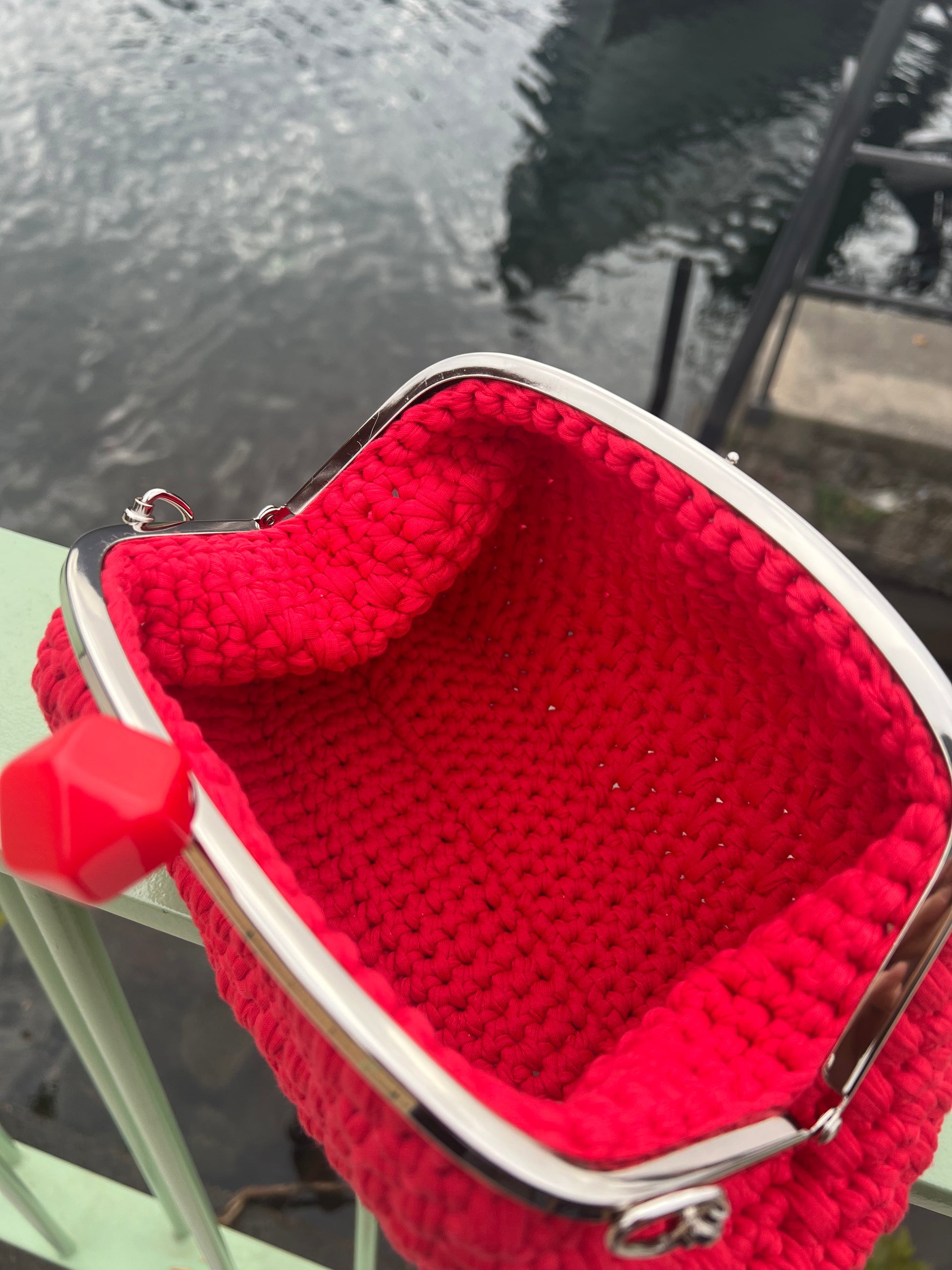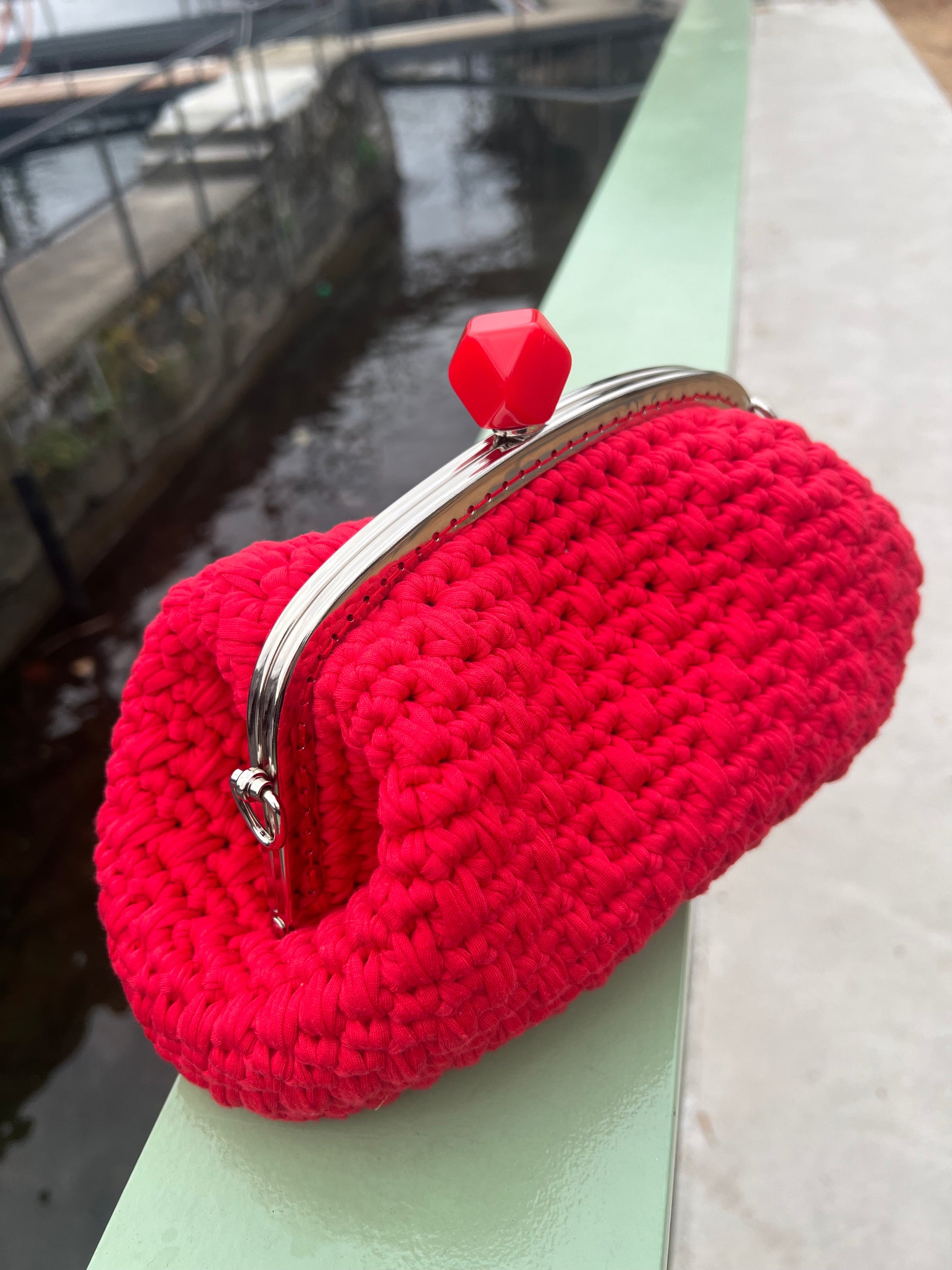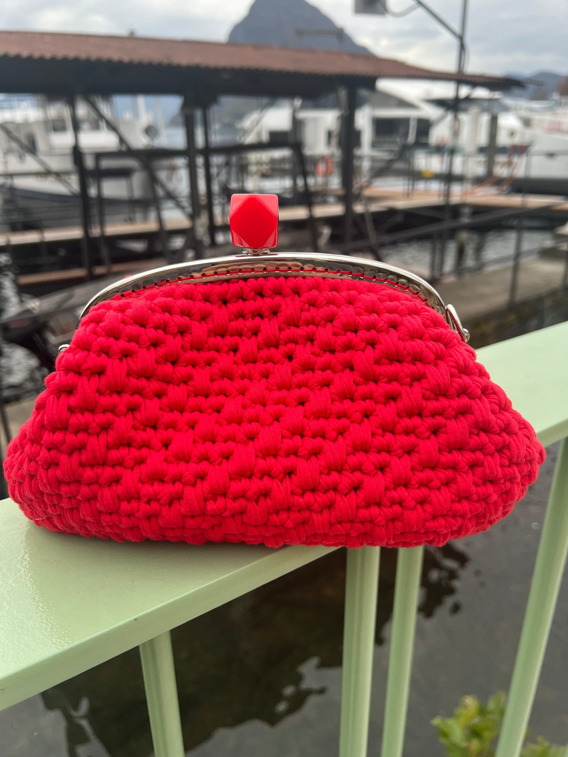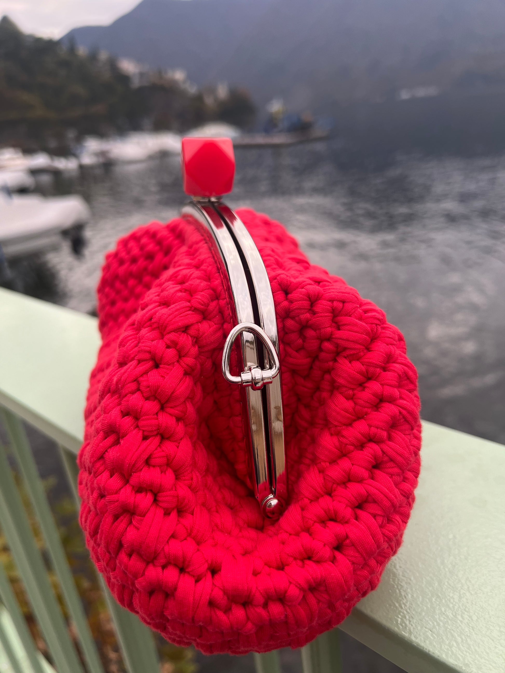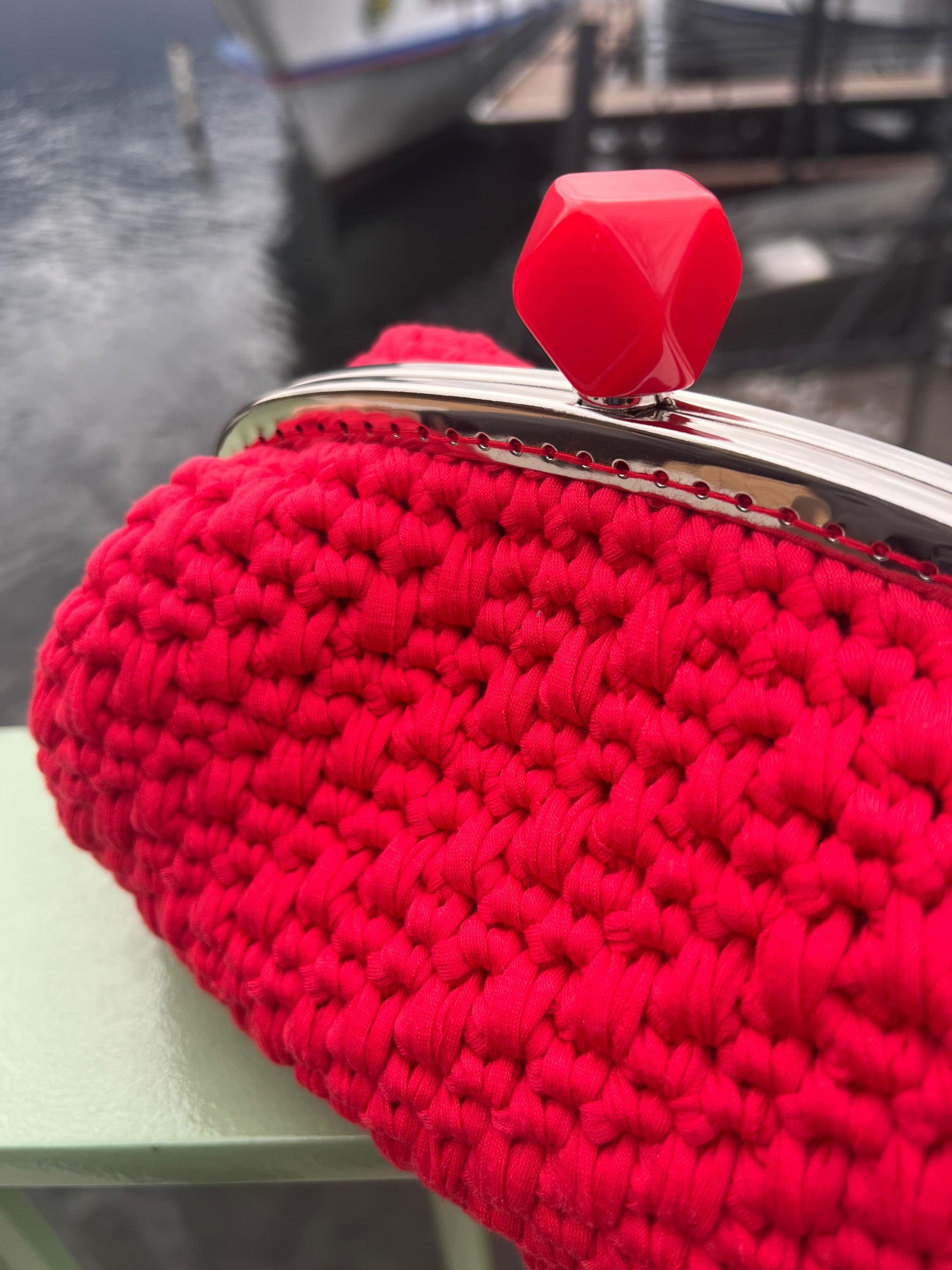 Clutch rossa dal design deciso e moderno, caratterizzata da un elegante pomello squadrato tono su tono e chiusura in metallo color argento.