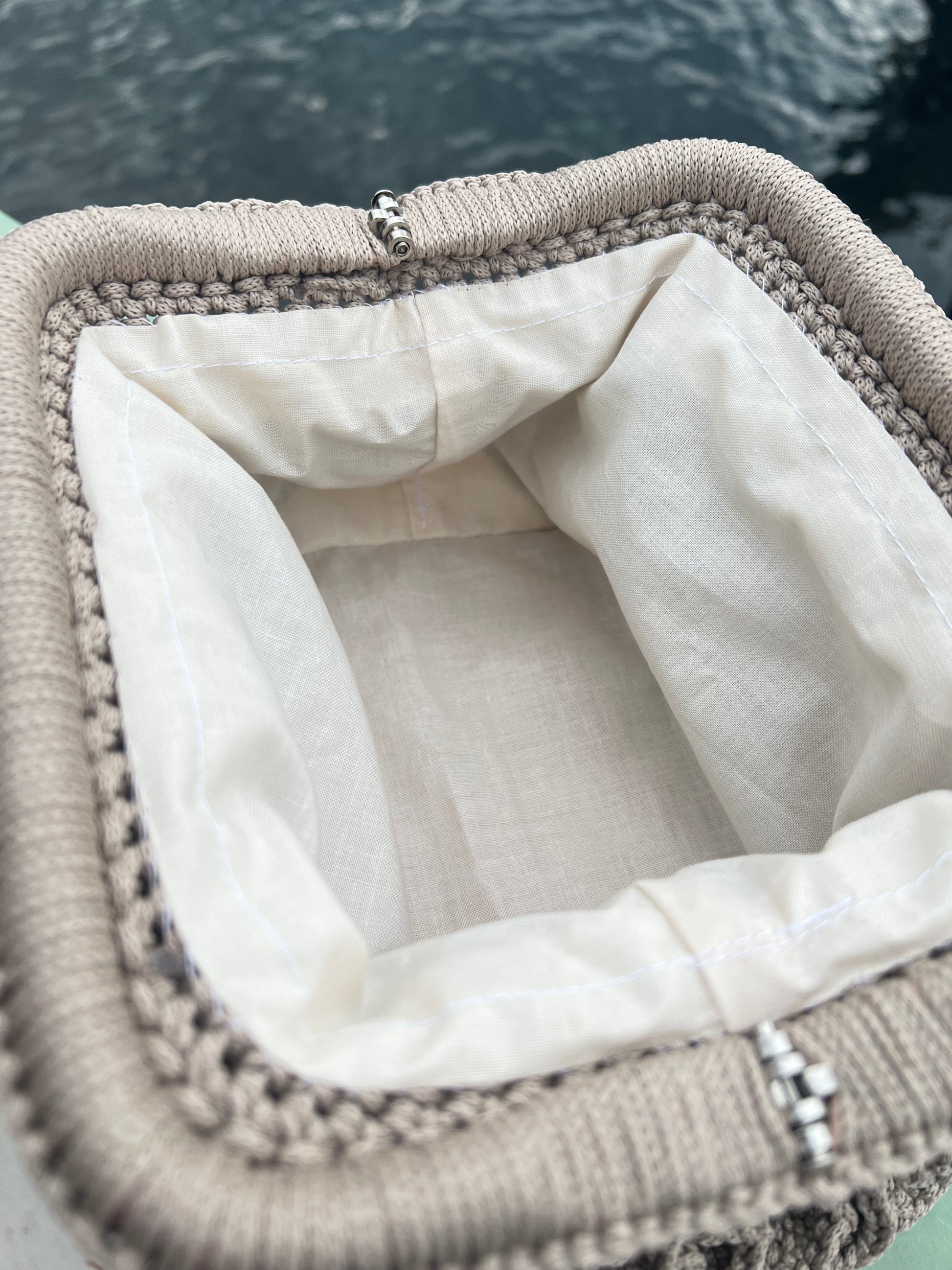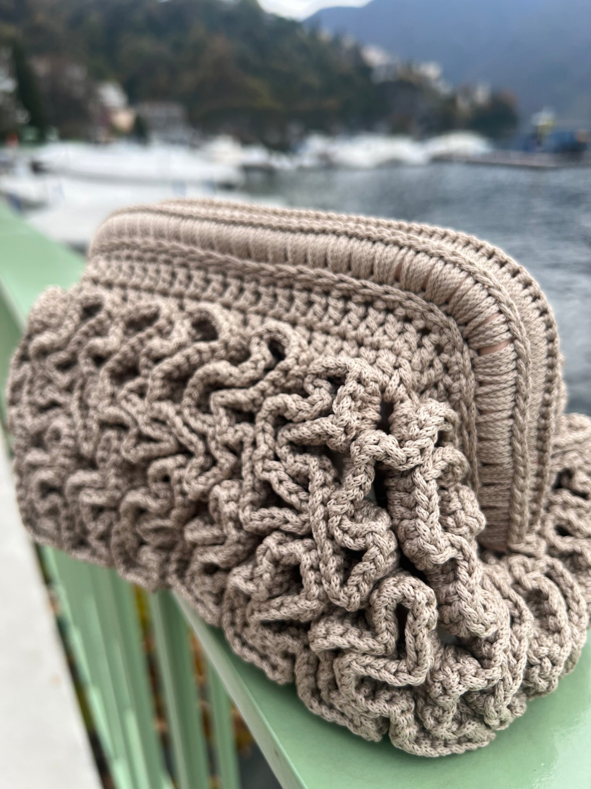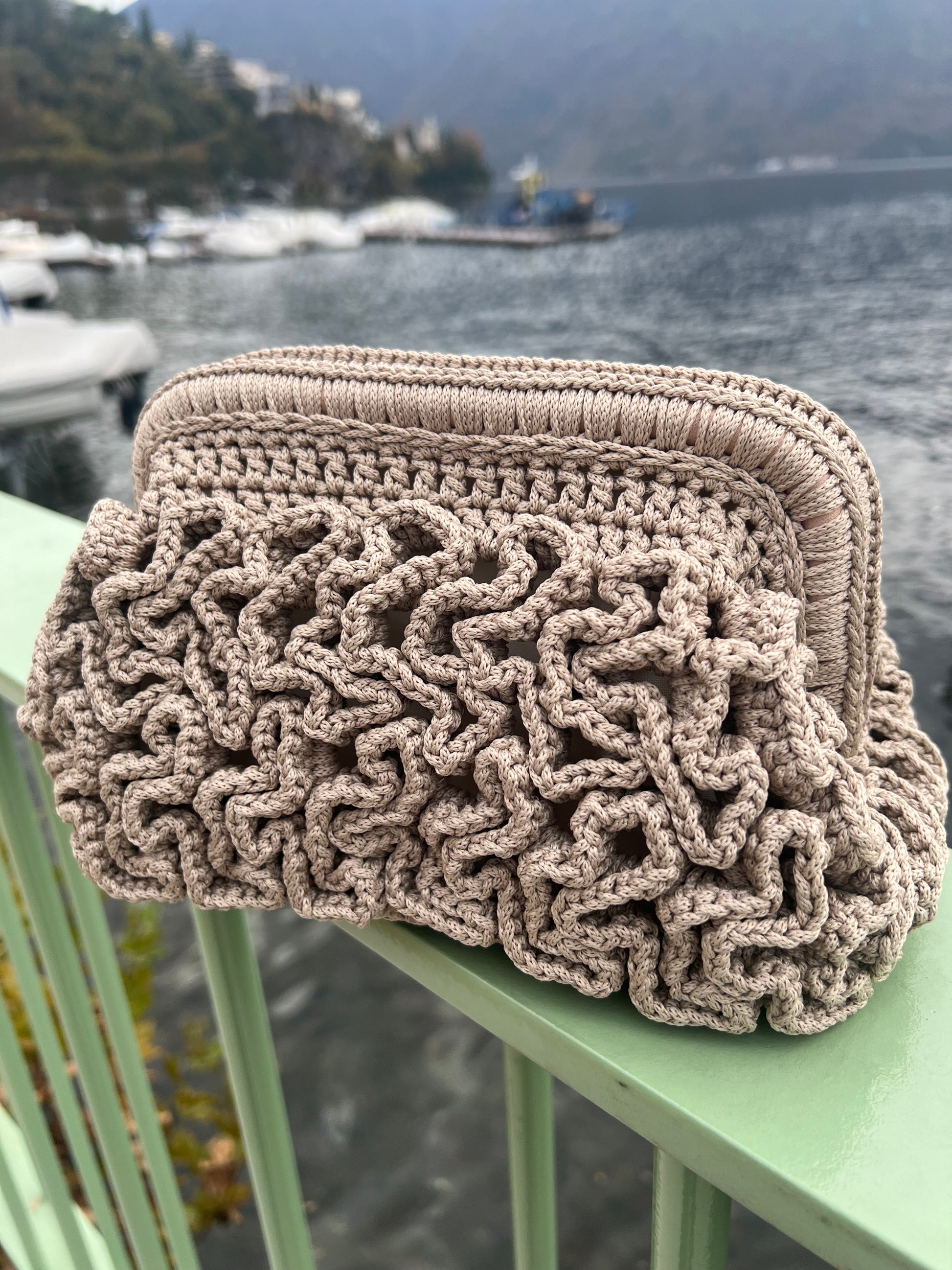 Clutch color avena realizzata in cordino con una lavorazione artigianale particolarmente complessa e originale.