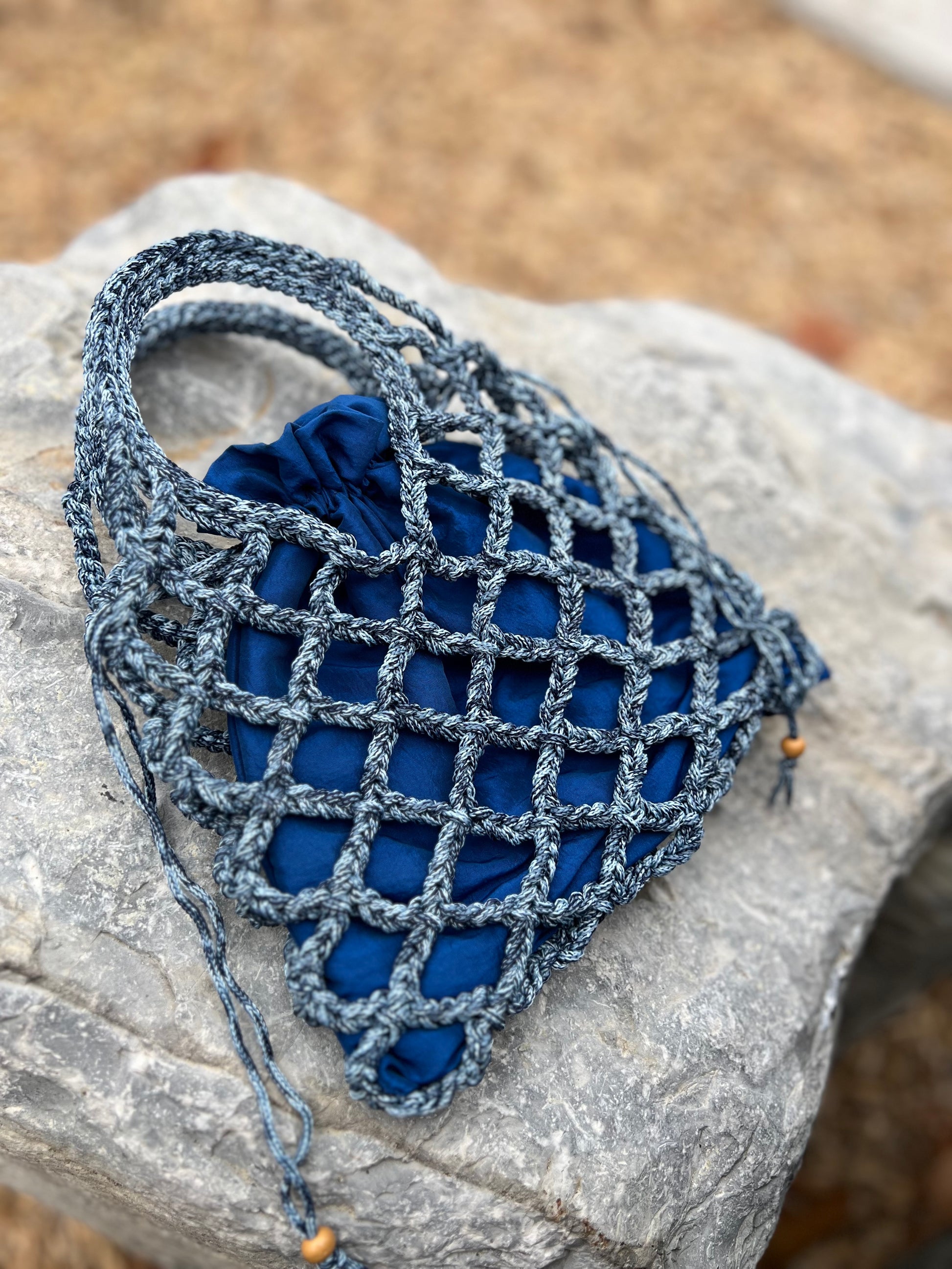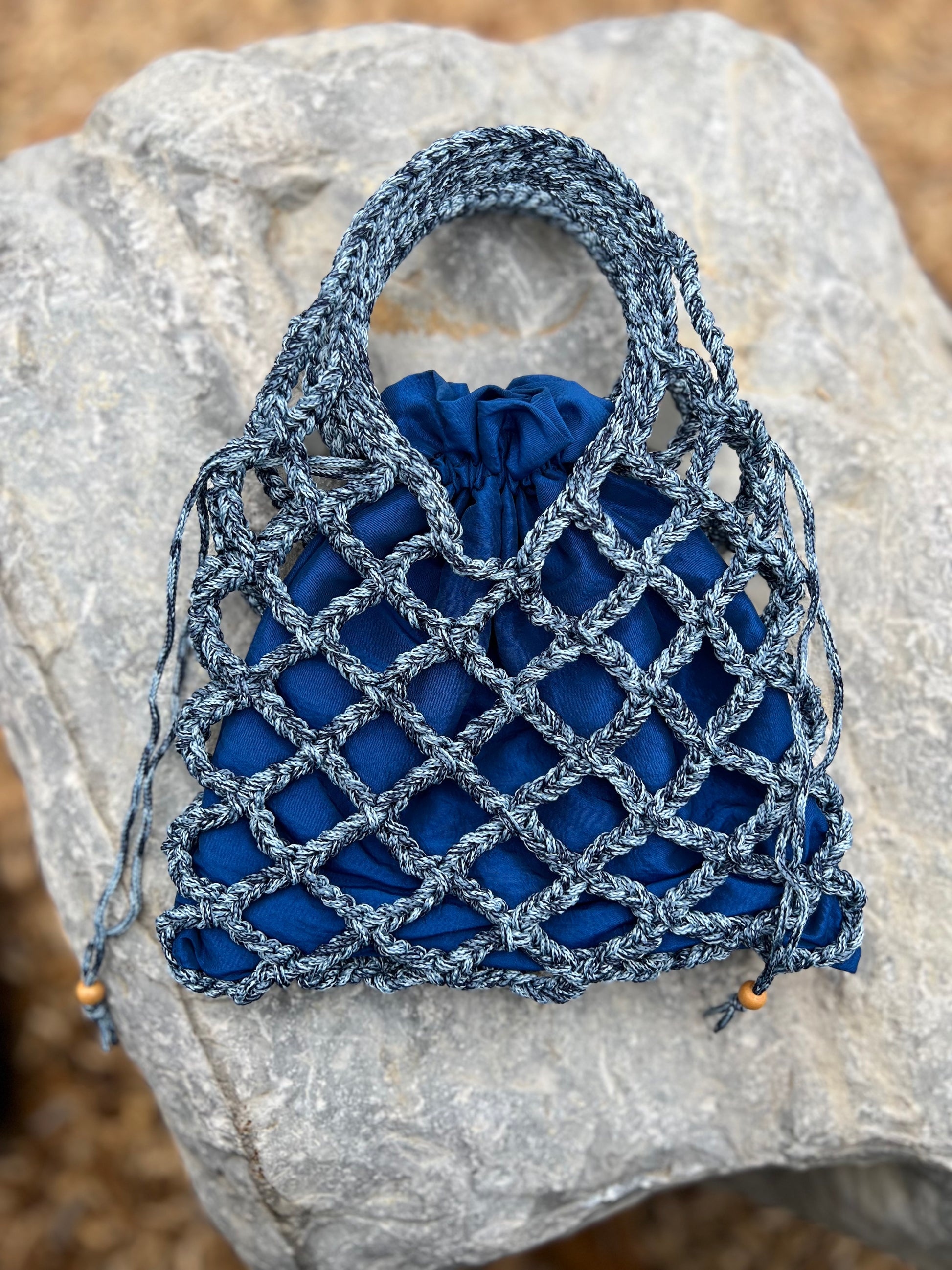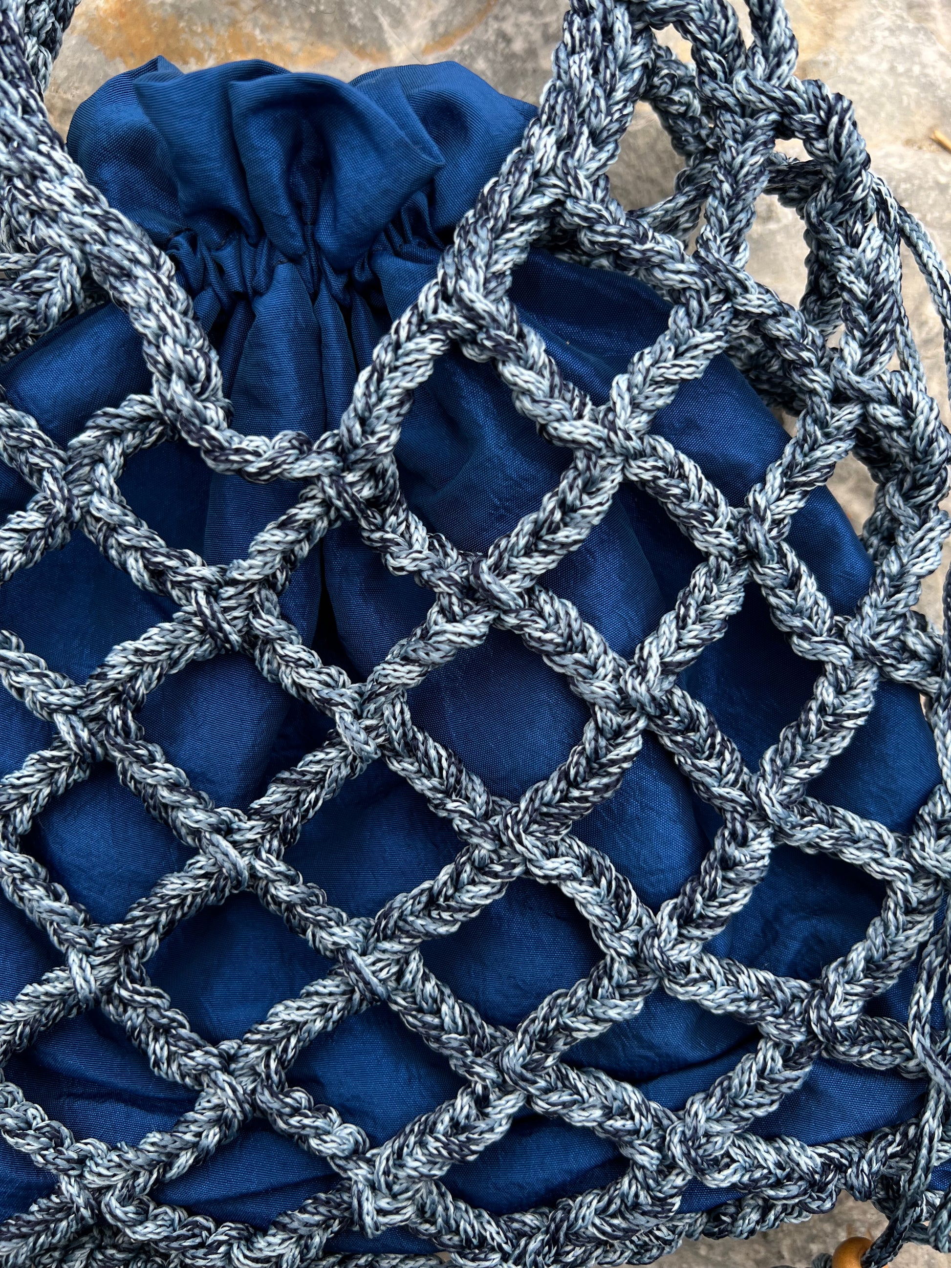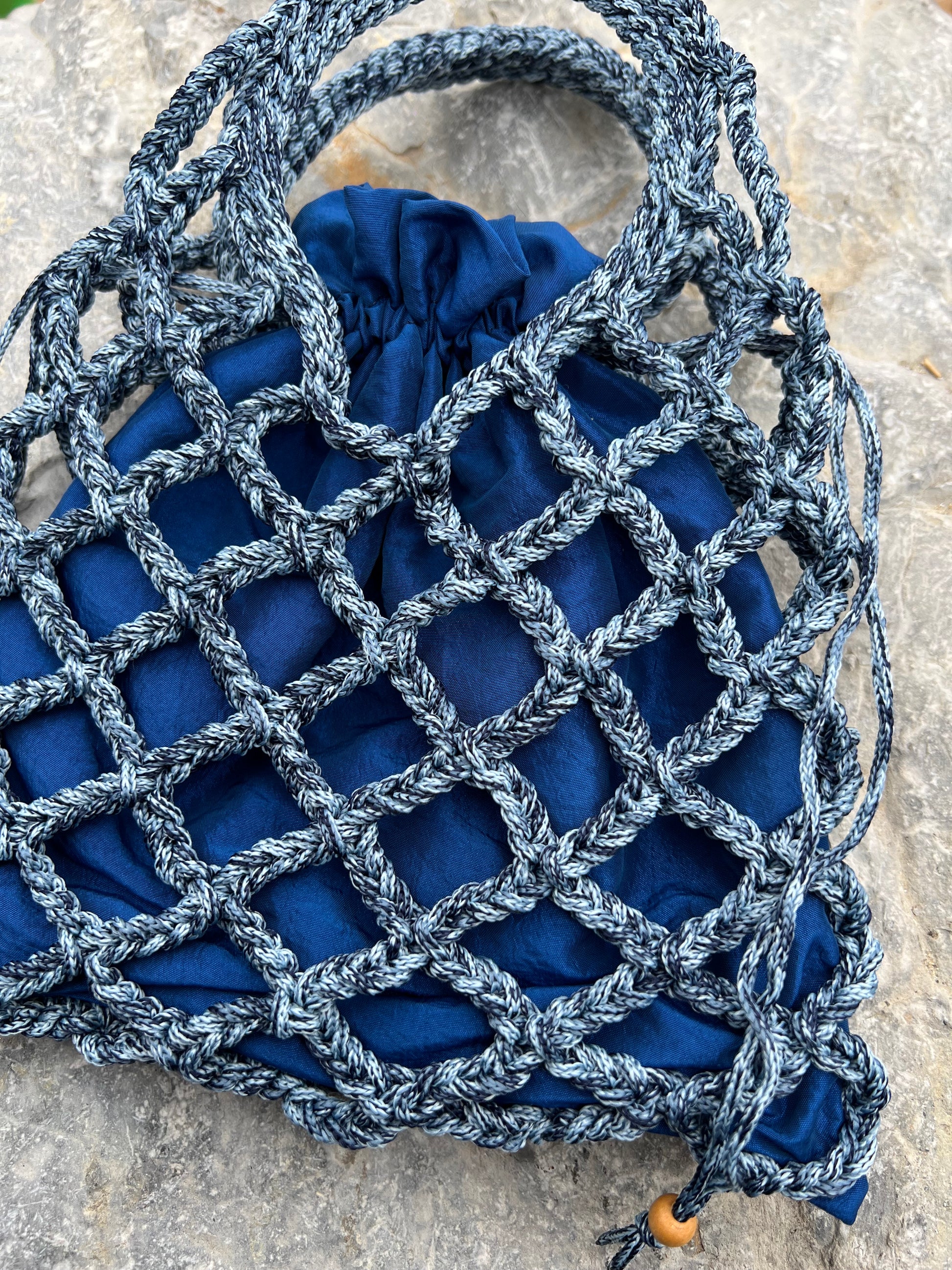 Borsa Lavy in stile rete, realizzata in cordino color Blue Mélange e pensata per essere trasportata a mano.