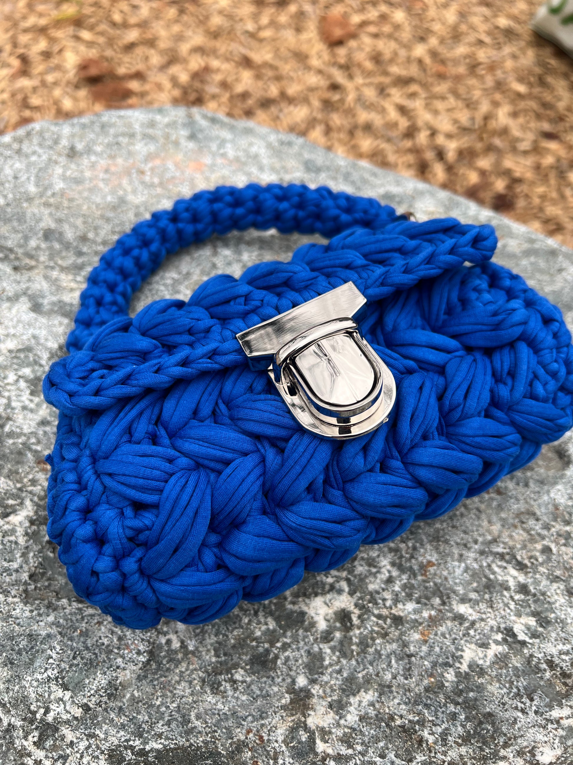 Borsa artigianale in crochet, realizzata in un vivace blu elettrico con lavorazione corposa e compatta.