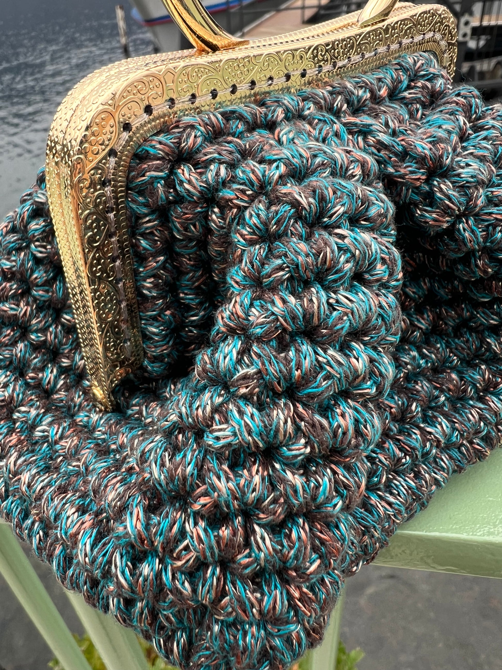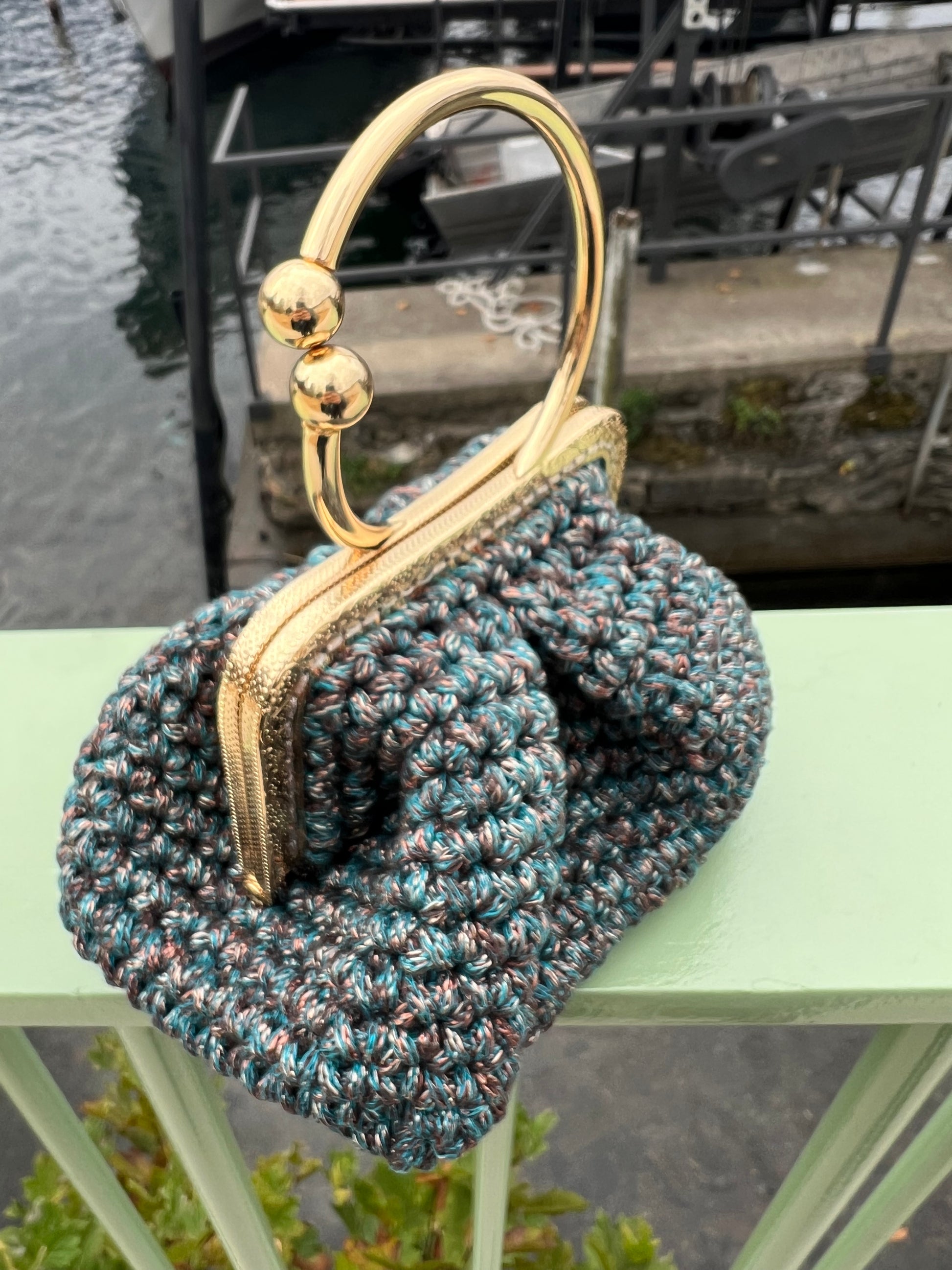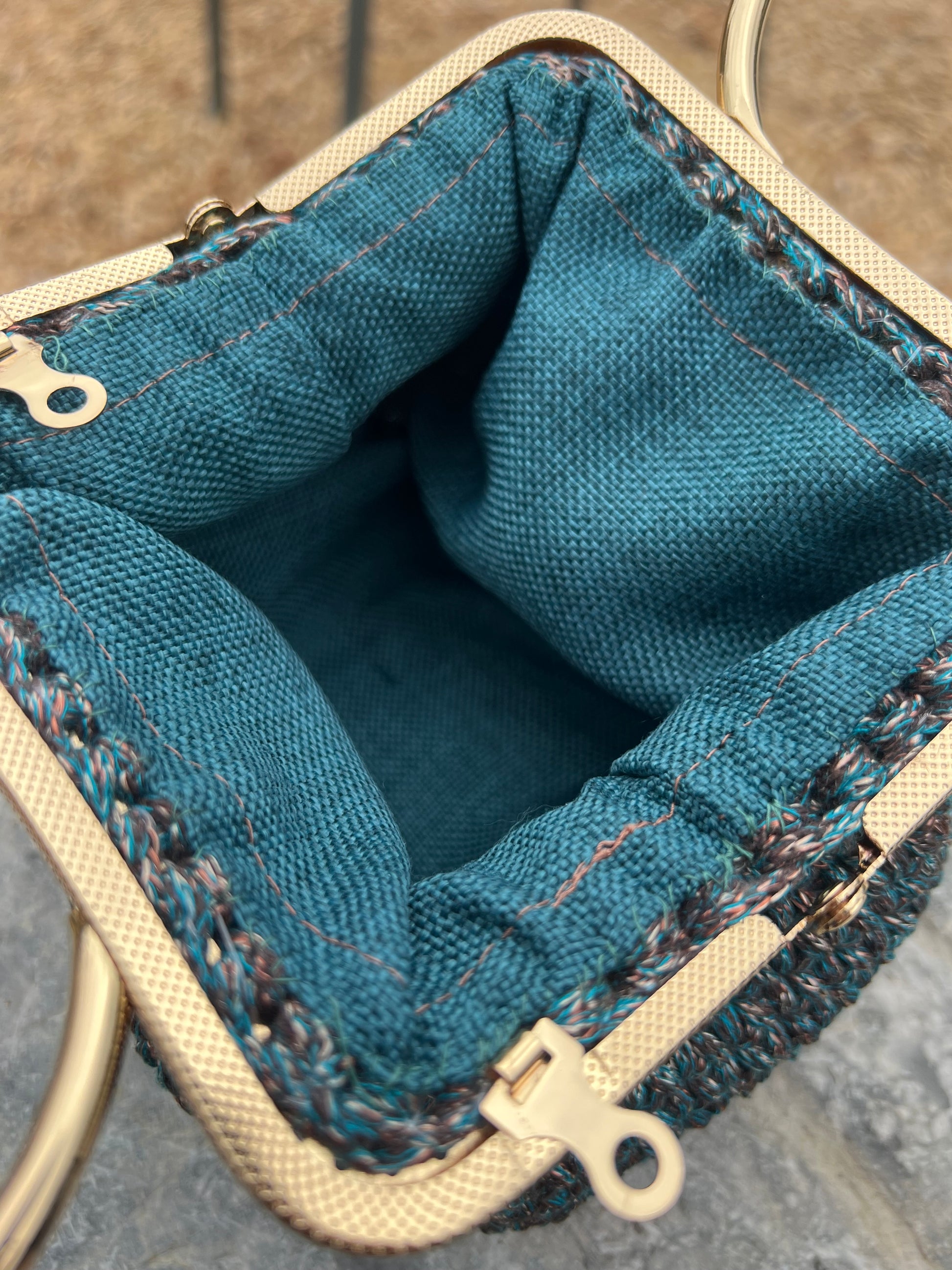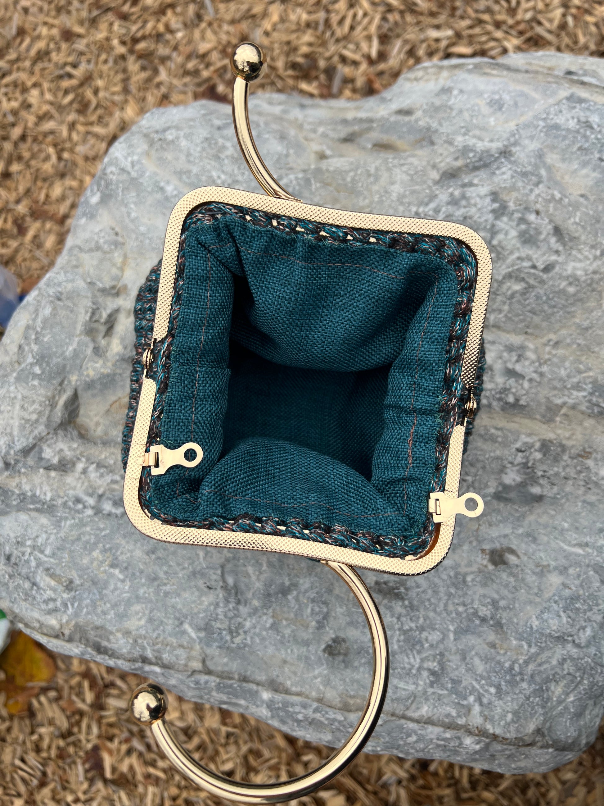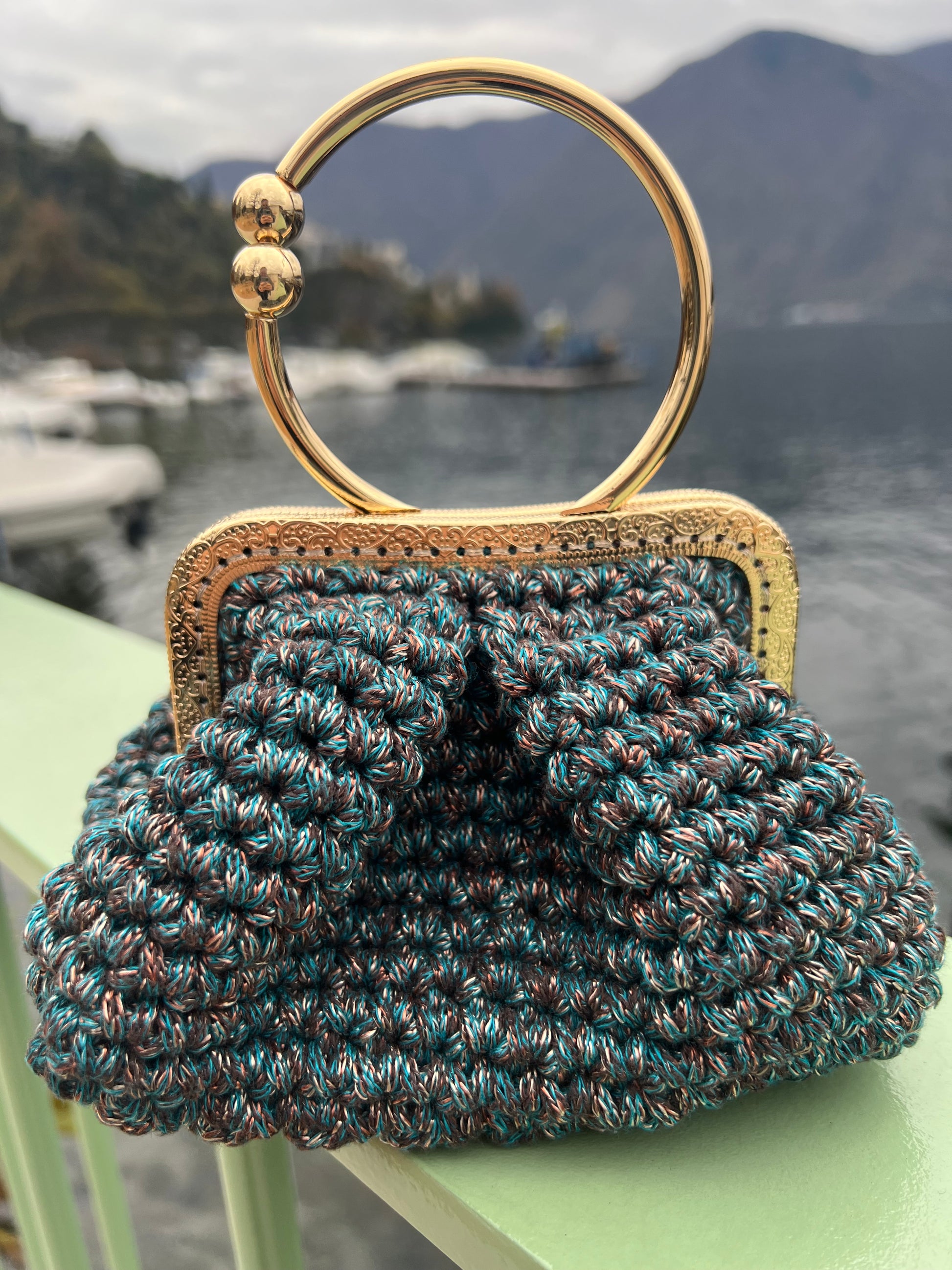 Borsa elegante in cordino nelle tonalità ottanio e rame melange, caratterizzata da una chiusura in oro a cerchio decorato con due sfere che ne completano il design.