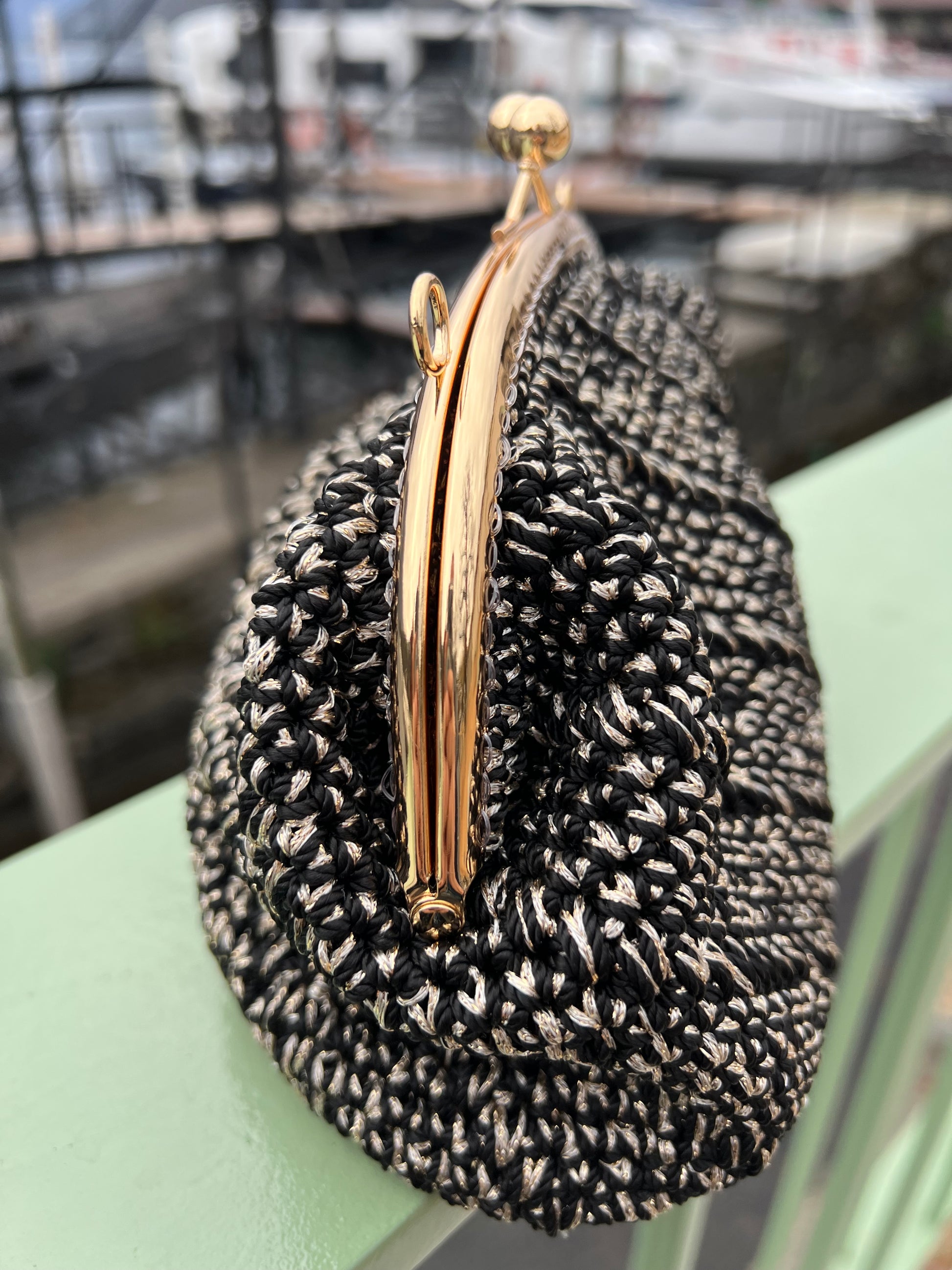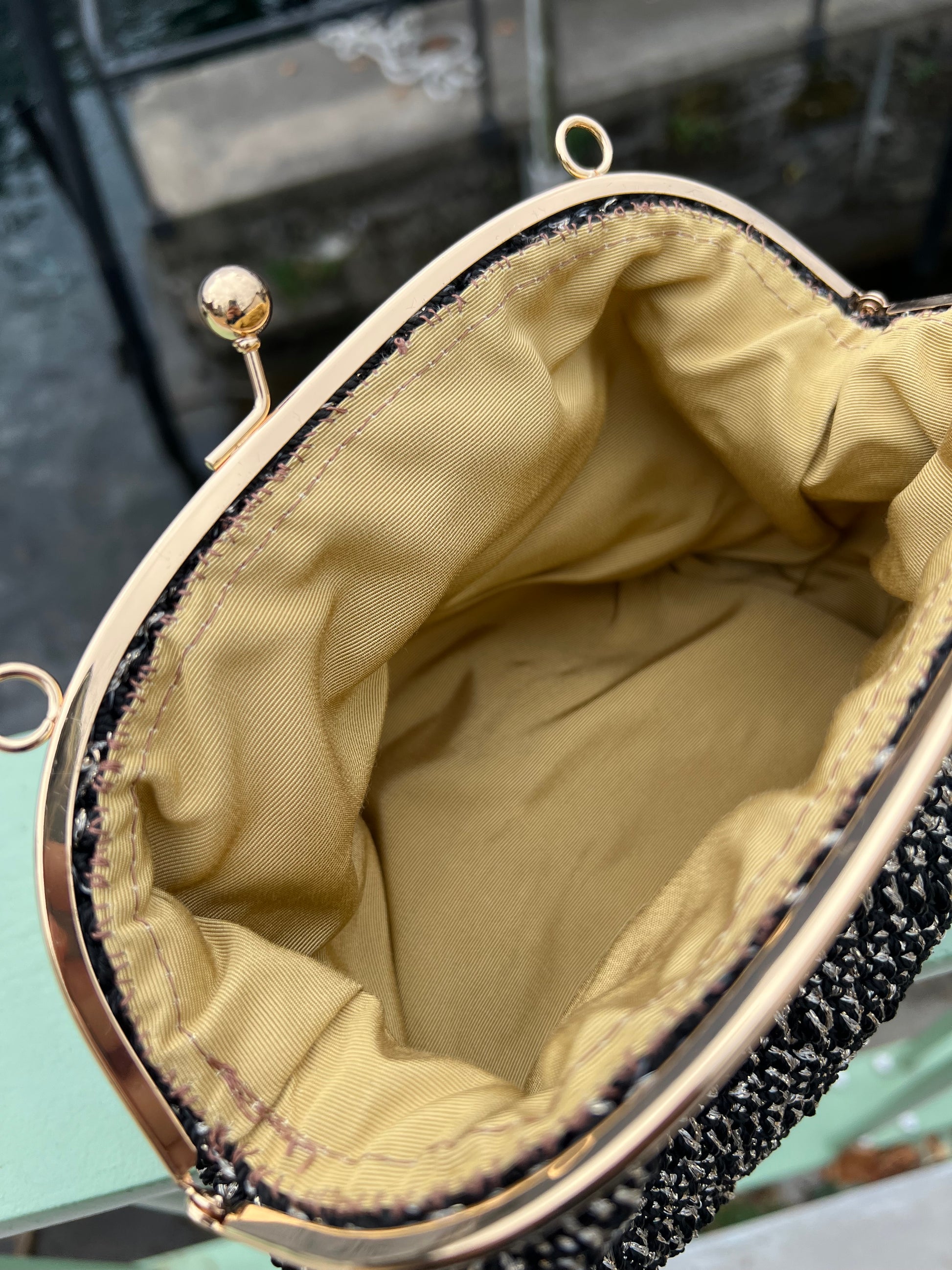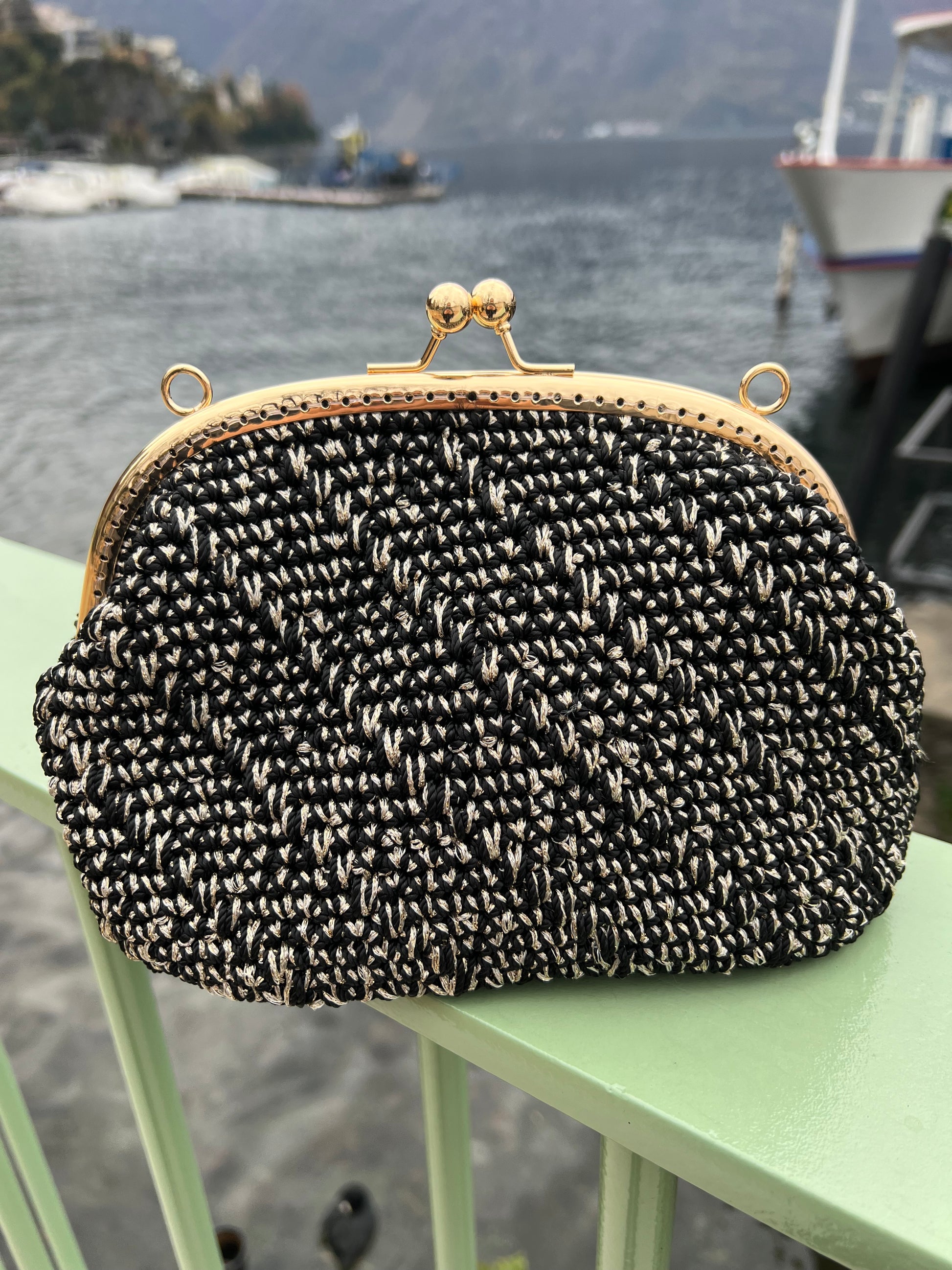 Clutch nera realizzata con fili oro intrecciati, elegante e sofisticata, perfetta per le serate più raffinate. La chiusura in metallo dorato con meccanismo clic-clac assicura praticità e sicurezza, mentre l’interno foderato aggiunge un tocco di lusso e protezione per i tuoi oggetti. Può essere indossata da sola a mano o trasformata in una borsa a tracolla grazie ai pratici ganci già presenti, abbinando la tracolla color oro per un look ancora più chic.