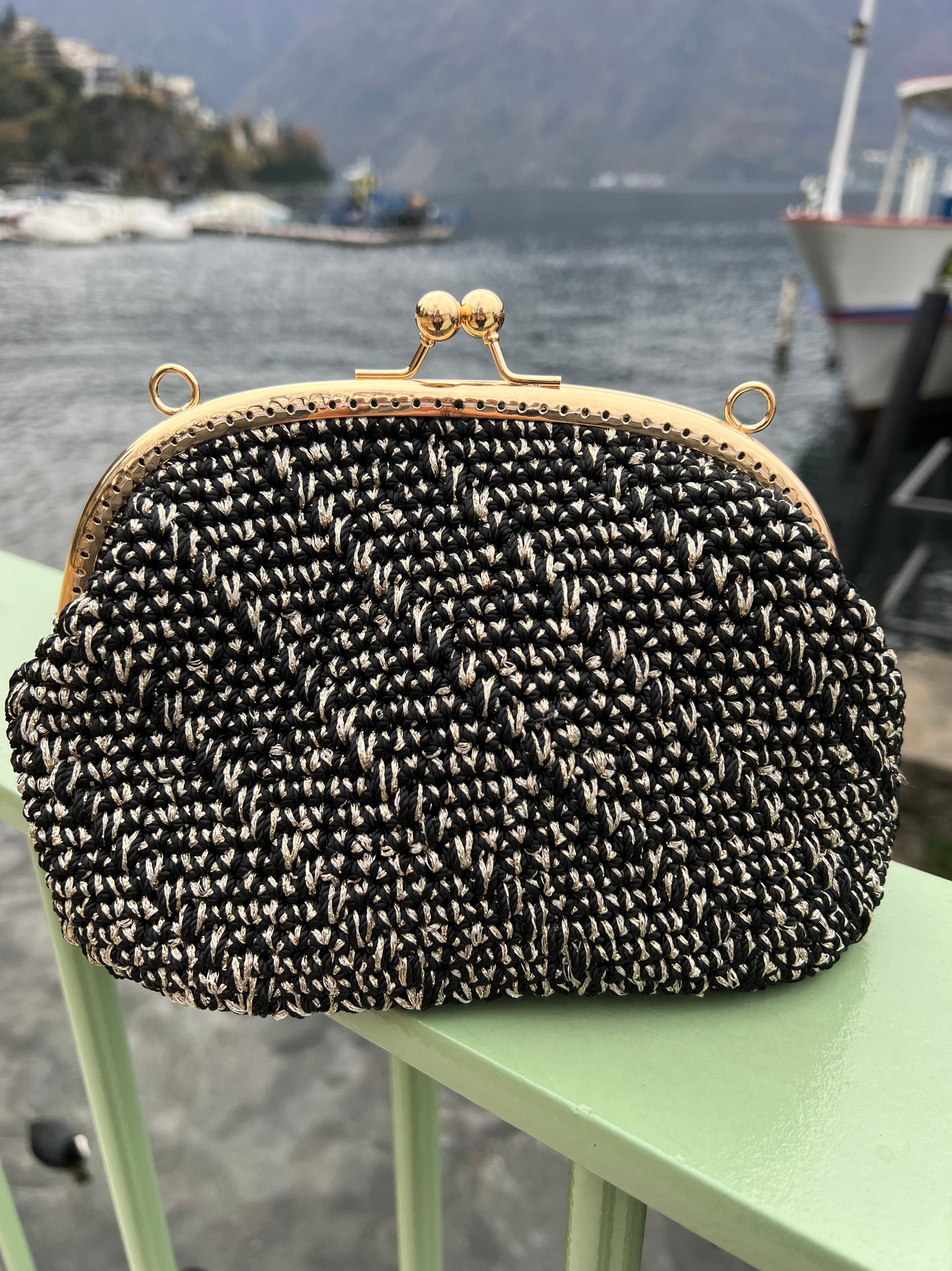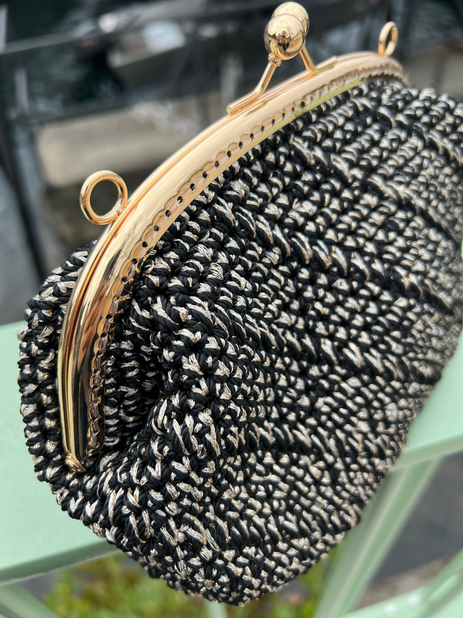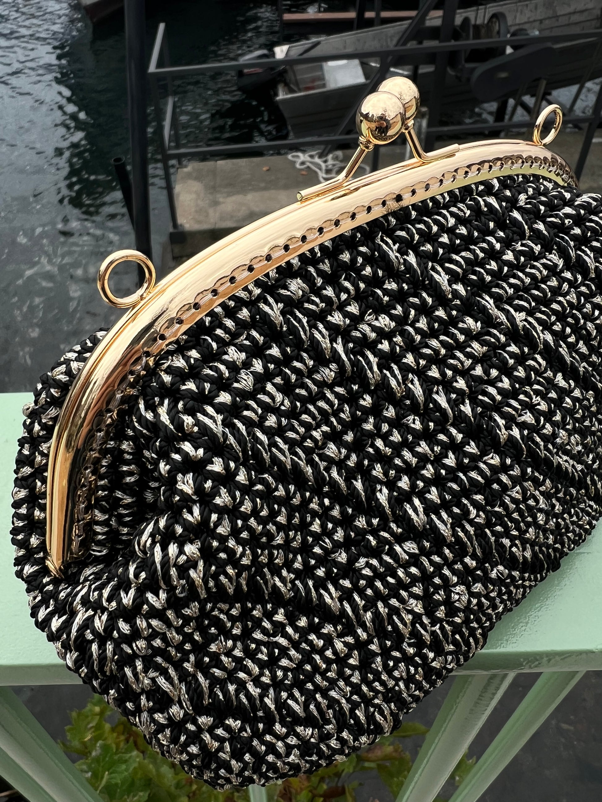 Clutch nera realizzata con fili oro intrecciati, elegante e sofisticata, perfetta per le serate più raffinate. La chiusura in metallo dorato con meccanismo clic-clac assicura praticità e sicurezza, mentre l’interno foderato aggiunge un tocco di lusso e protezione per i tuoi oggetti. Può essere indossata da sola a mano o trasformata in una borsa a tracolla grazie ai pratici ganci già presenti, abbinando la tracolla color oro per un look ancora più chic.