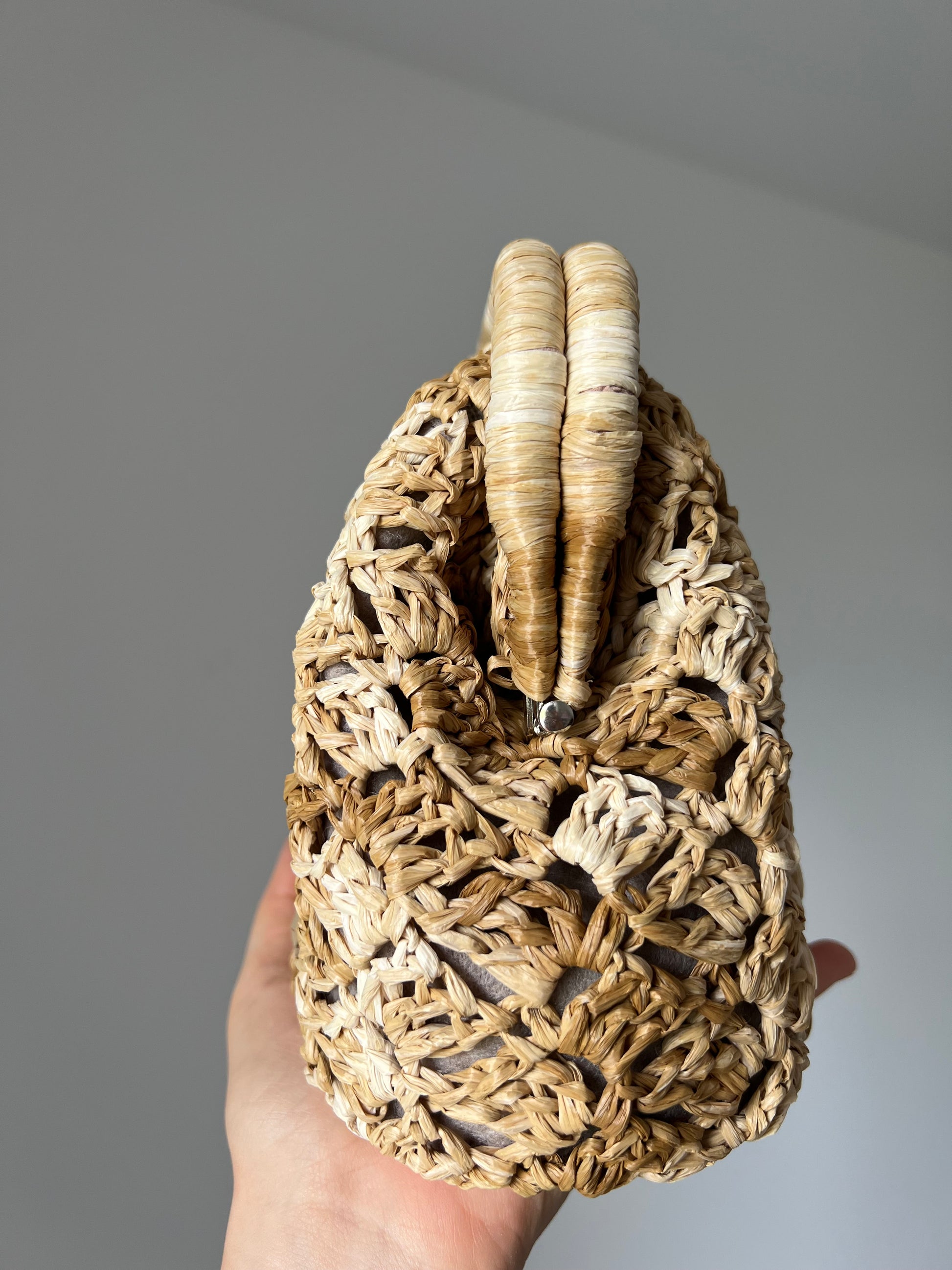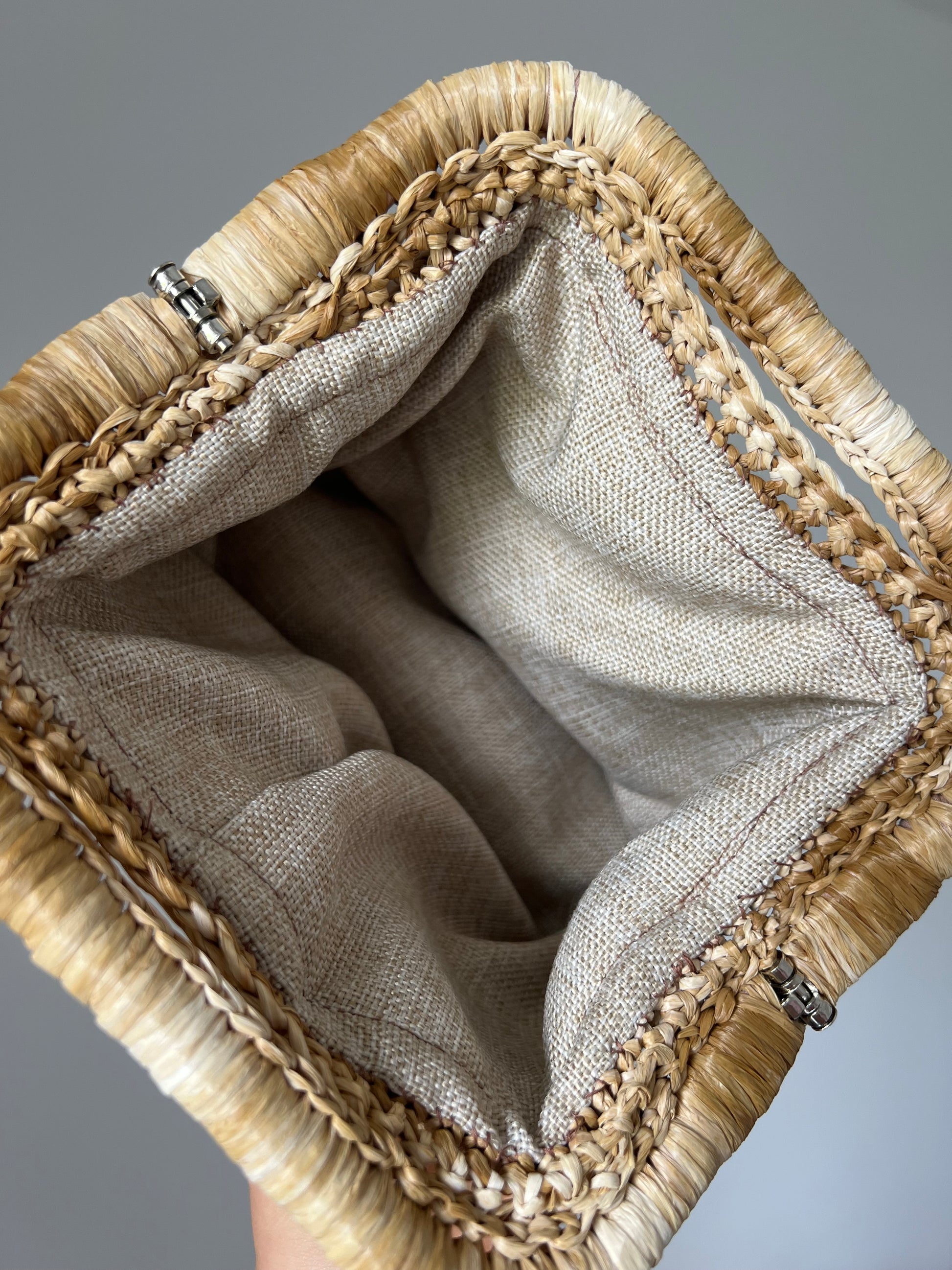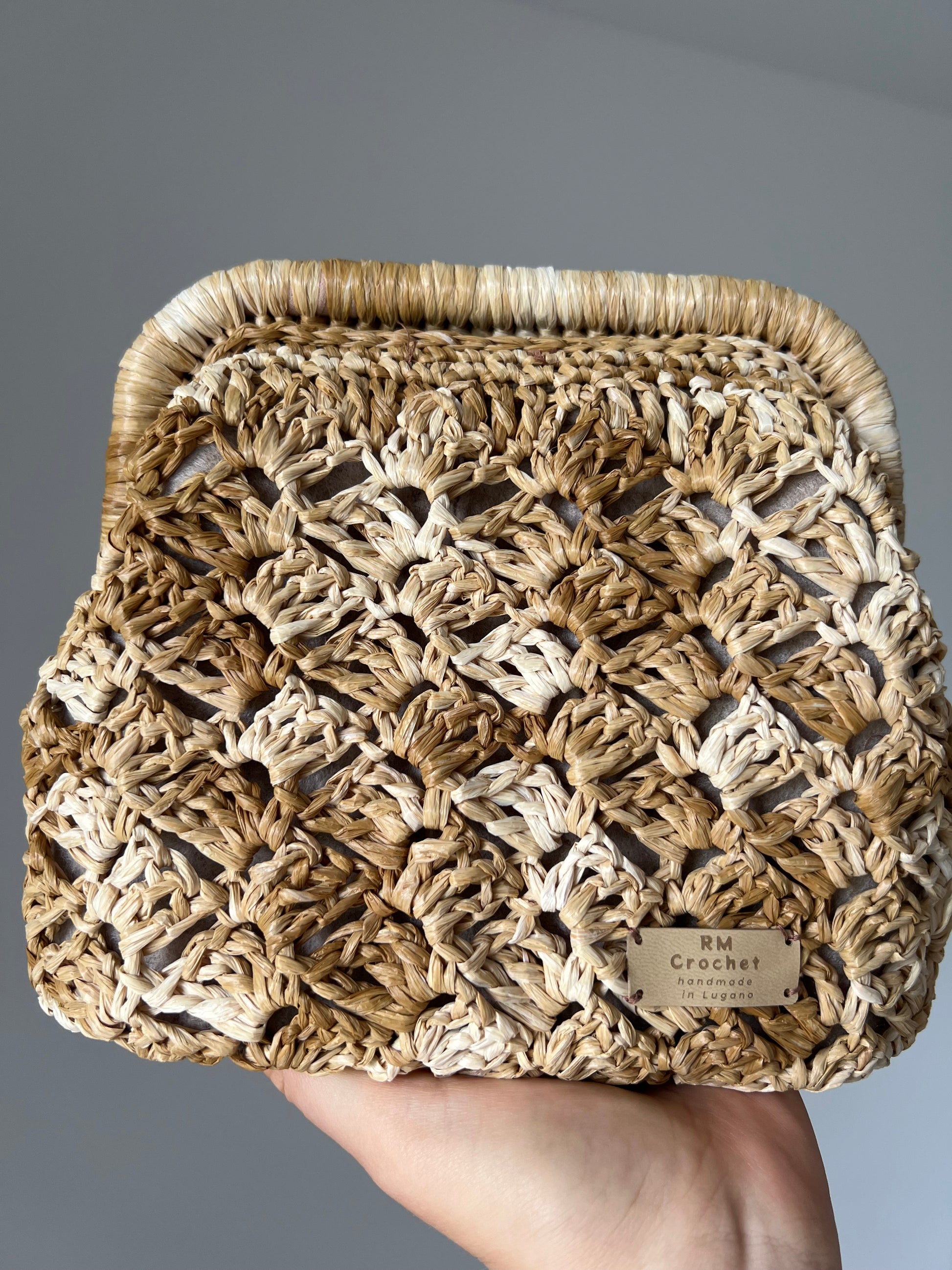 Meravigliosa clutch in Rafia: morbida, leggera, foderata all’interno e con un disegno splendido. Un accessorio che si abbina ad ogni outfit grazie ai toni neutri e caldi.