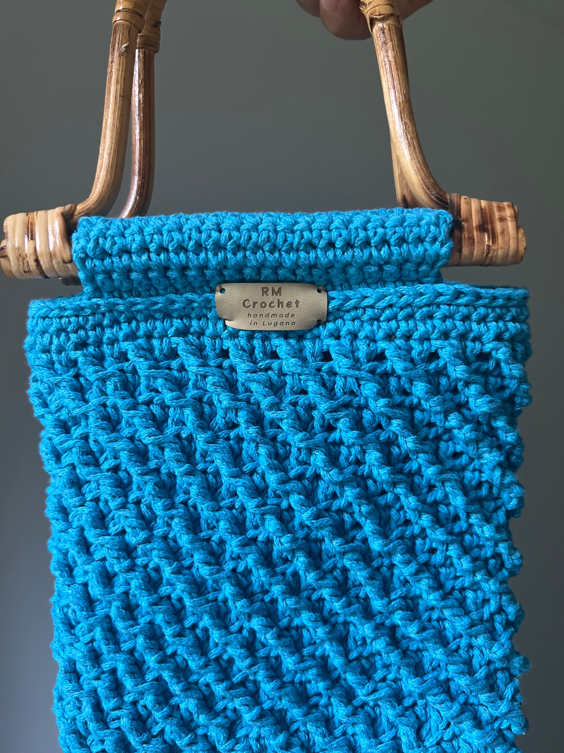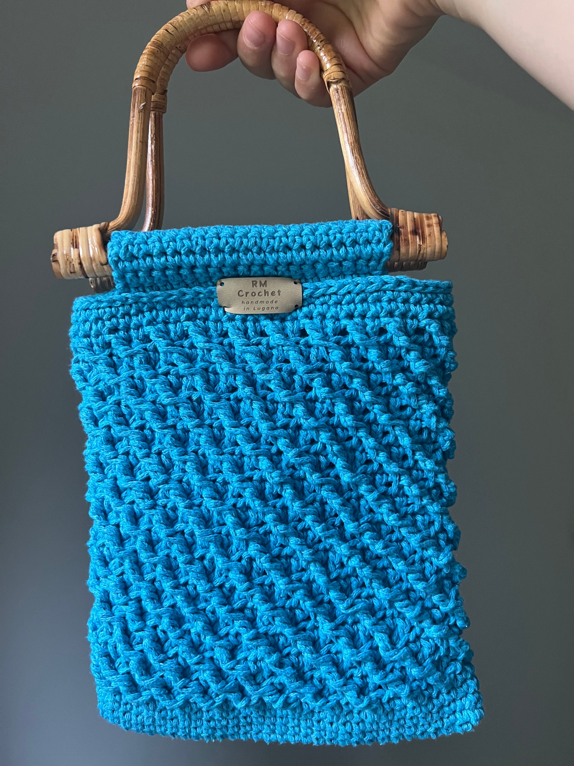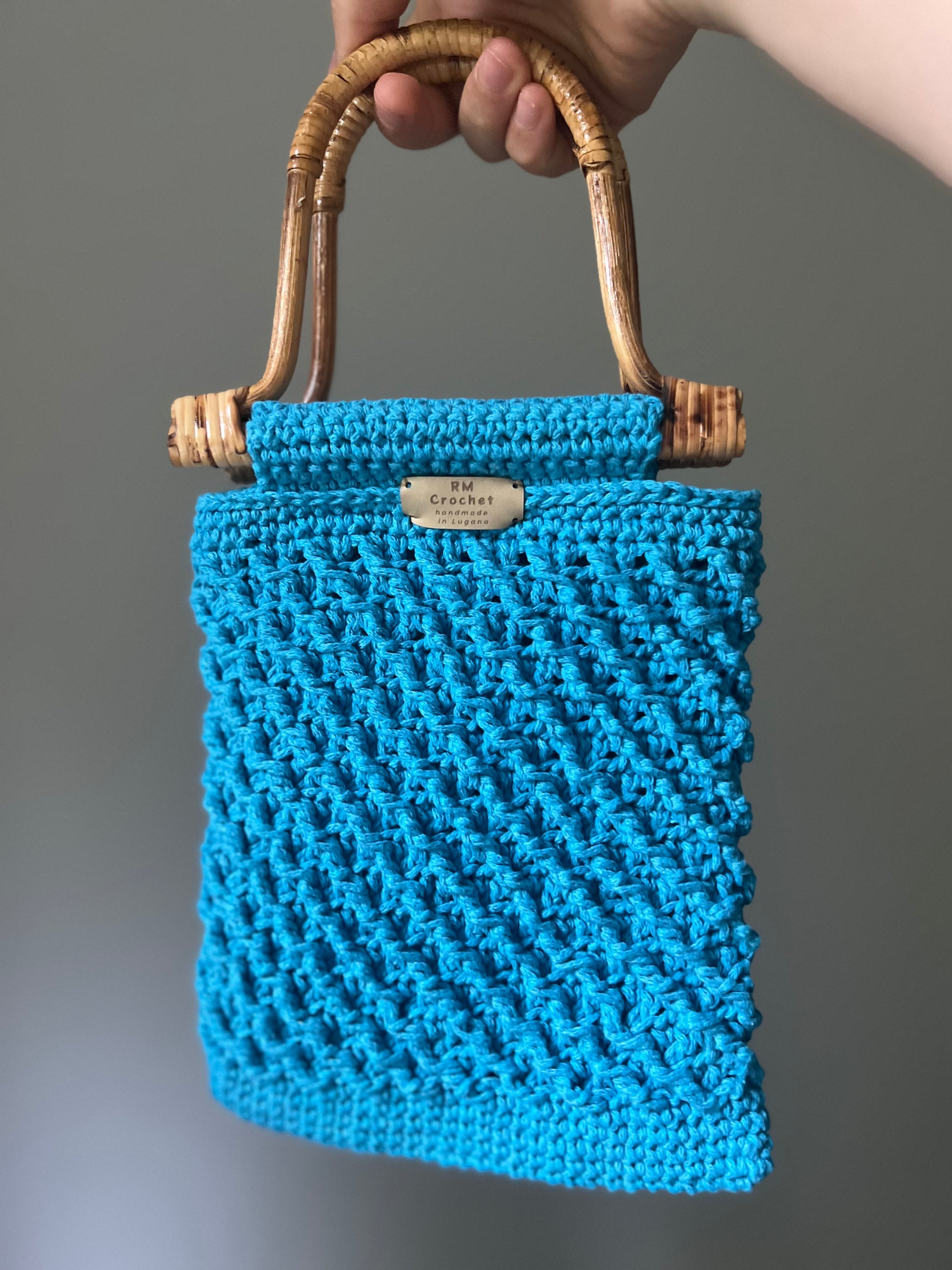 Ispirata alle handbags dei più famosi brand di lusso, la nostra borsa ha manici in bambù ed è realizzata con filato in cotone di colore turchese.