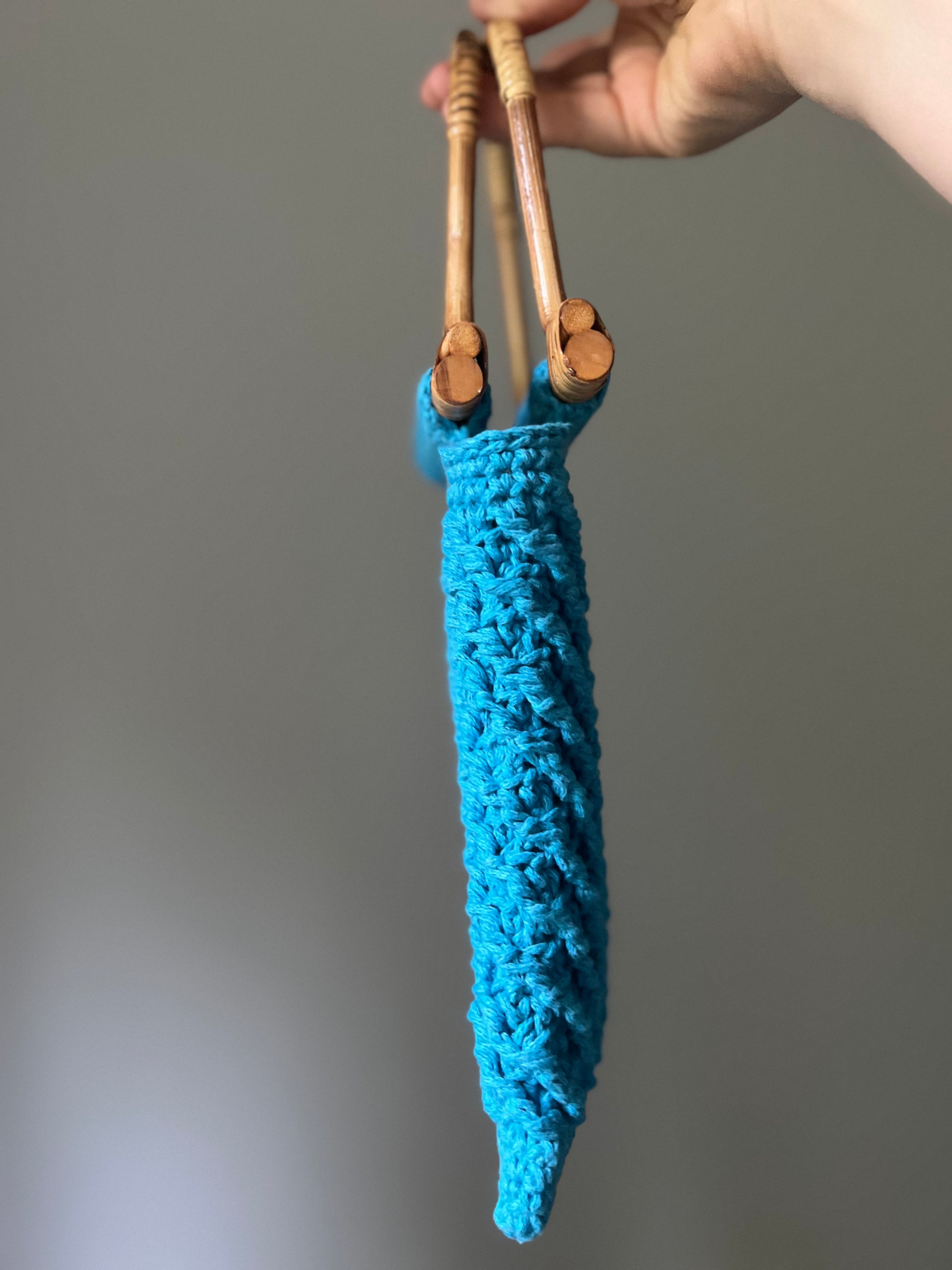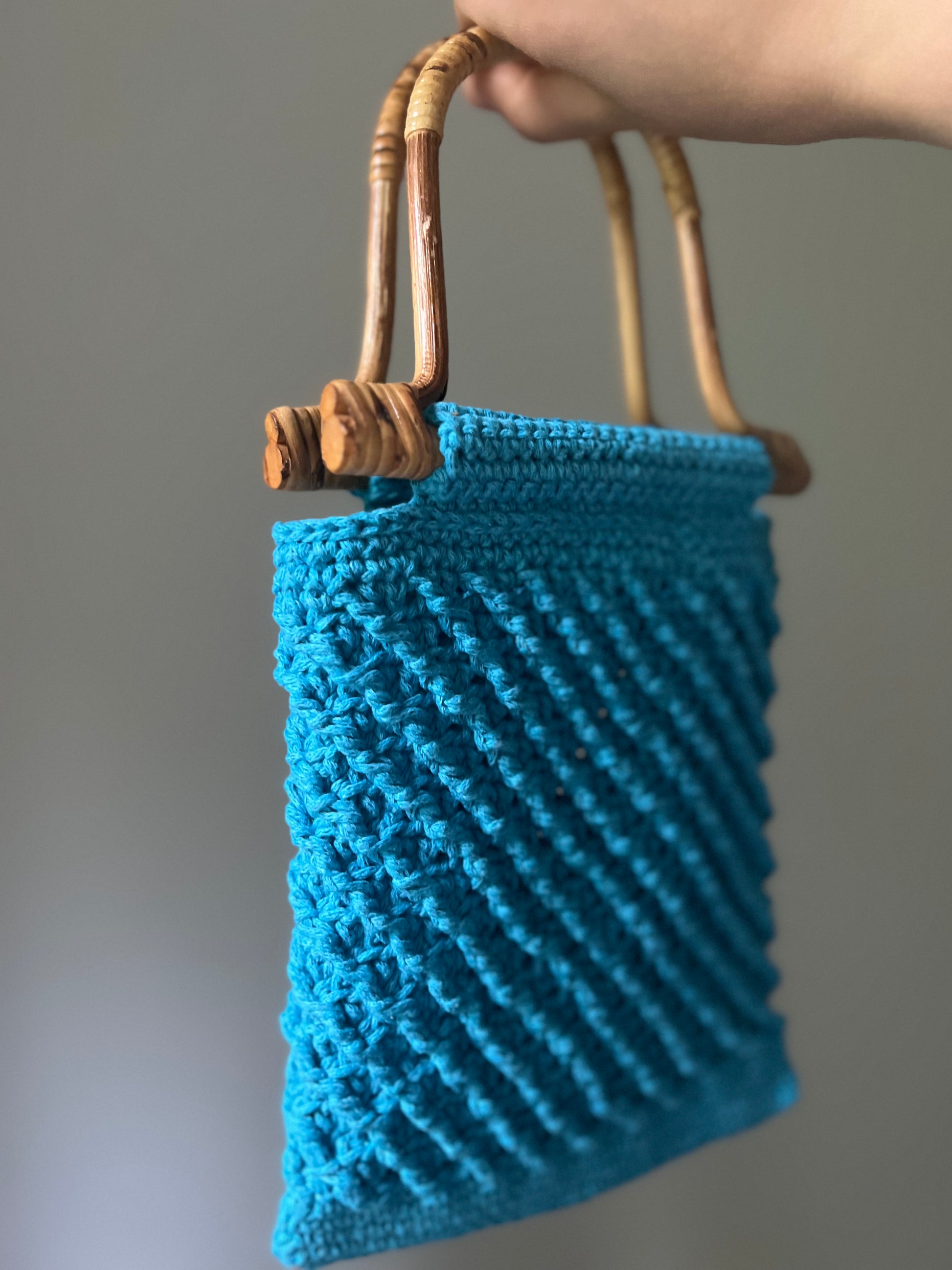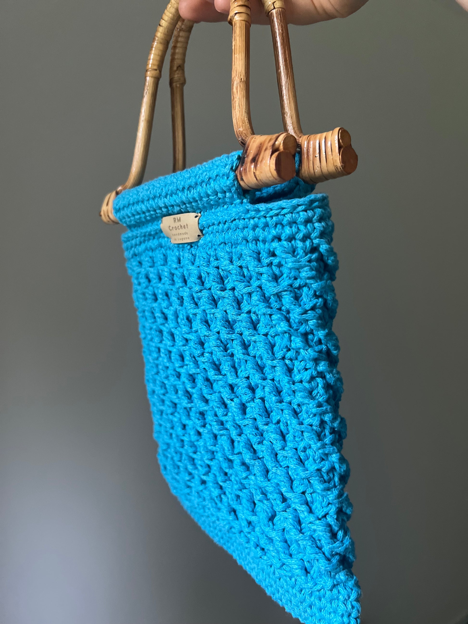 Ispirata alle handbags dei più famosi brand di lusso, la nostra borsa ha manici in bambù ed è realizzata con filato in cotone di colore turchese.