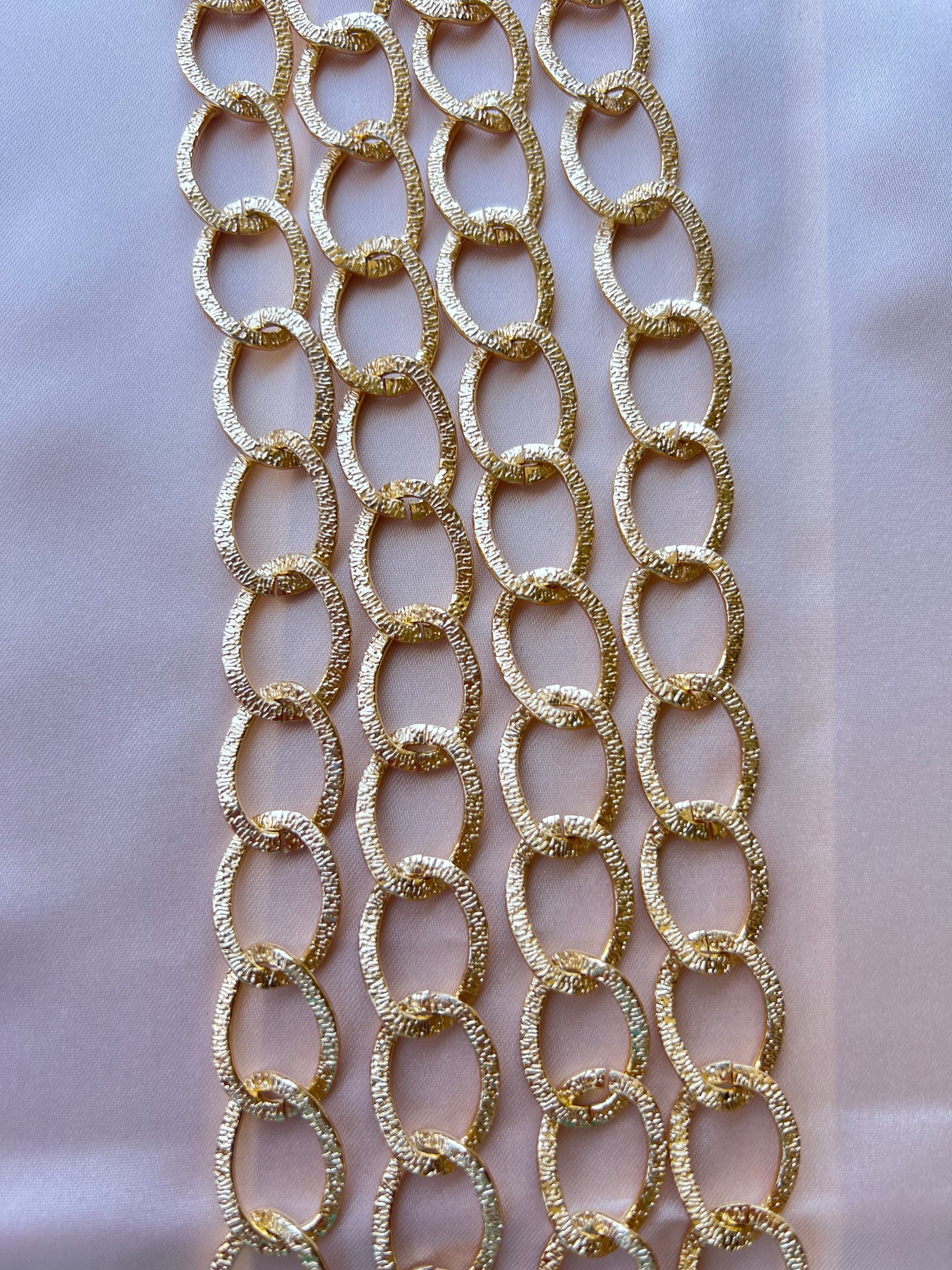 Catena martellata disponibile in oro e argento, dal design deciso e luminoso. La finitura irregolare crea giochi di luce eleganti e moderni, perfetti per valorizzare ogni borsa.