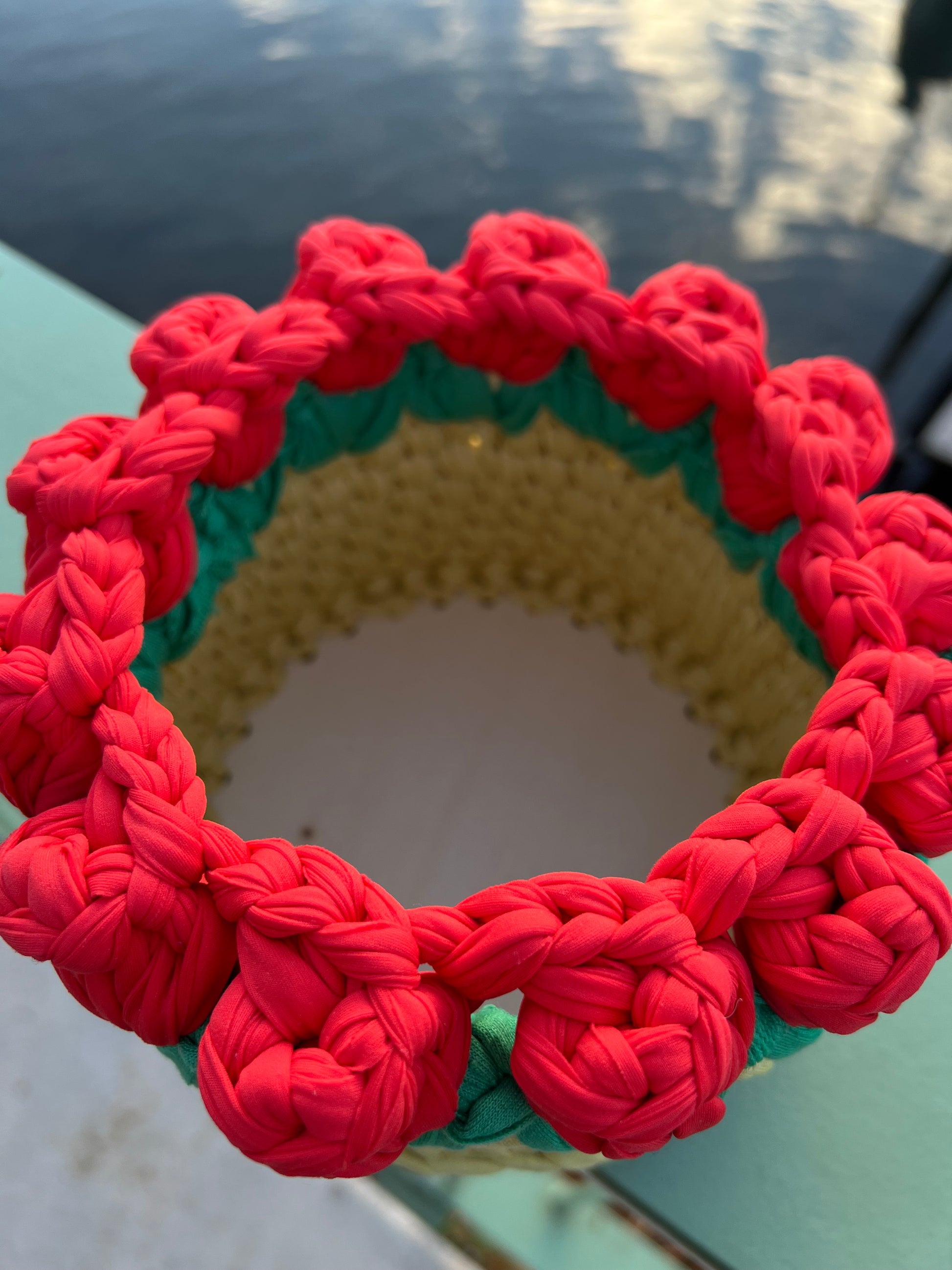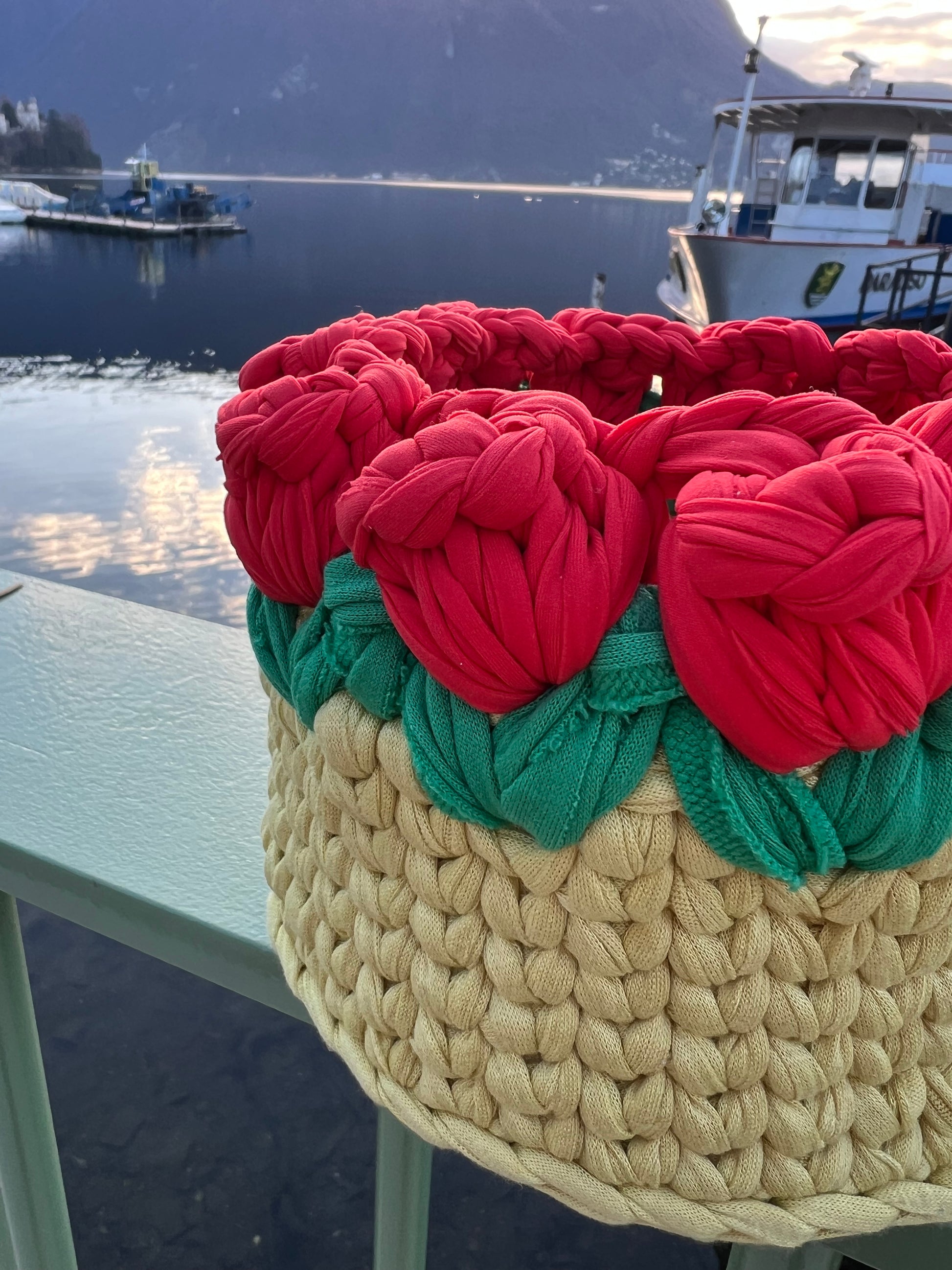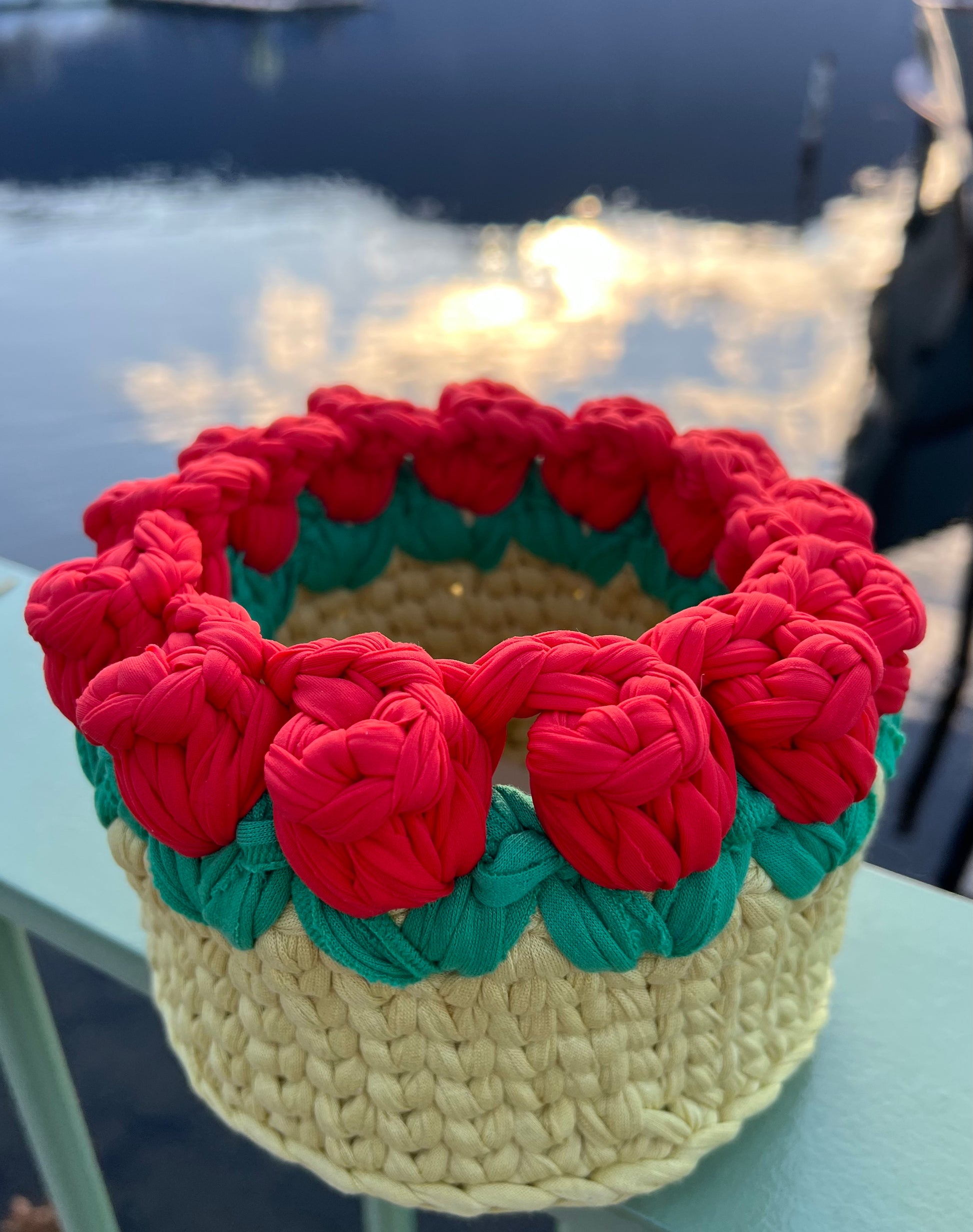 Cestino artigianale realizzato a mano in fettuccia, decorato con delicati tulipani rossi e rifinito con una solida base in legno. Un complemento unico che unisce romanticismo e naturalezza, perfetto per decorare ogni ambiente o per custodire piccoli oggetti con stile.