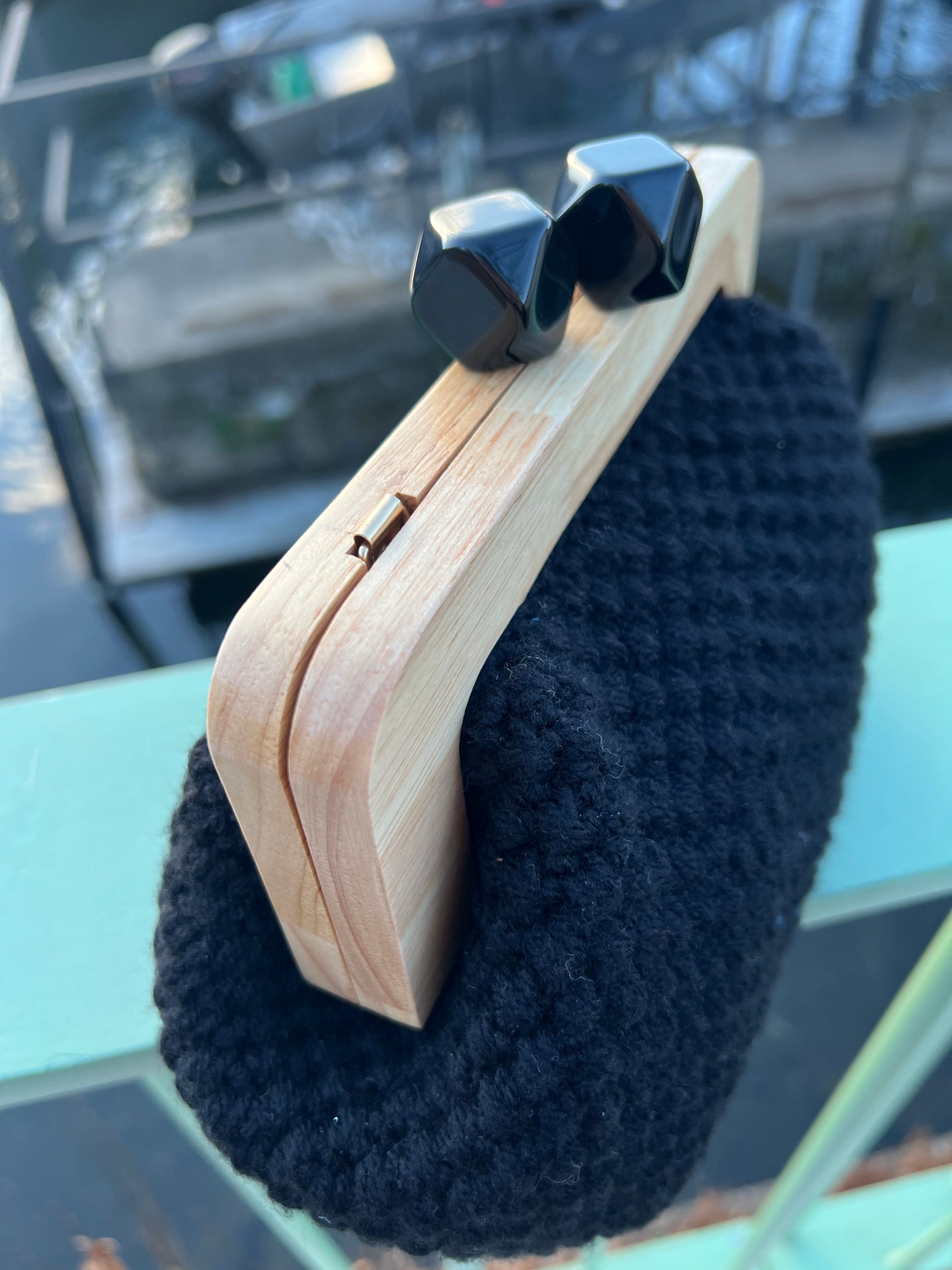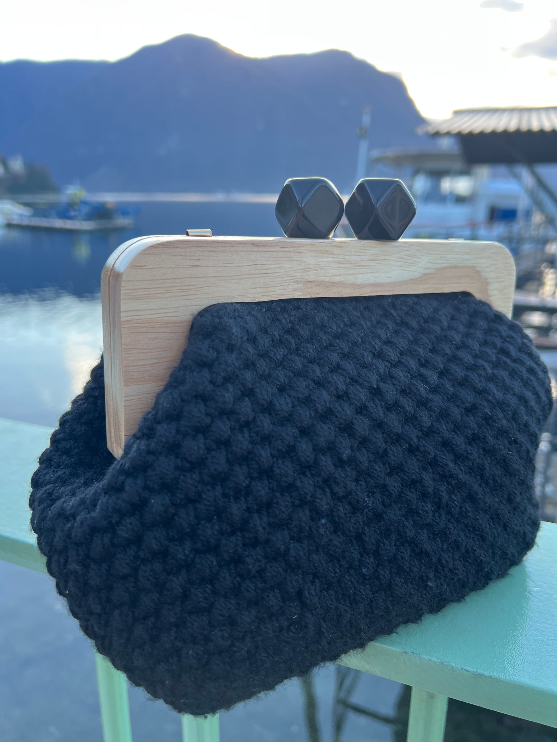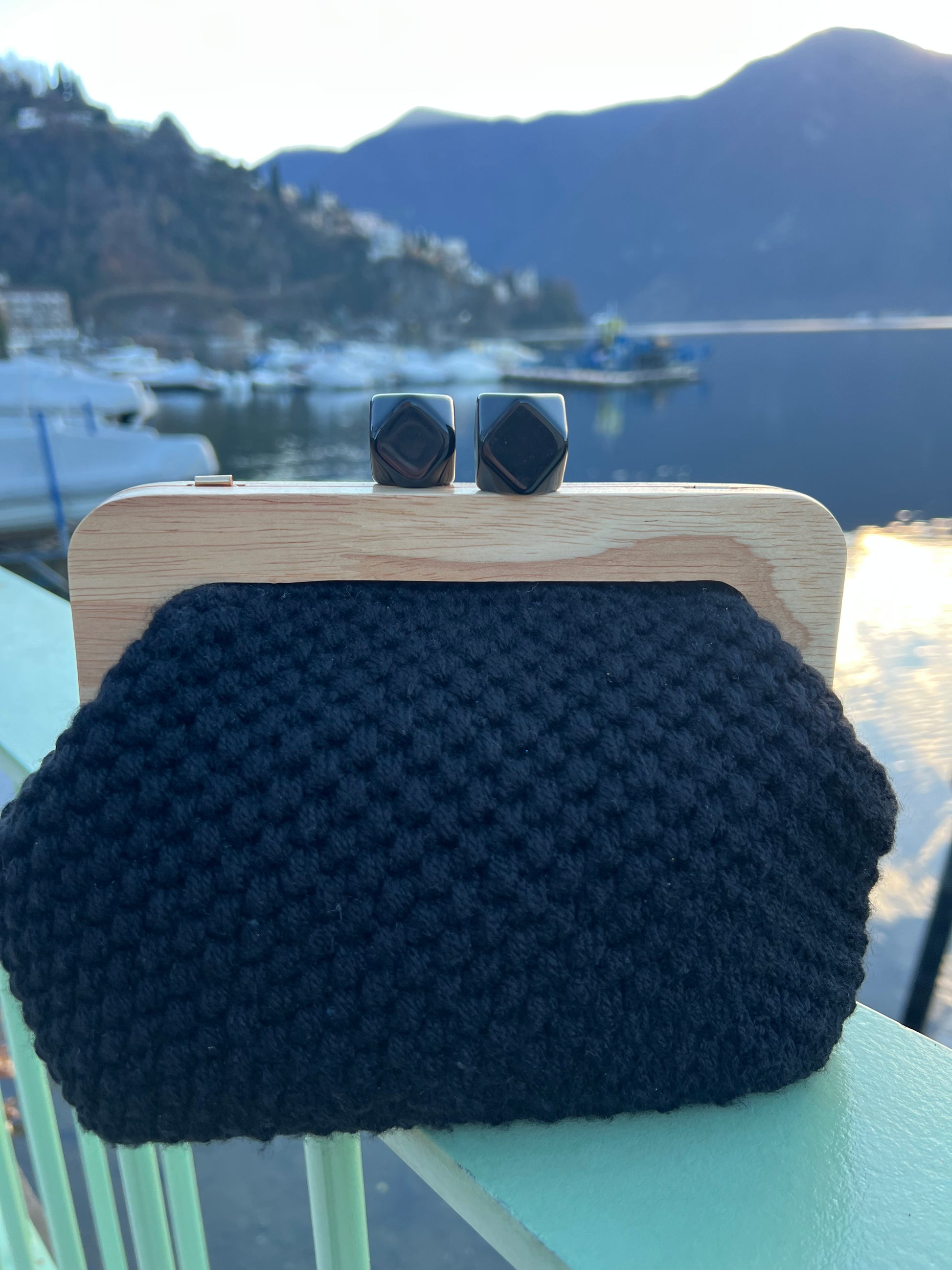 Clutch nera realizzata a mano, elegante e raffinata.