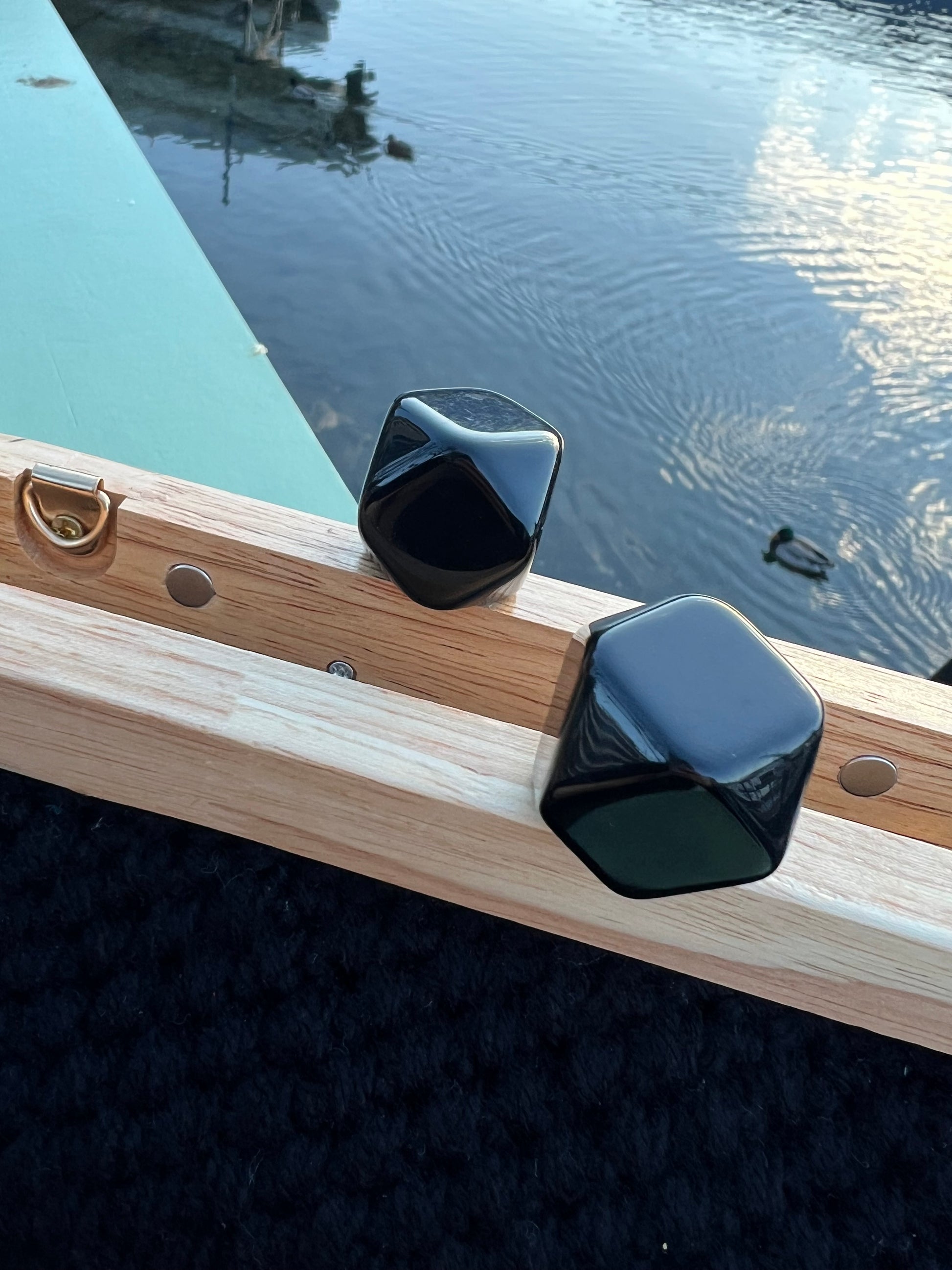 Chiusura in legno naturale, impreziosita da pomelli squadrati in resina nera.
