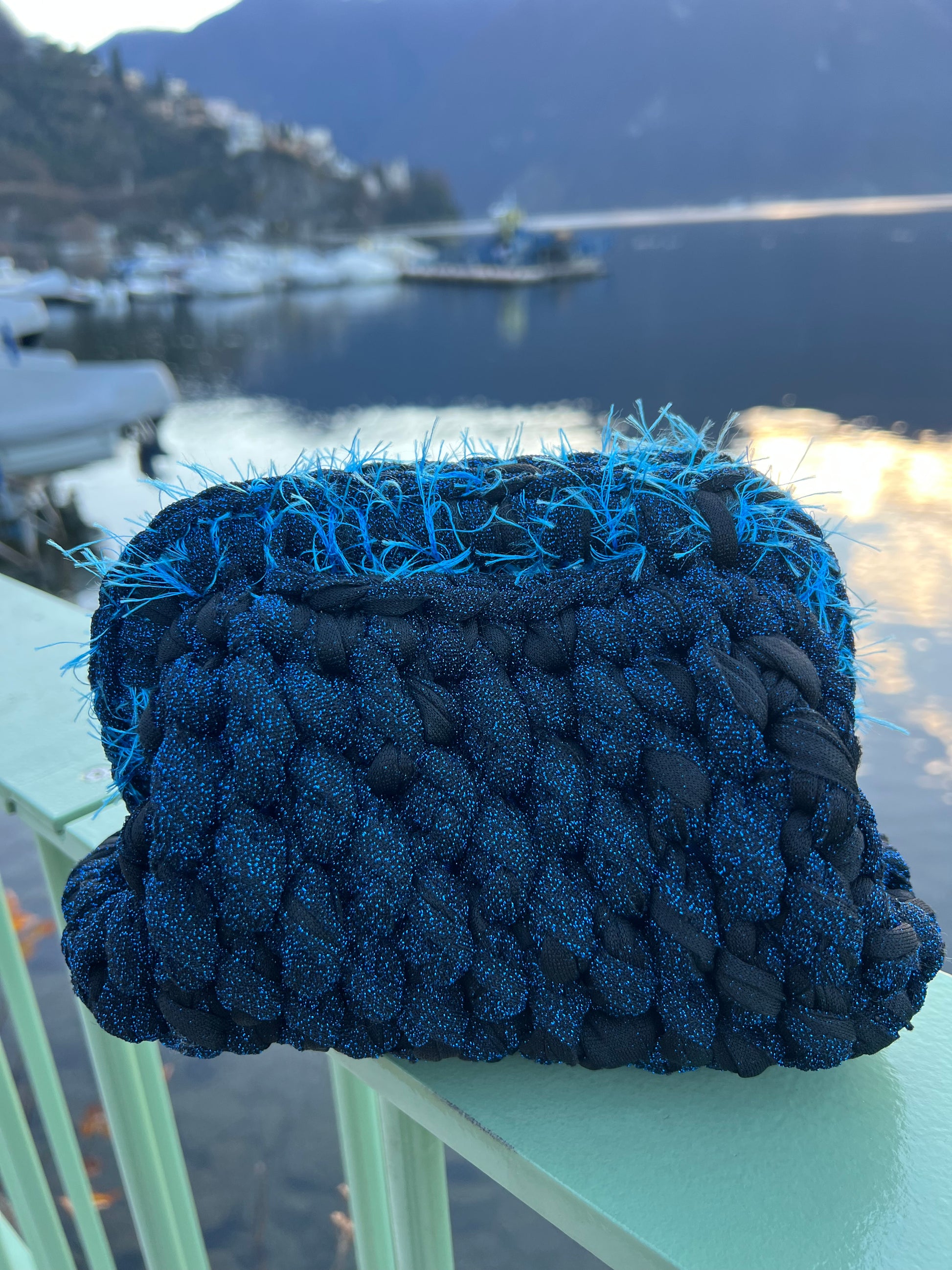 Clutch nera con glitter blu, per un effetto brillante e sofisticato.