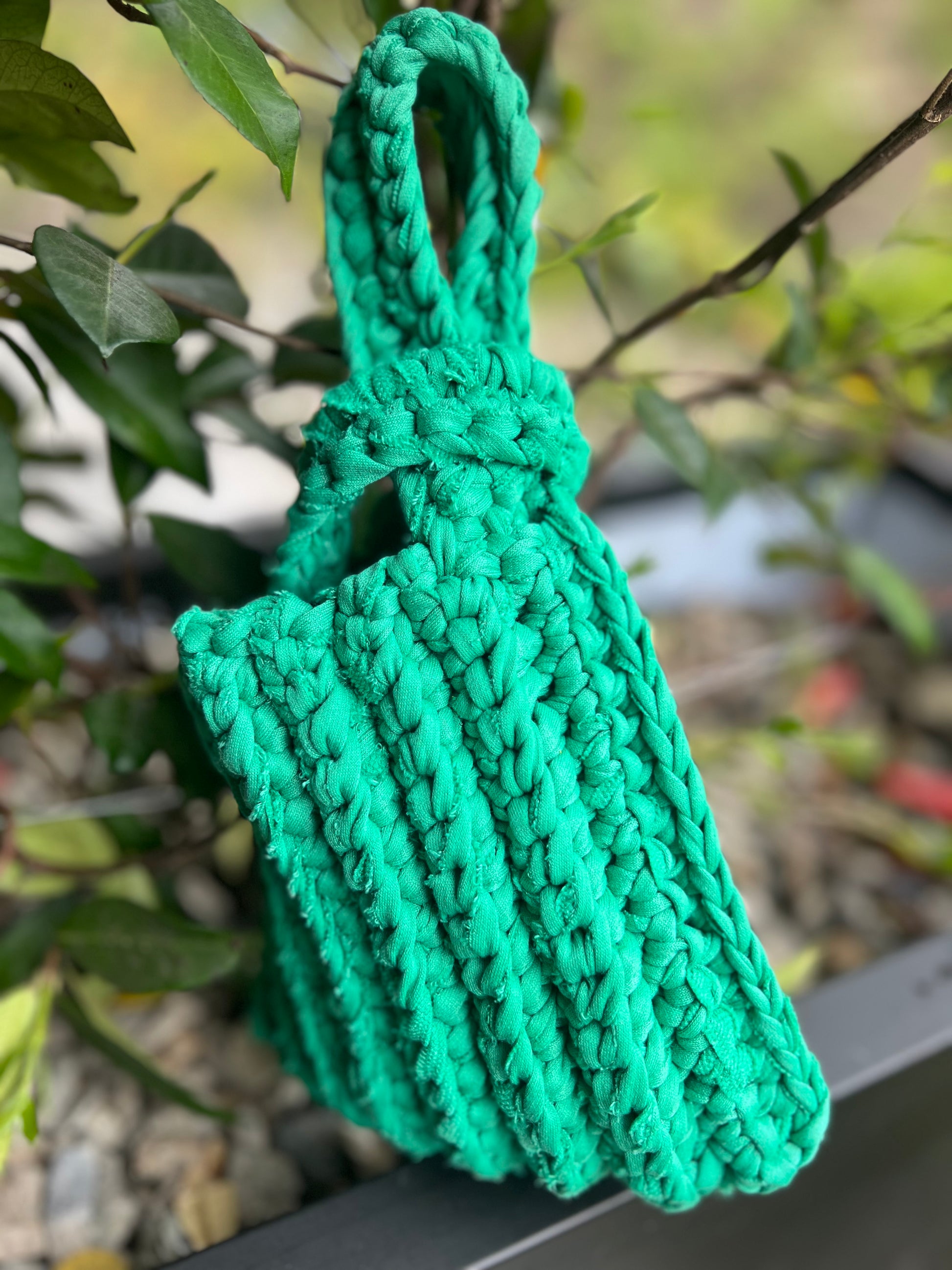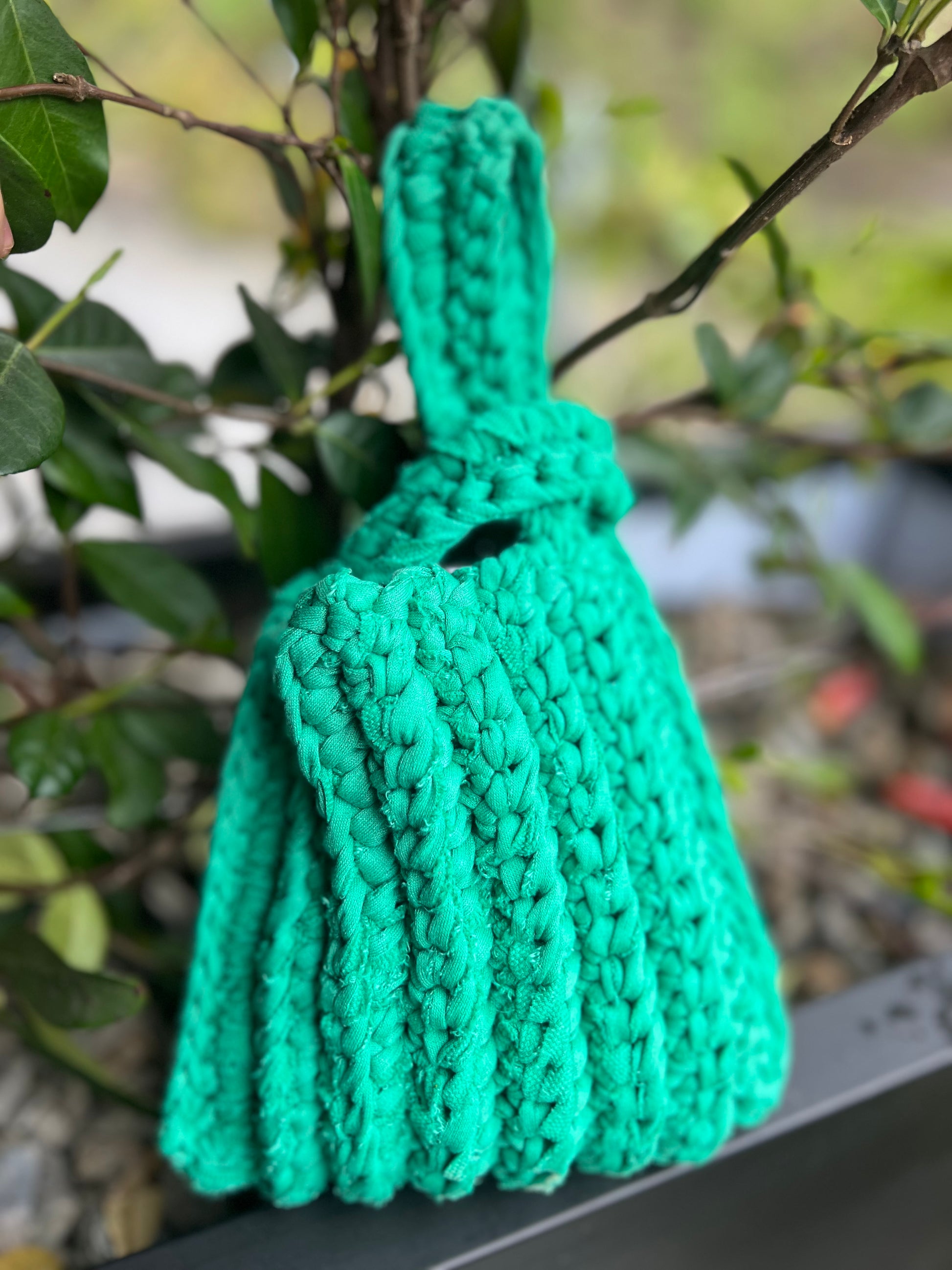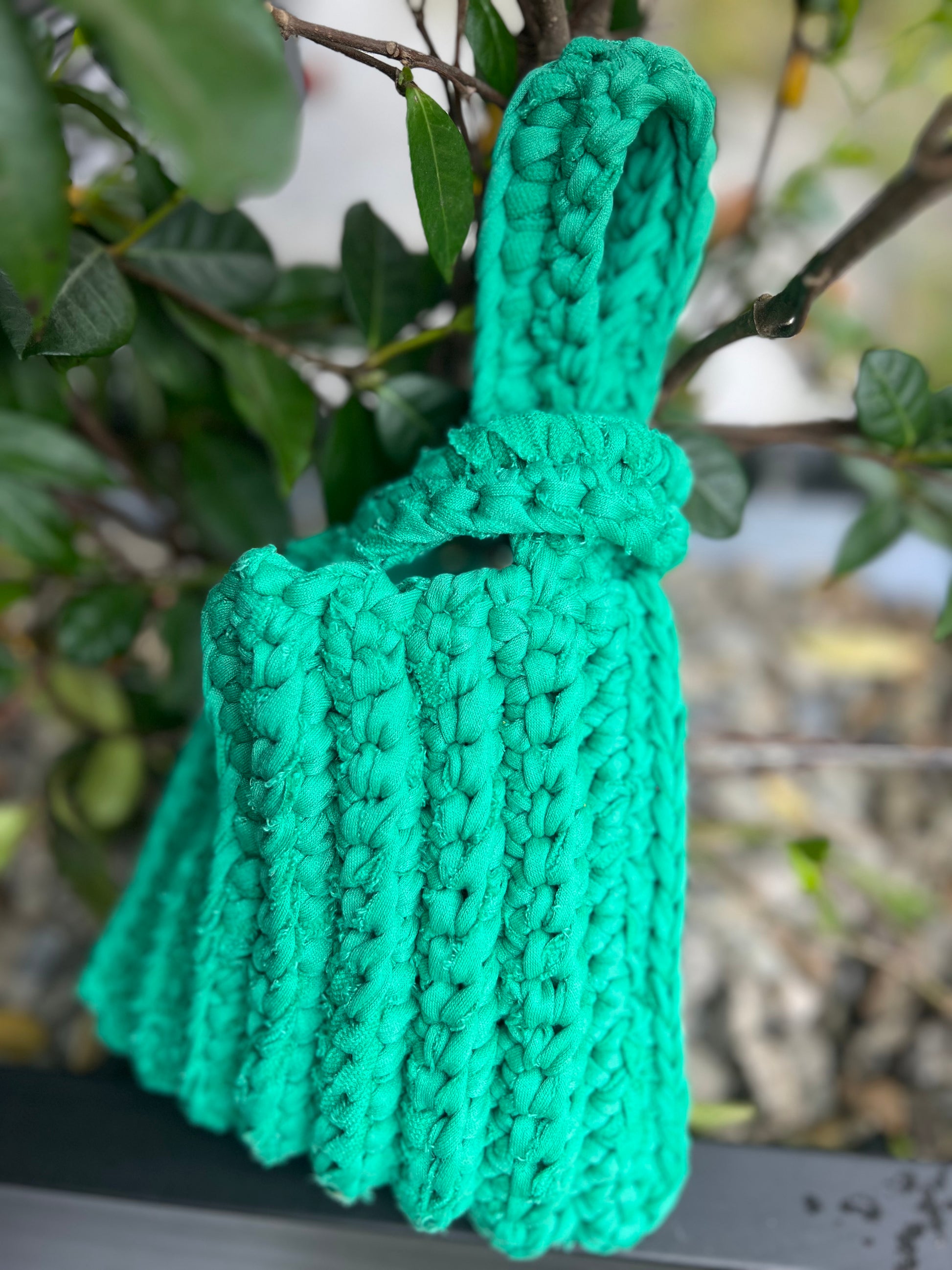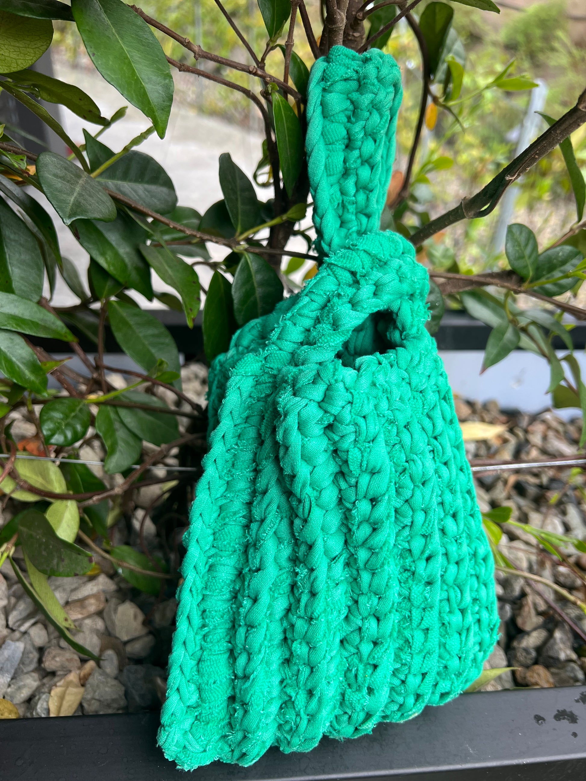 Questa borsa verde smeraldo con tessuto sfilacciato, con nodo giapponese. La sua trama di nodi racconta il dialogo eterno tra mano creatrice e materia plasmata. Il suo verde audace sfida l'indifferenza quotidiana con un'affermazione decisa di identità. Piccola architettura tessile.