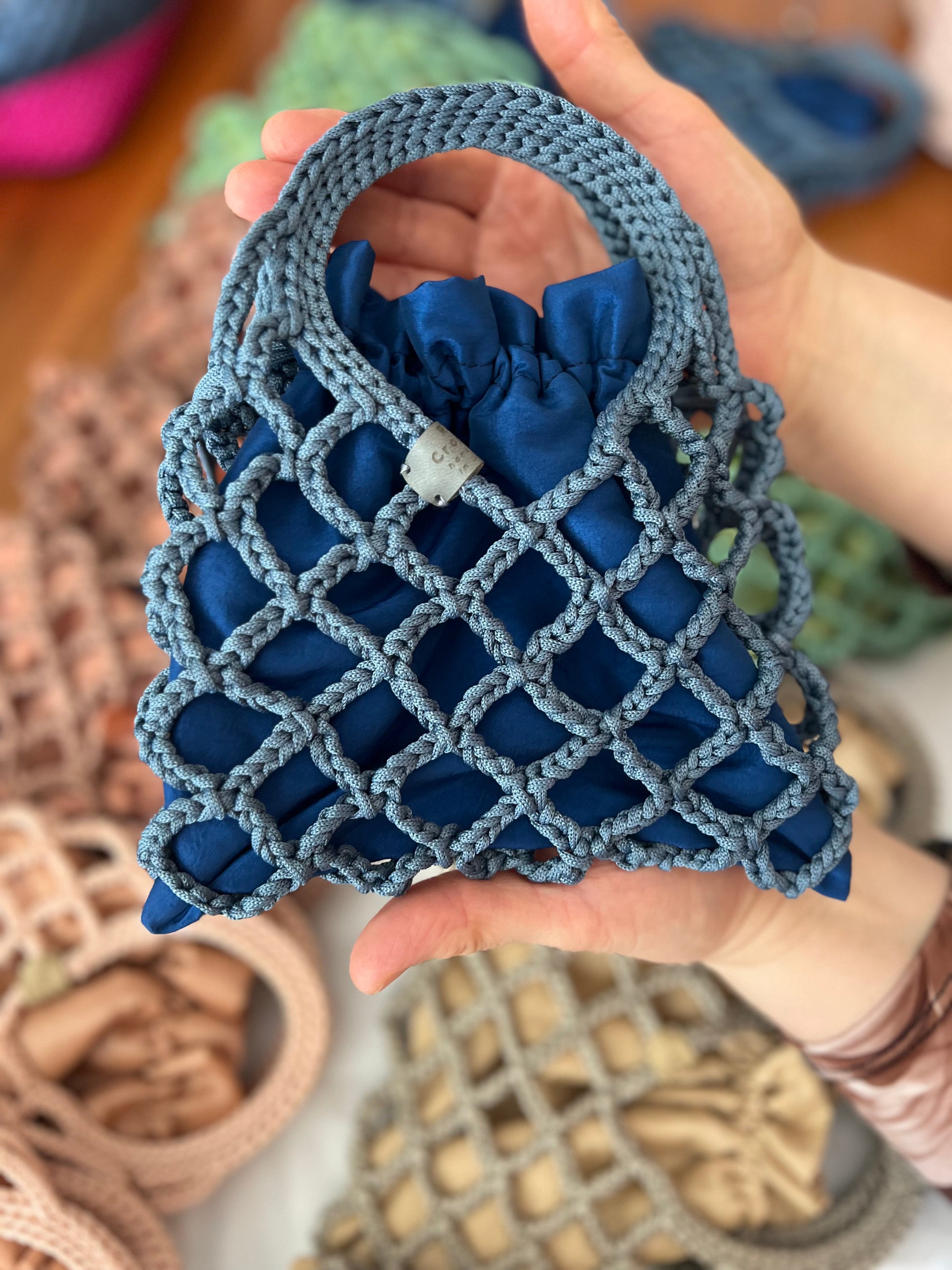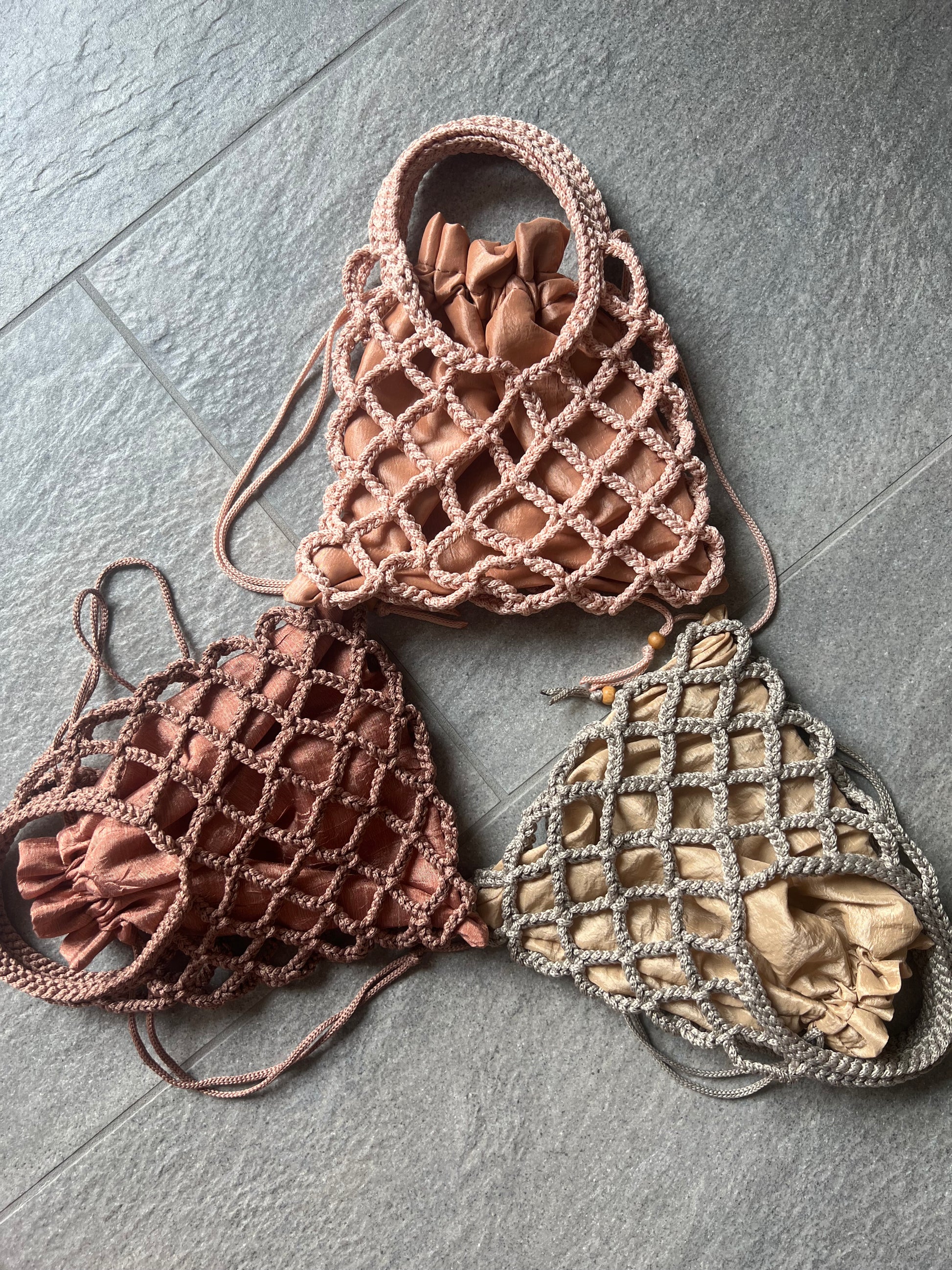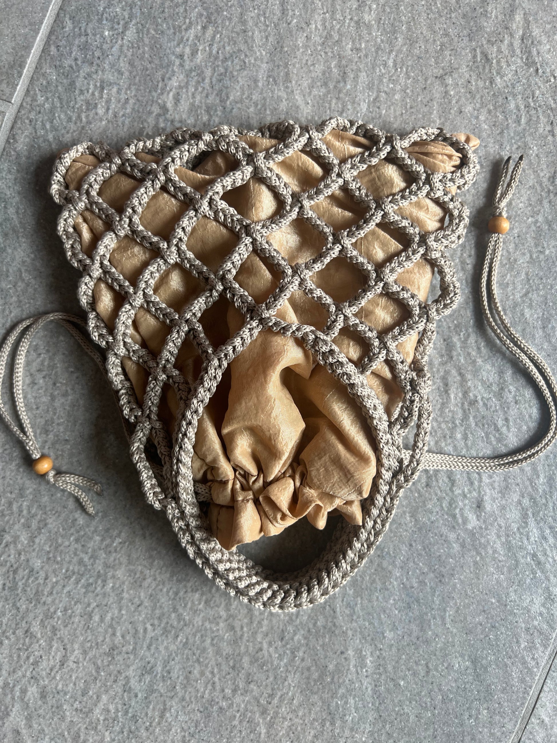 La borsa è composta da una sacca interna in tessuto lucido, chiusa da un laccio a coulisse. All’esterno è avvolta da una rete intrecciata a mano, creando un elegante effetto a maglie larghe. I manici sono realizzati anch’essi all’uncinetto, robusti e ben rifiniti. L’insieme fonde artigianalità e stile naturale con raffinata leggerezza.