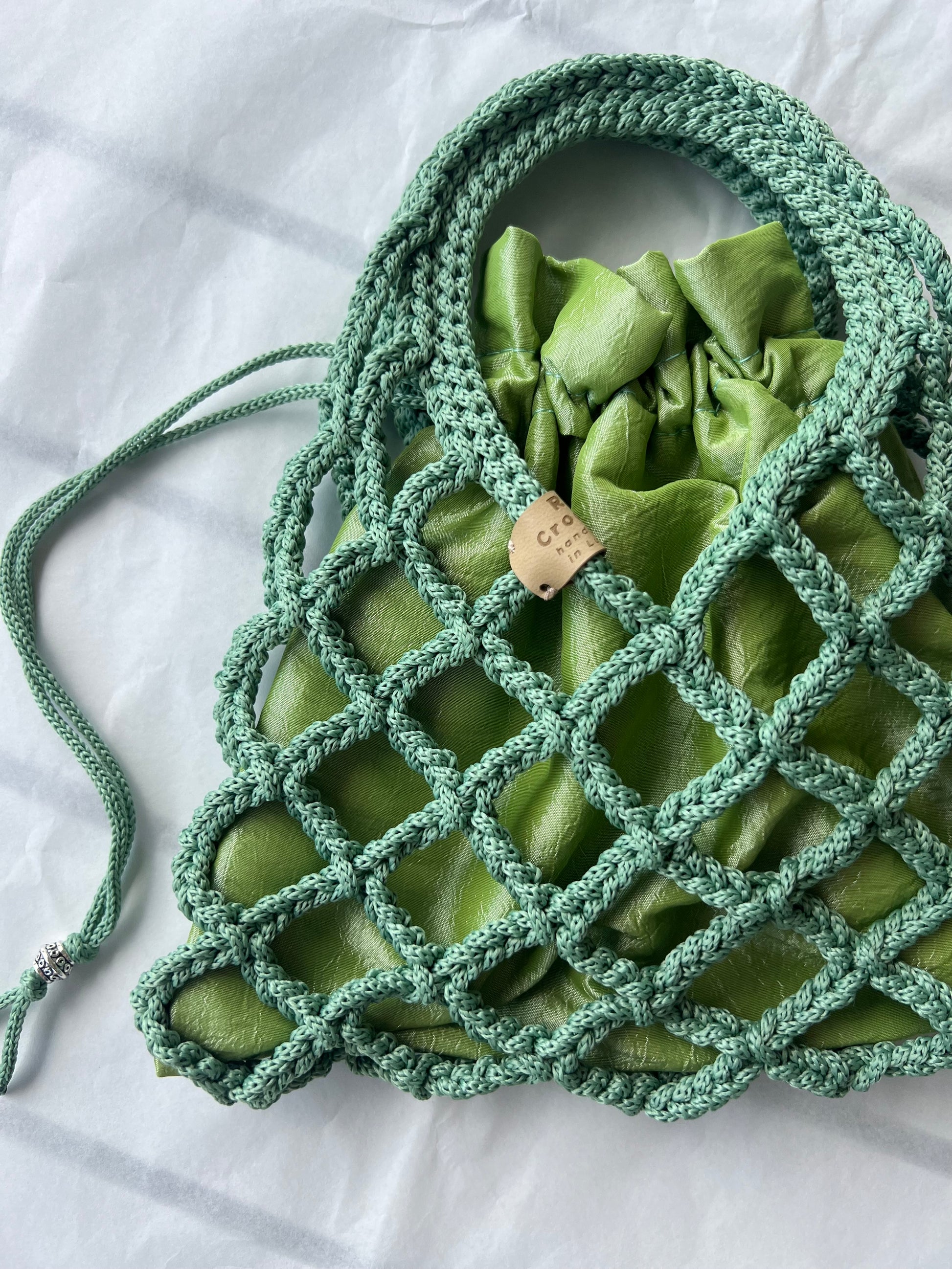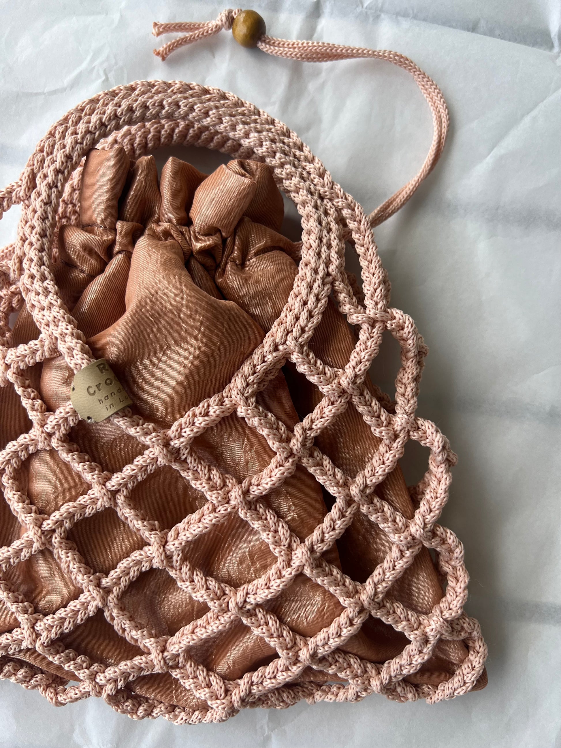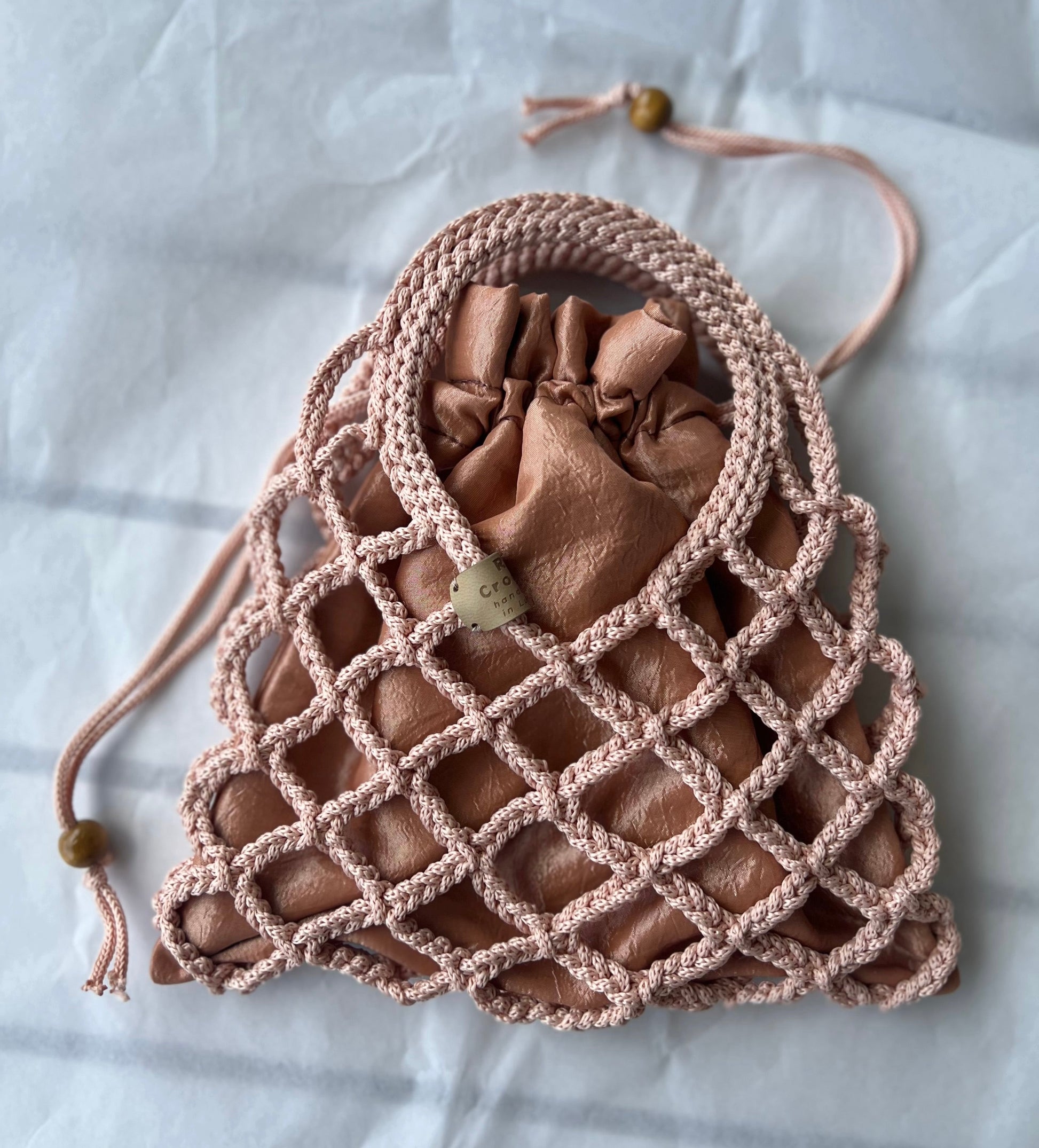 La borsa è composta da una sacca interna in tessuto lucido, chiusa da un laccio a coulisse. All’esterno è avvolta da una rete intrecciata a mano, creando un elegante effetto a maglie larghe. I manici sono realizzati anch’essi all’uncinetto, robusti e ben rifiniti. L’insieme fonde artigianalità e stile naturale con raffinata leggerezza.