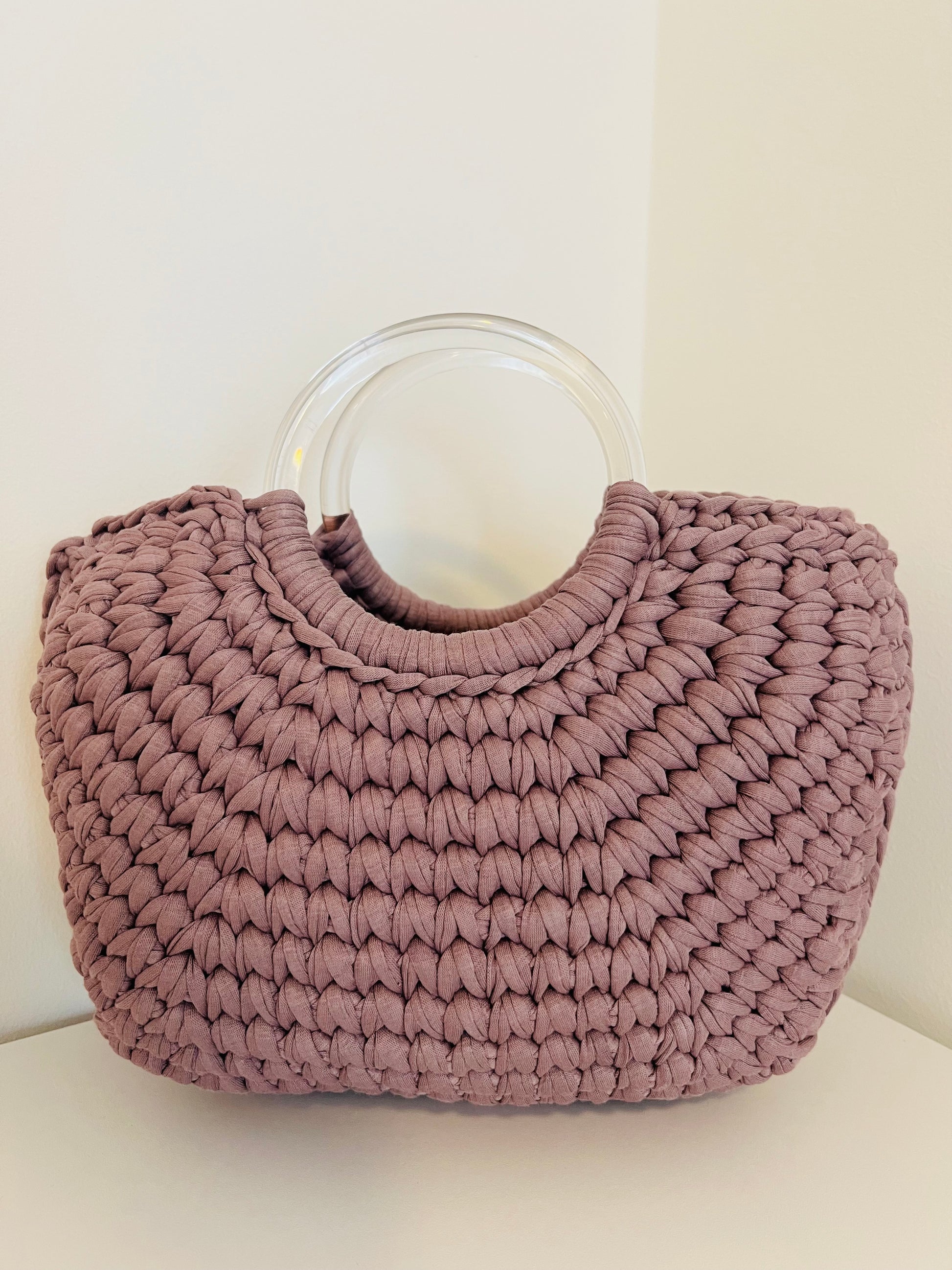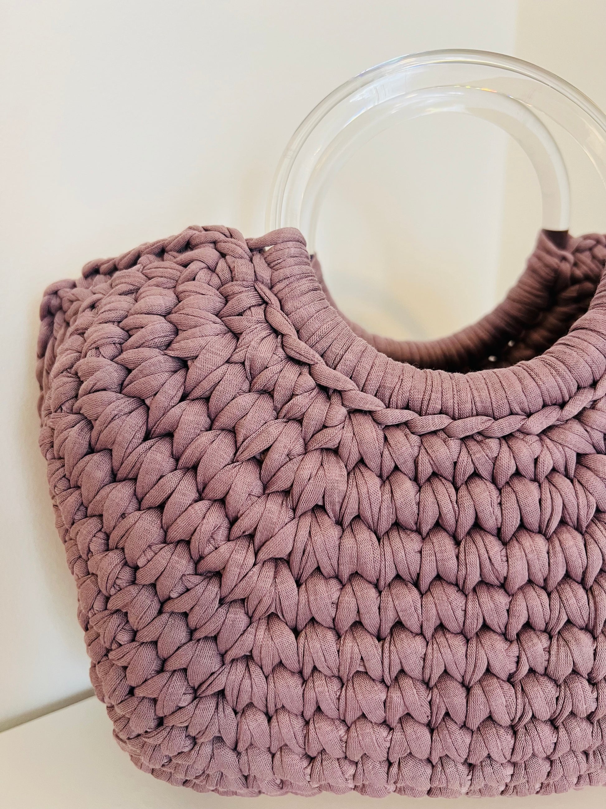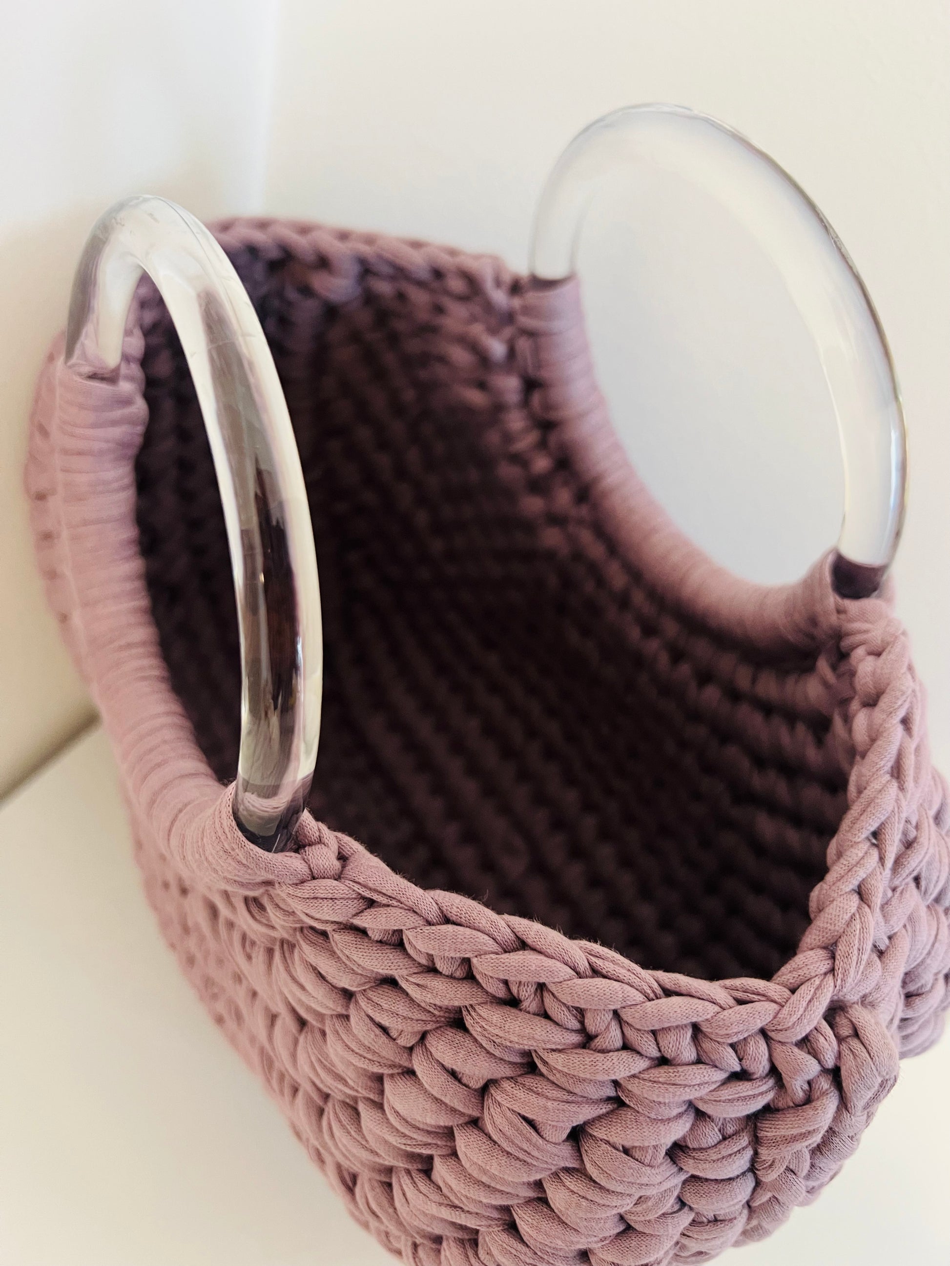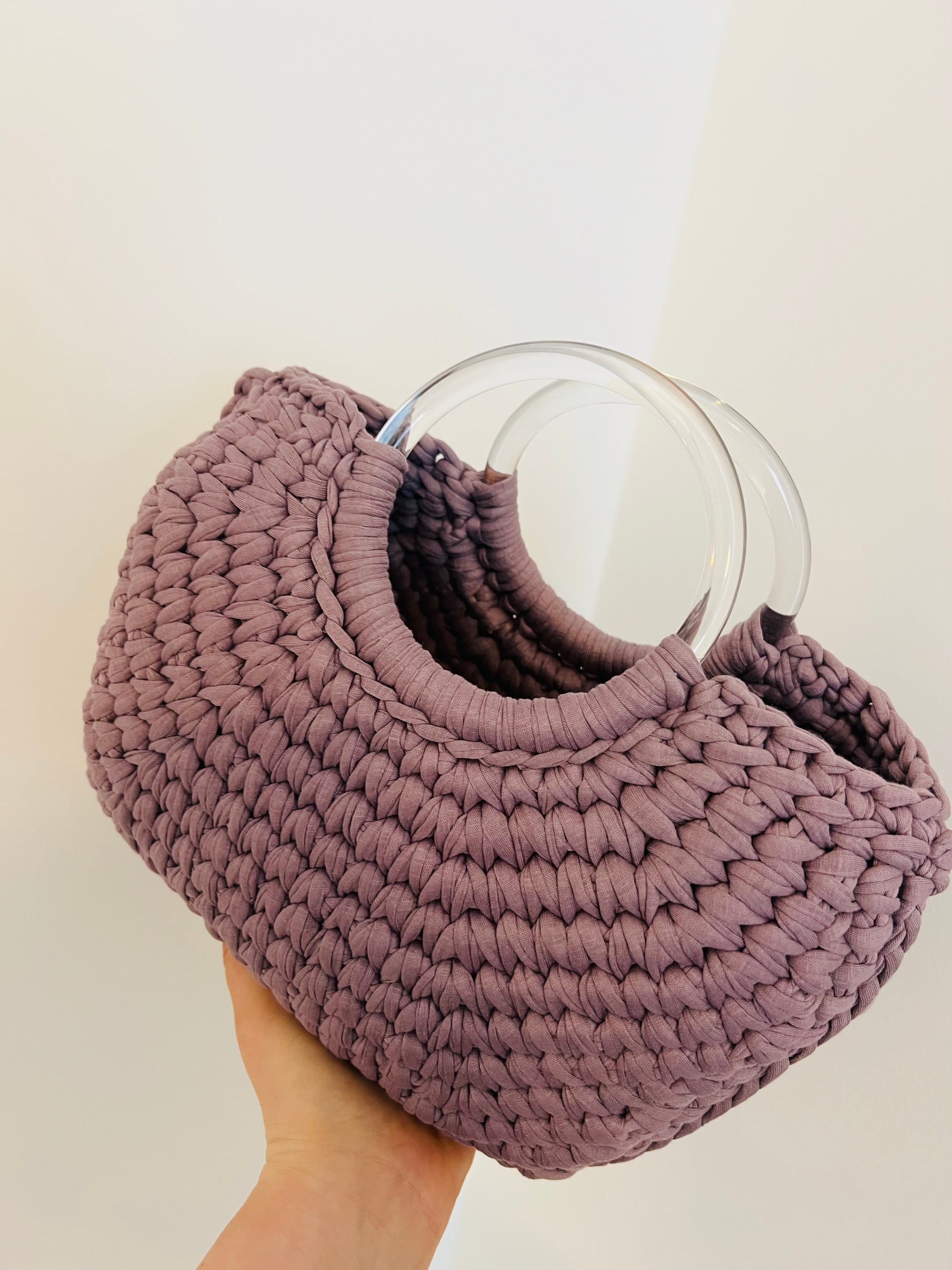 I manici rigidi a cerchio trasparenti in resina si intrecciano elegantemente con la lavorazione, creando un effetto unico.