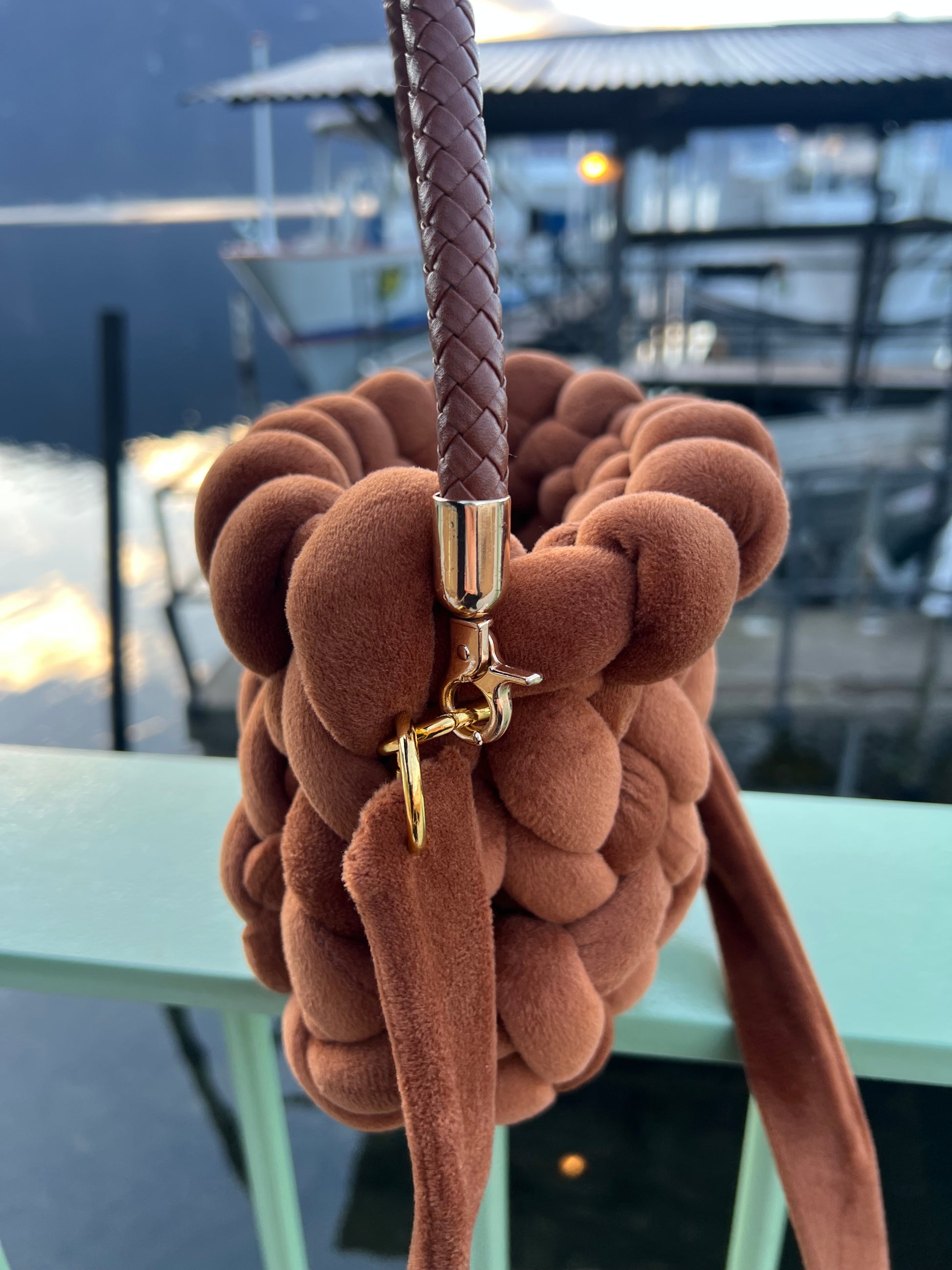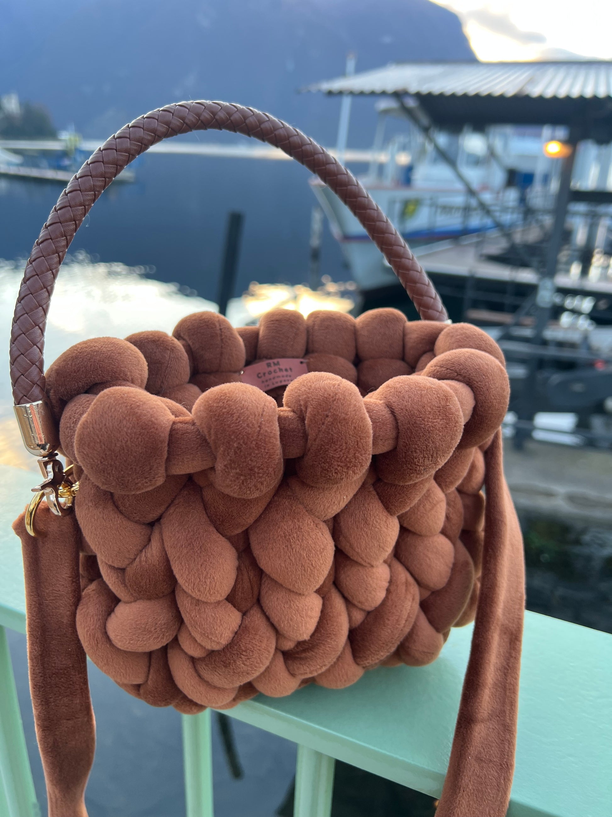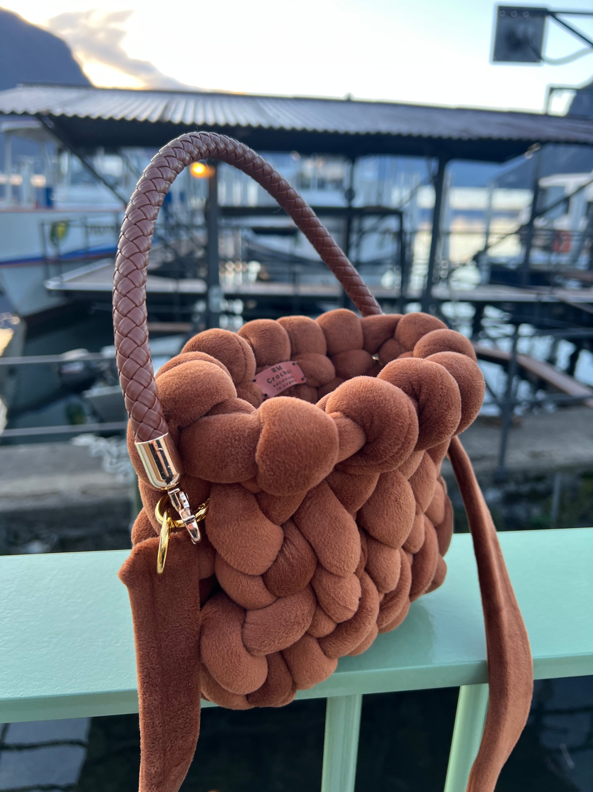 Morbidezza e stile si incontrano nella nostra borsa Marshmallow Brown, realizzata con filato marshmallow color marrone. Dotata di maniglia in ecopelle e dettagli dorati, è completata da una comoda tracolla in vellutino, perfetta per portarla sempre con te con eleganza e praticità. Un accessorio fatto a mano, pensato per chi ama il comfort senza rinunciare al design.