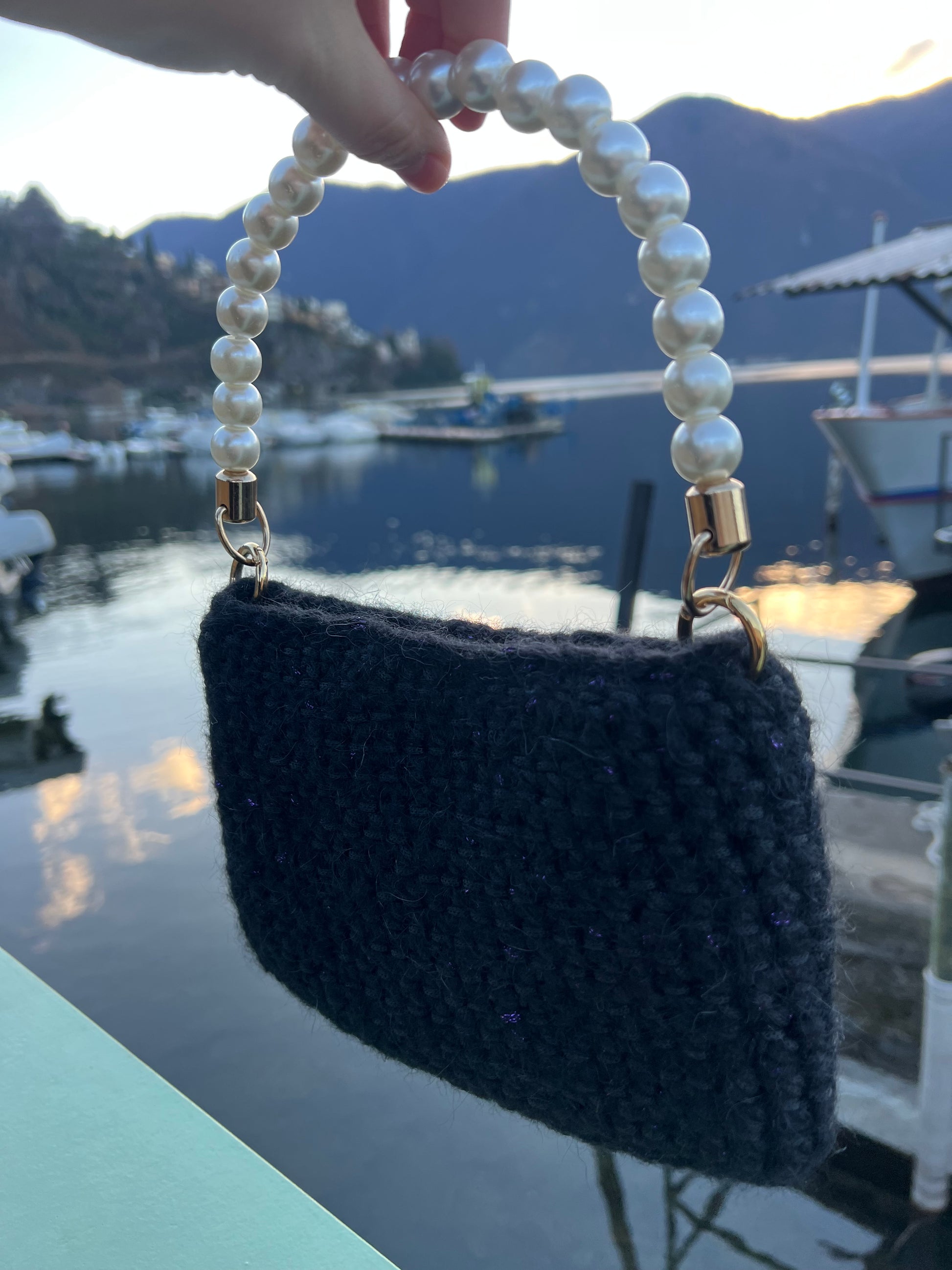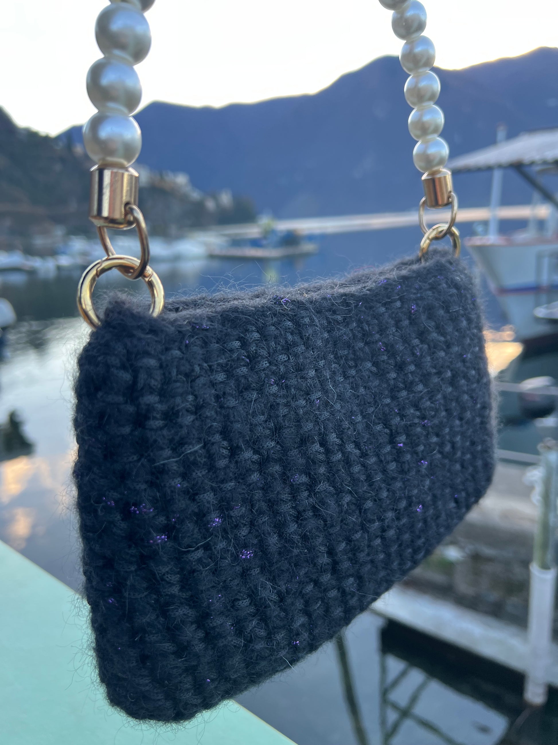 Eleganza scintillante per le tue serate speciali: questa mini bag nera è arricchita da inserti viola lurex che catturano la luce con raffinatezza. Il manico in perle e i dettagli color oro aggiungono un tocco di lusso, rendendola perfetta per completare ogni look da sera con stile unico. Fatto a mano con cura, un accessorio esclusivo e sofisticato.