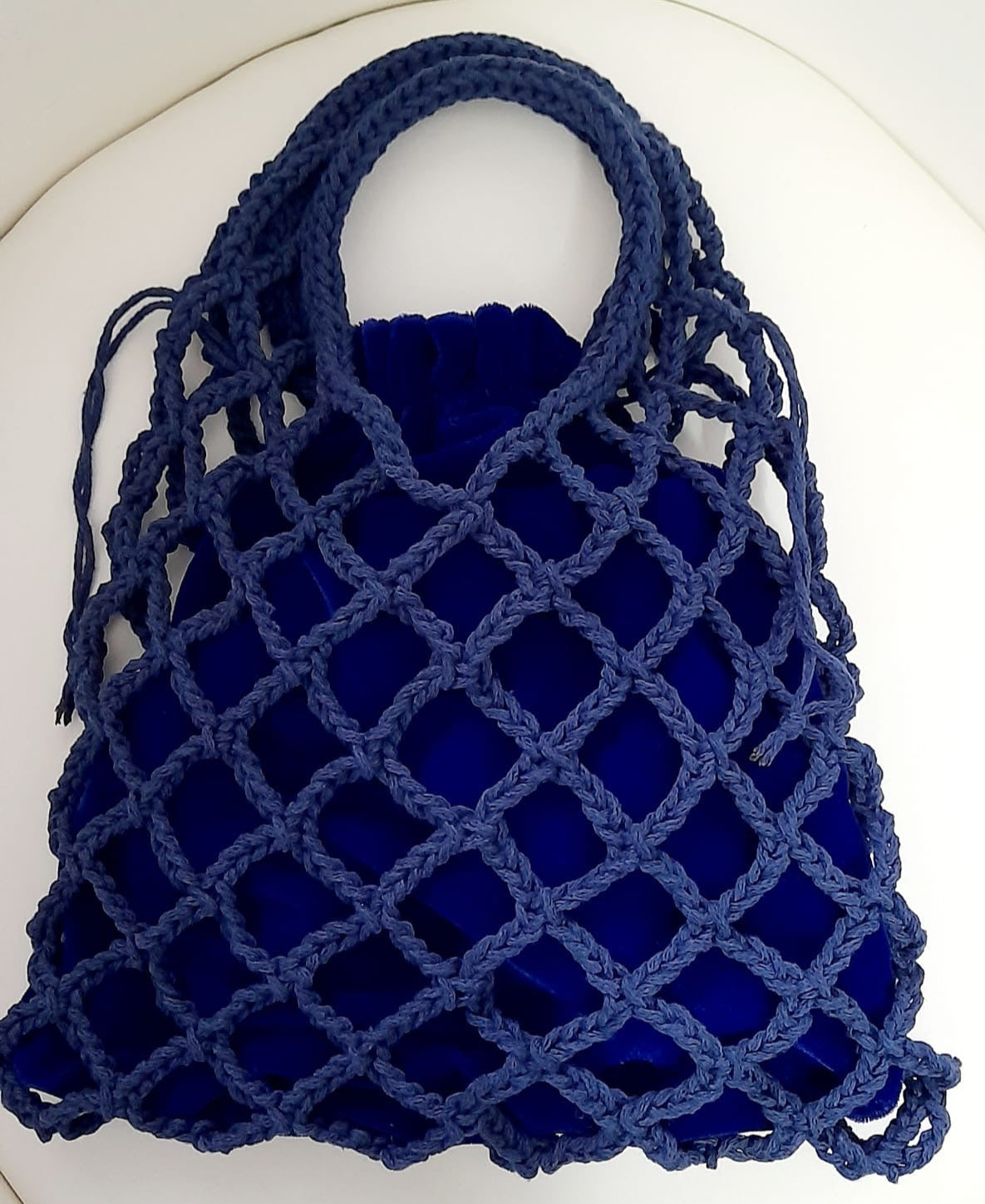 La borsa è composta da una sacca interna in velluto, chiusa da un laccio a coulisse. All’esterno è avvolta da una rete intrecciata a mano in filato blu, creando un elegante effetto a maglie larghe. I manici sono realizzati anch’essi all’uncinetto, robusti e ben rifiniti. L’insieme fonde artigianalità e stile naturale con raffinata leggerezza.
