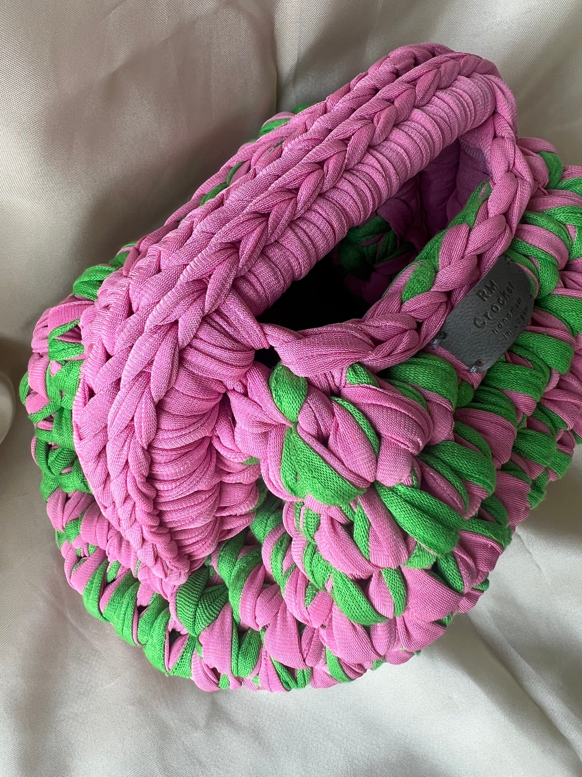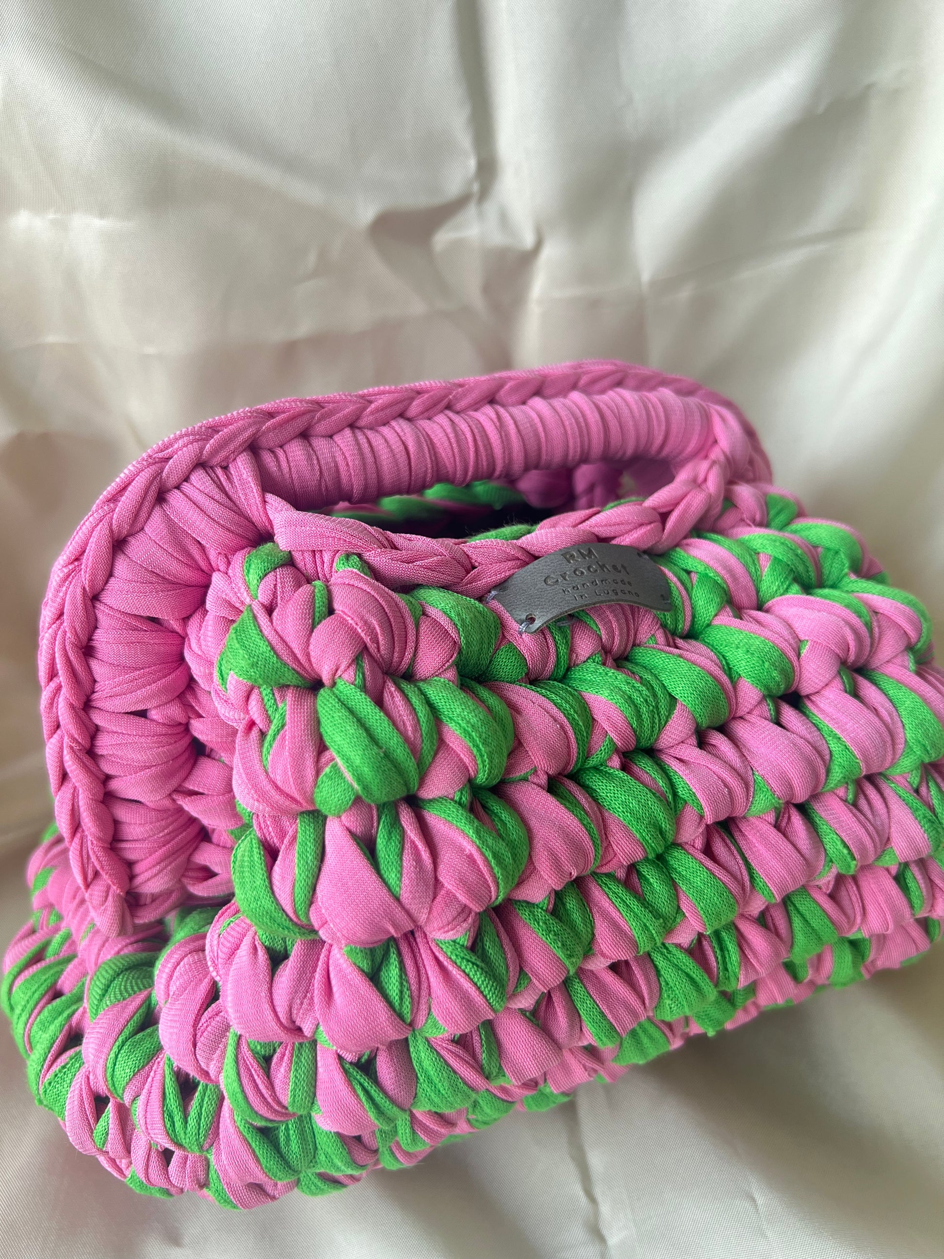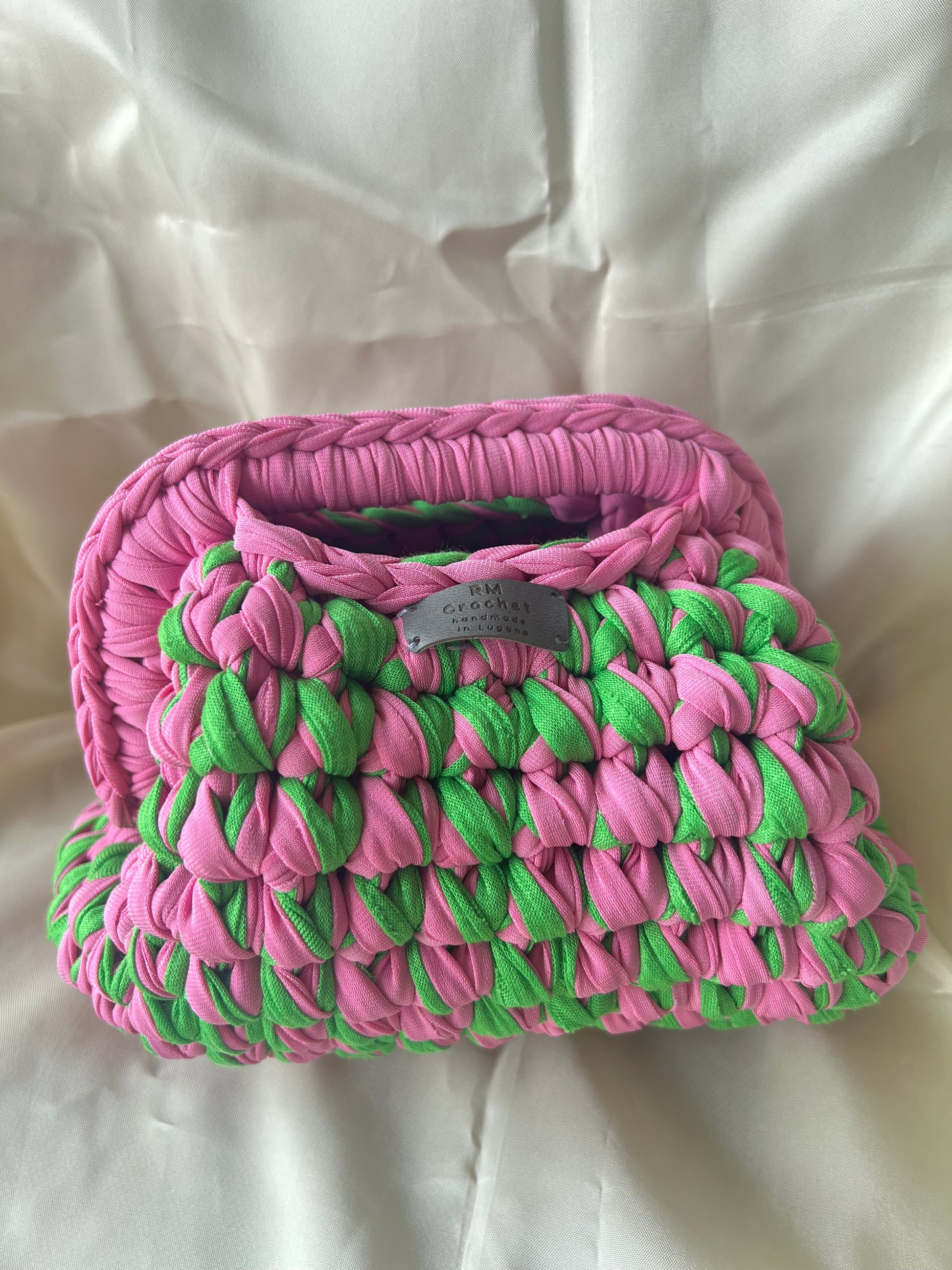 Clutch bicolore in fettuccia in Lycra, nei colori del rosa e del verde prato. Molto versatile.