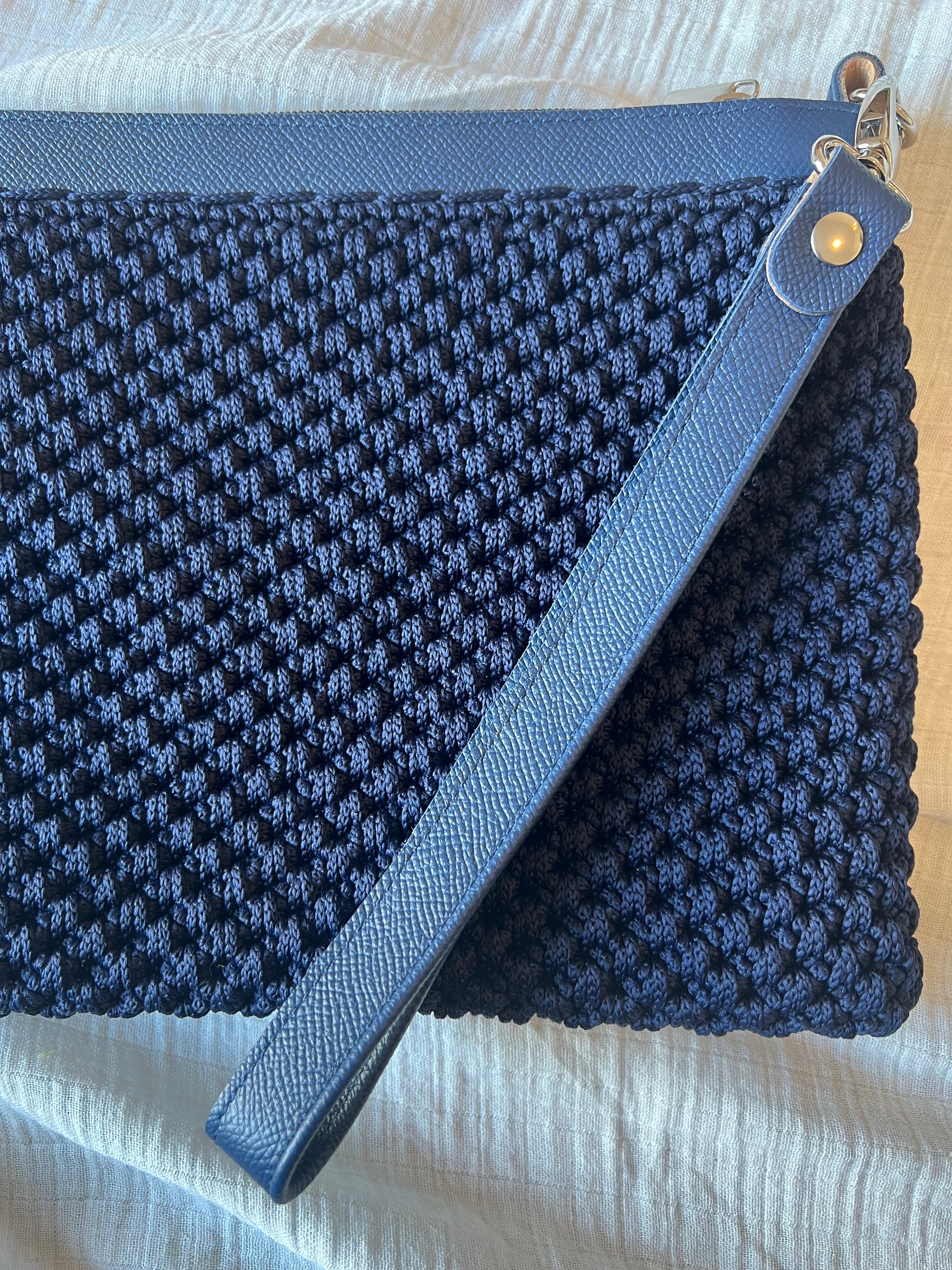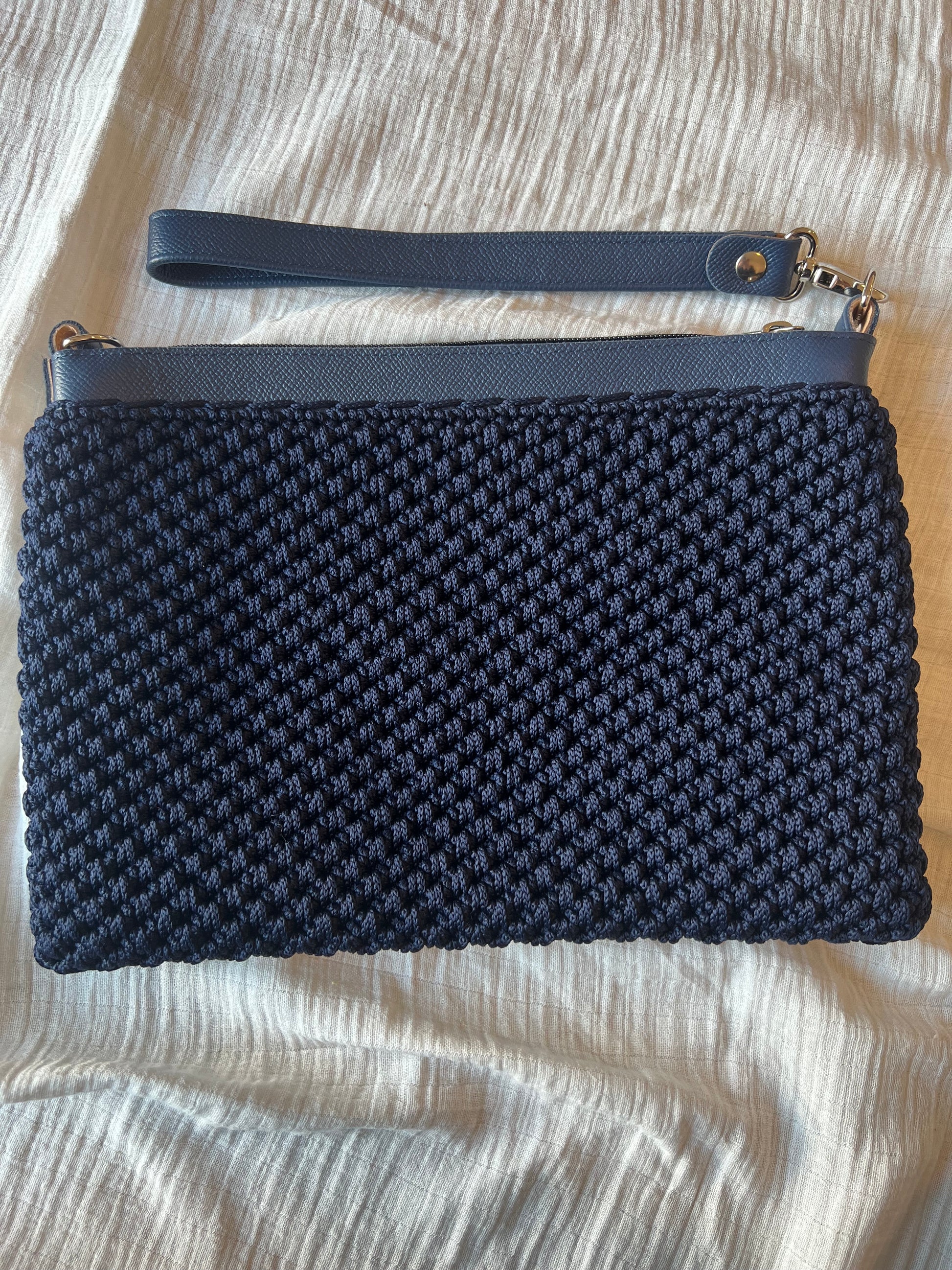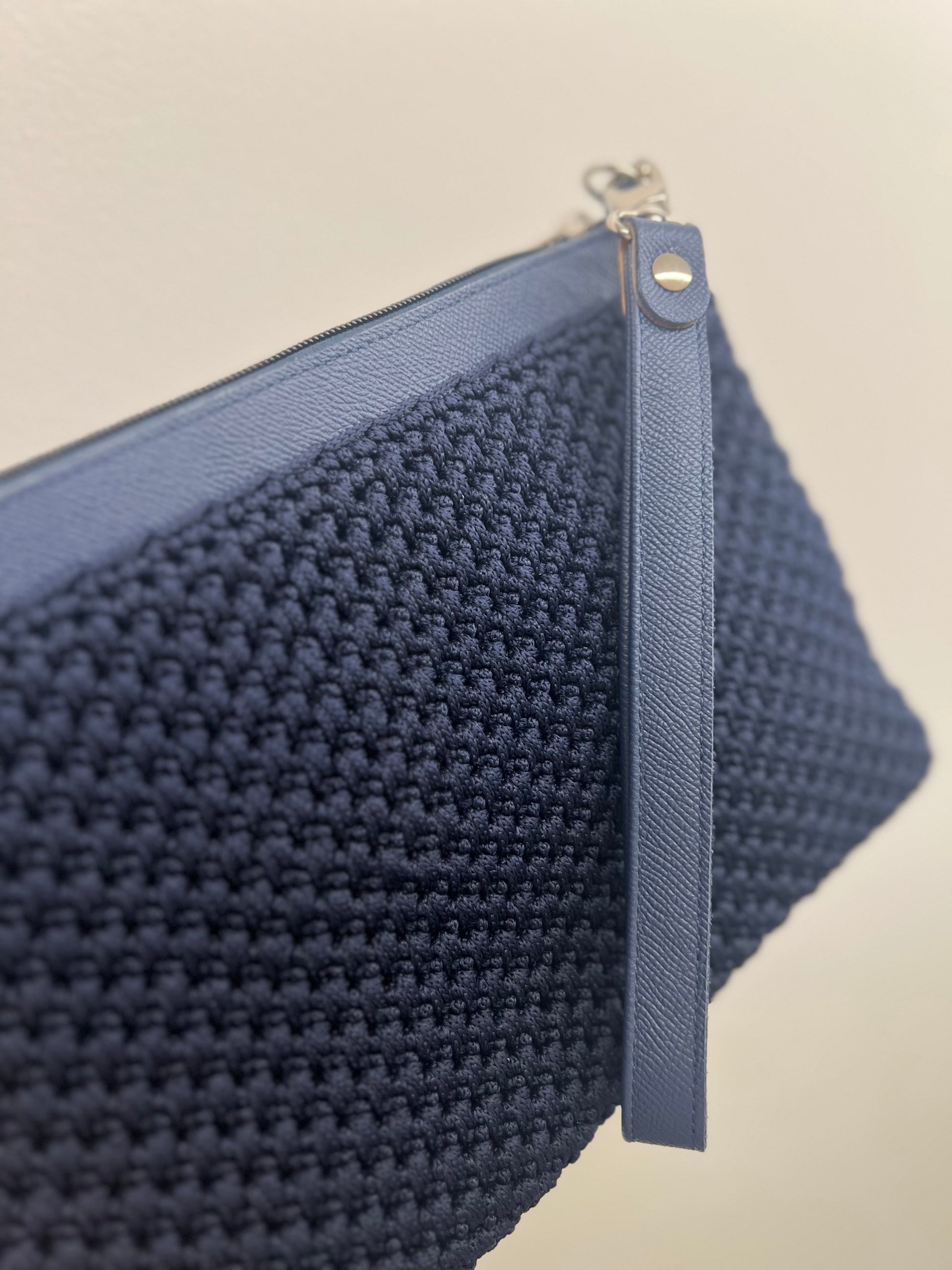 Pochette blu molto capiente con pratica chiusura a cerniera e dettagli in vera pelle.