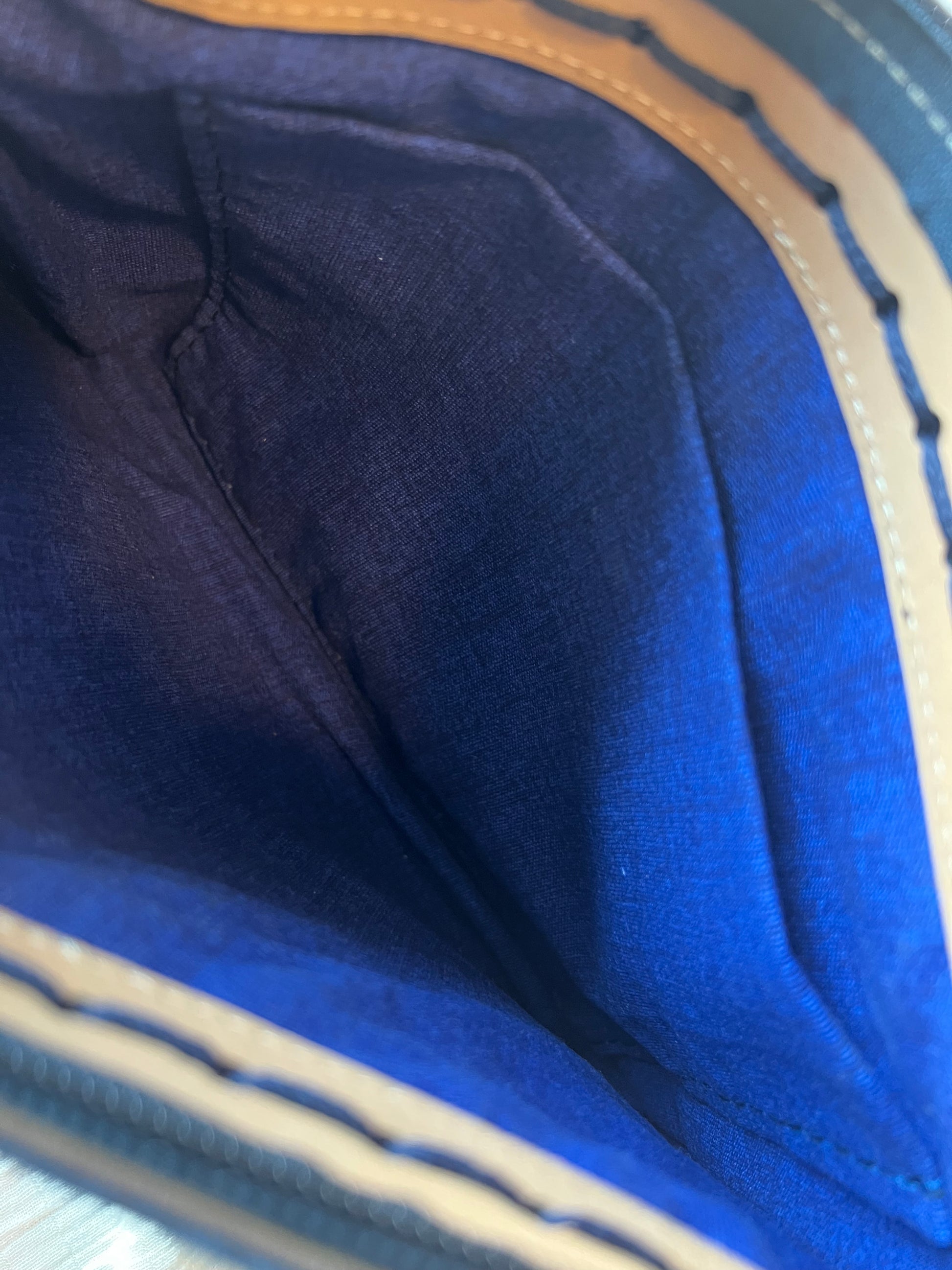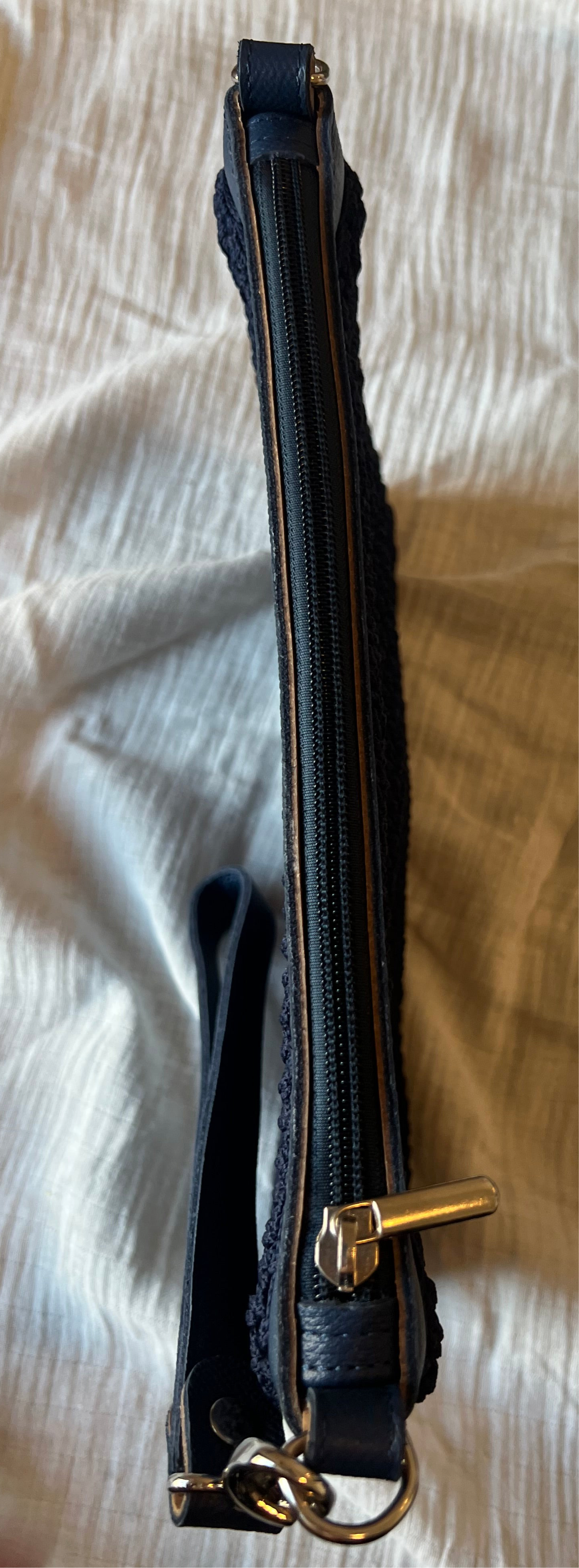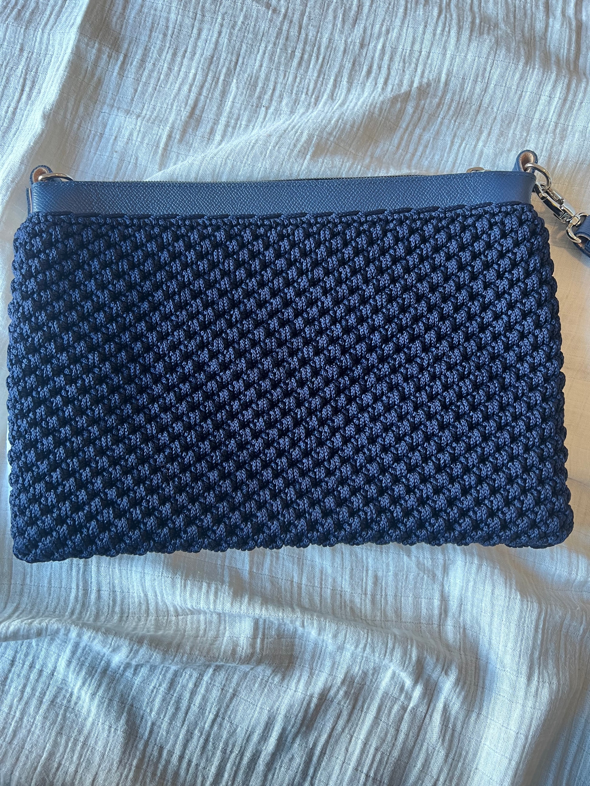 Pochette blu molto capiente con pratica chiusura a cerniera e dettagli in vera pelle.