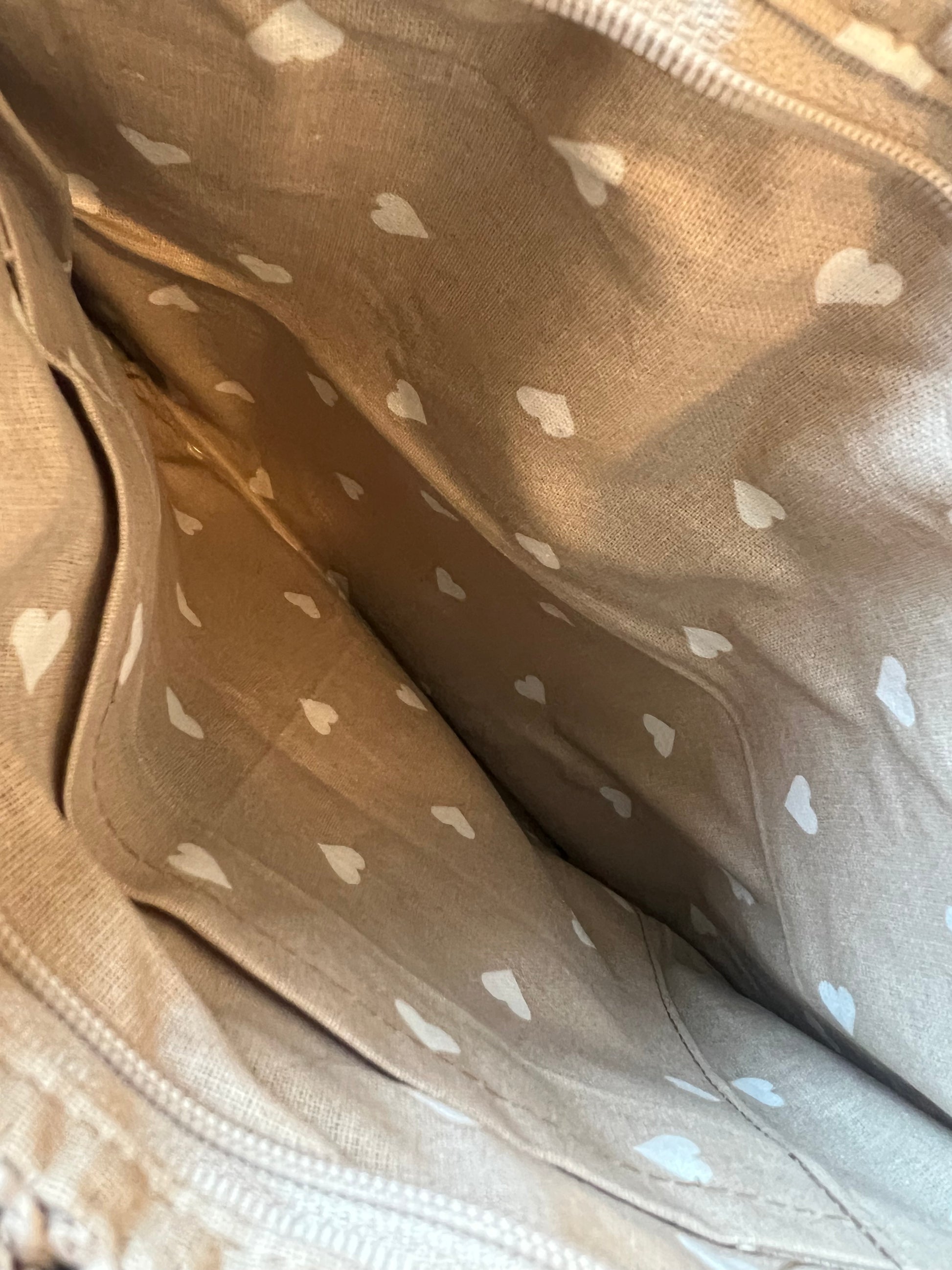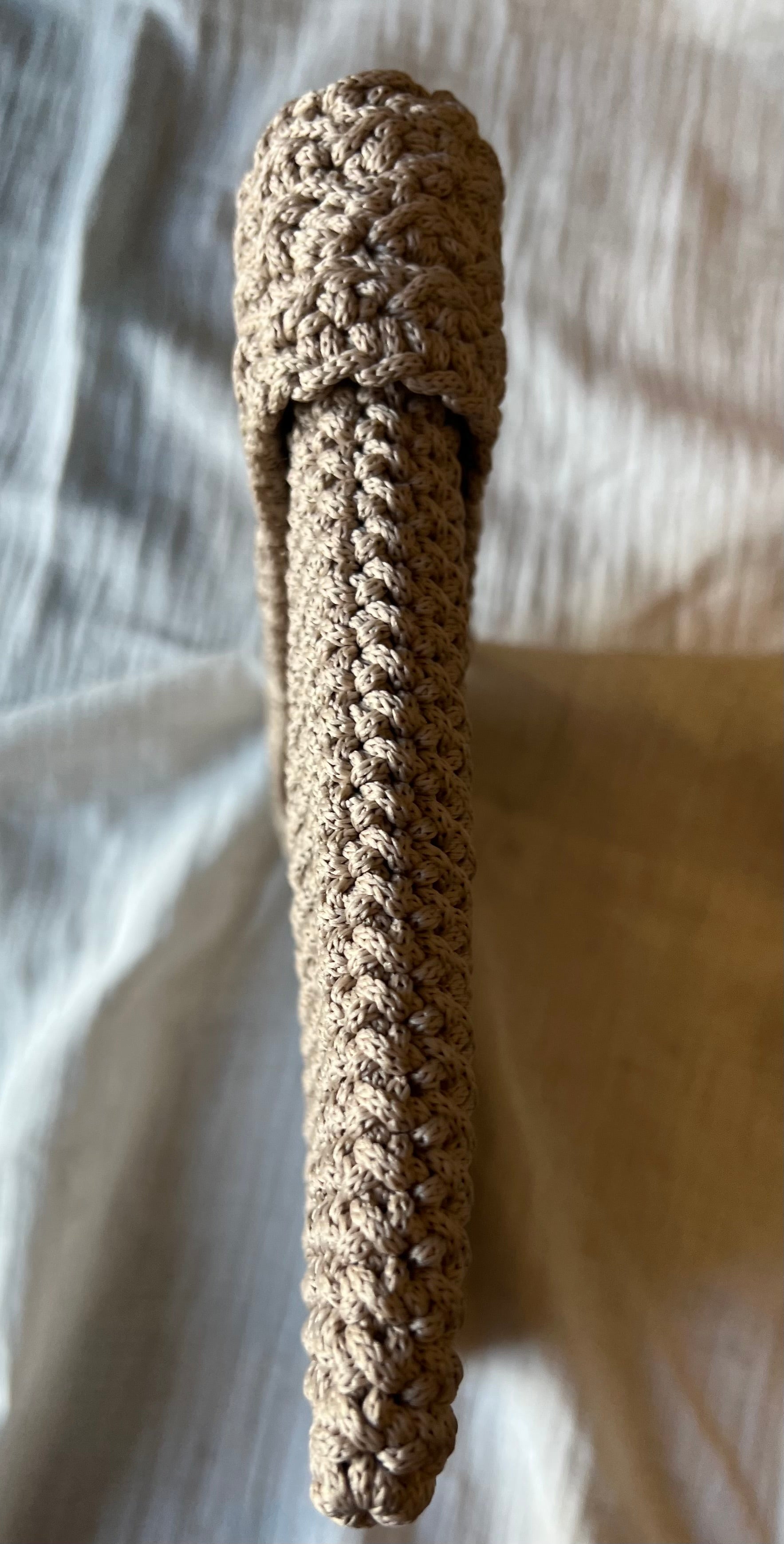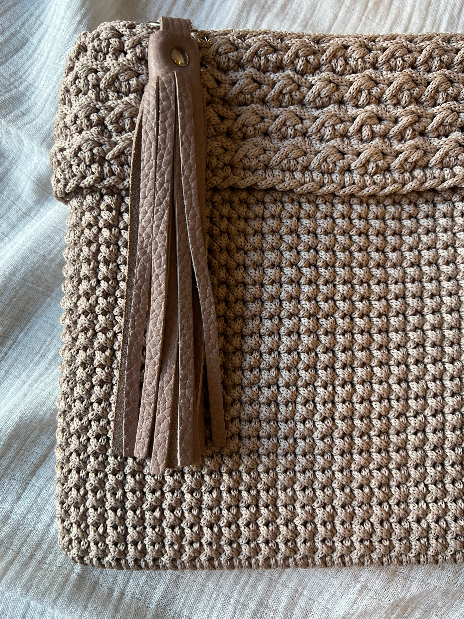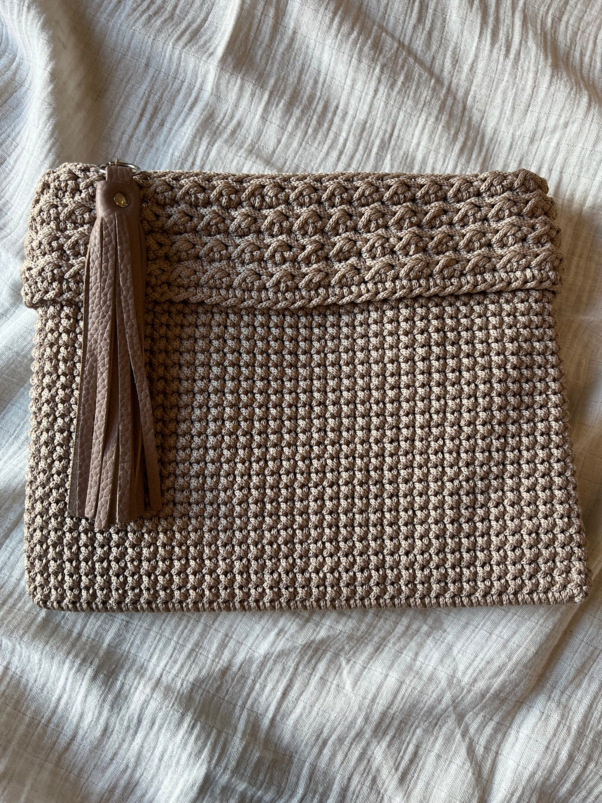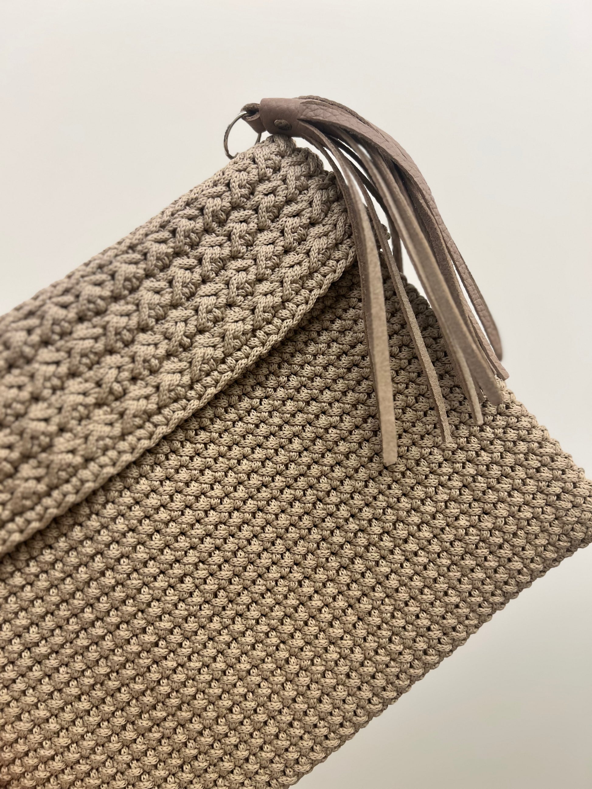 Pochette nude con risvolto, dallo stile essenziale ed elegante. Chiusura a zip con dettaglio in vera pelle. Foderata in cotone, è pratica e raffinata per ogni occasione.