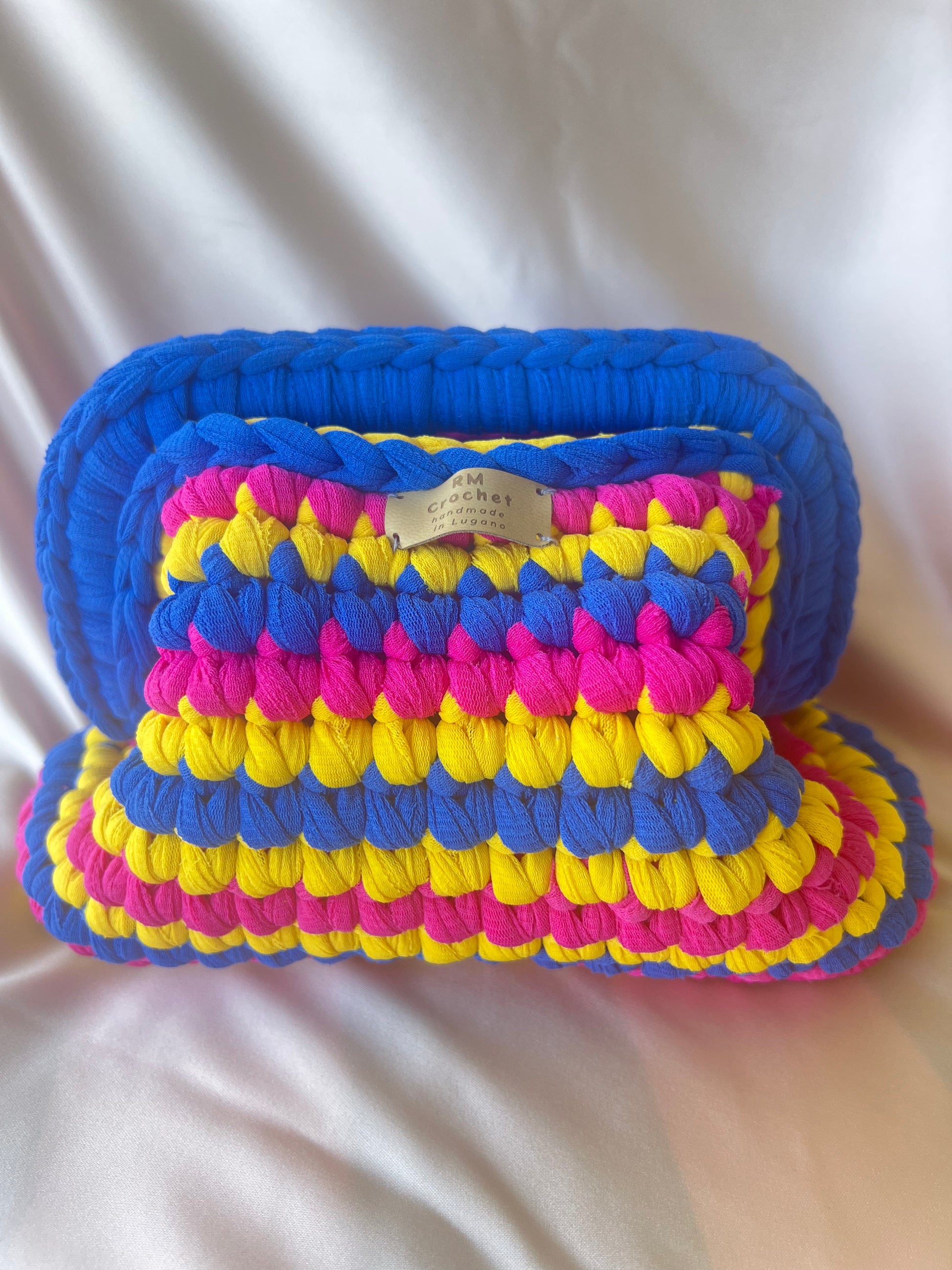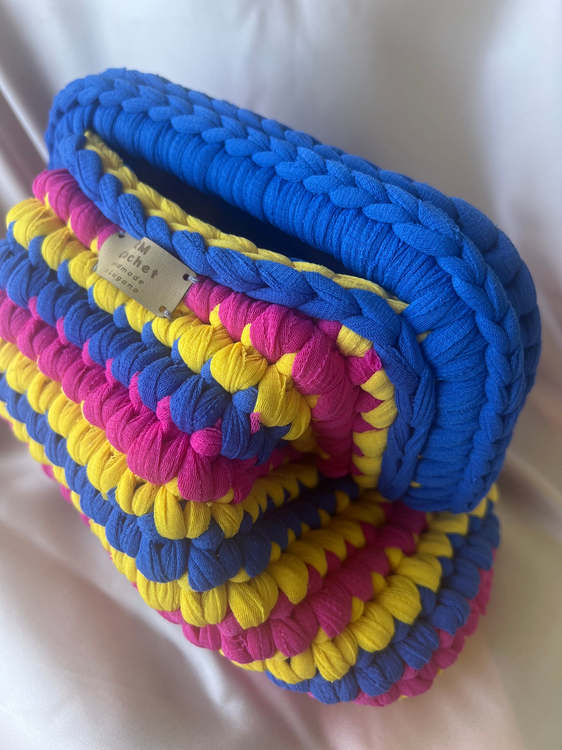 Una splendida clutch nei colori blu, giallo e fuxia. Questa borsa vi porta subito in spiaggia, al mare e con una bell’abbronzatura!