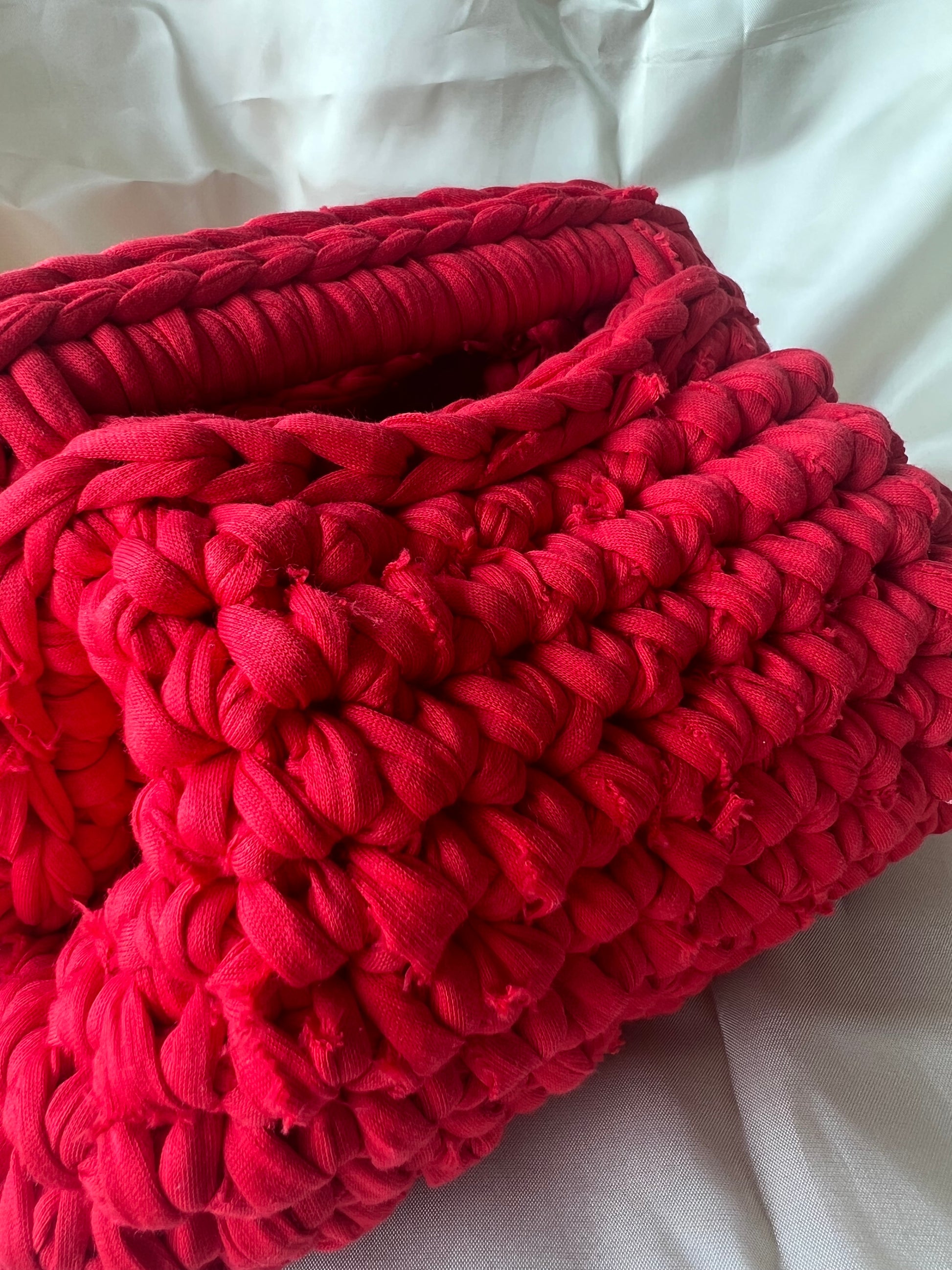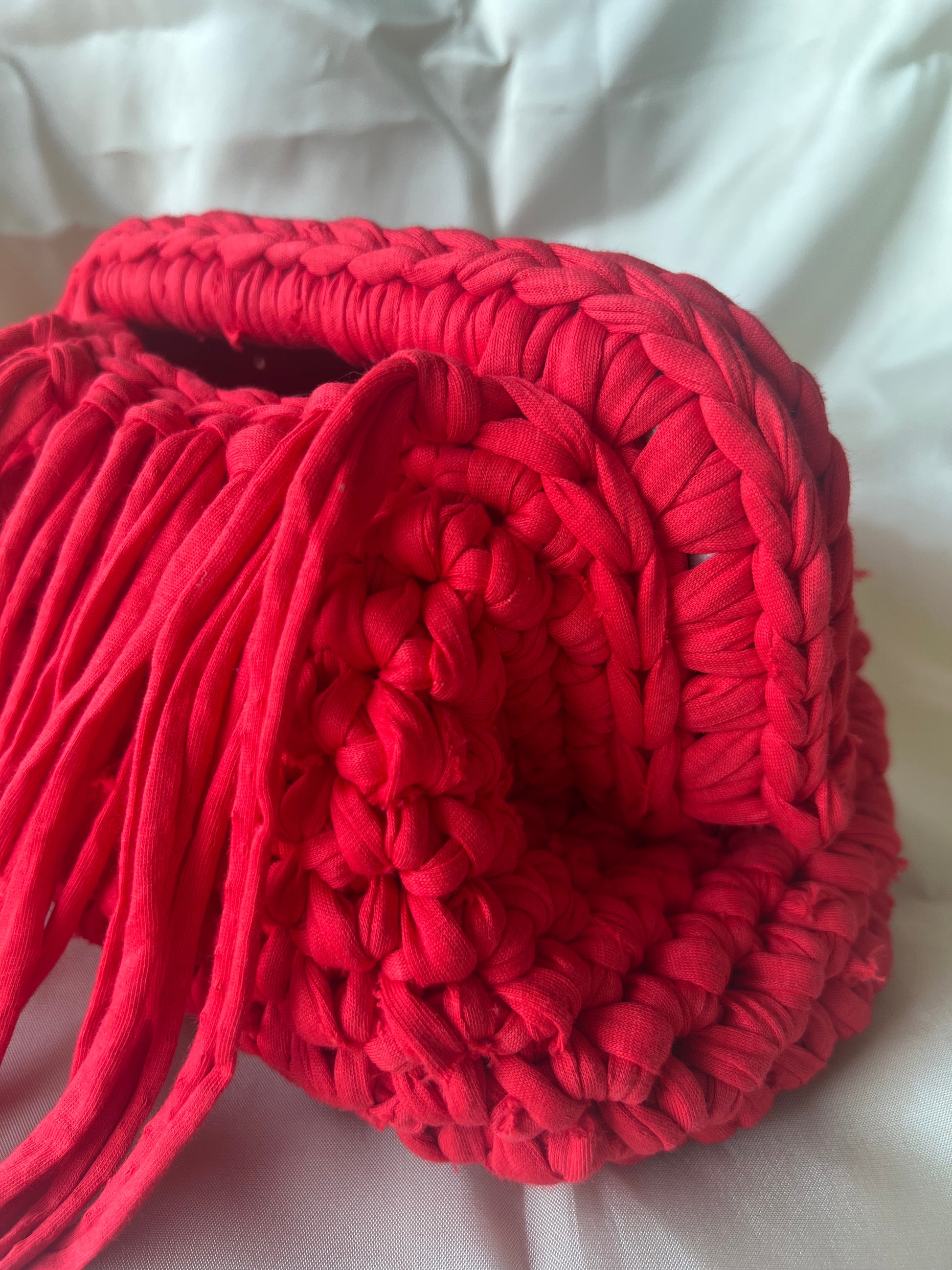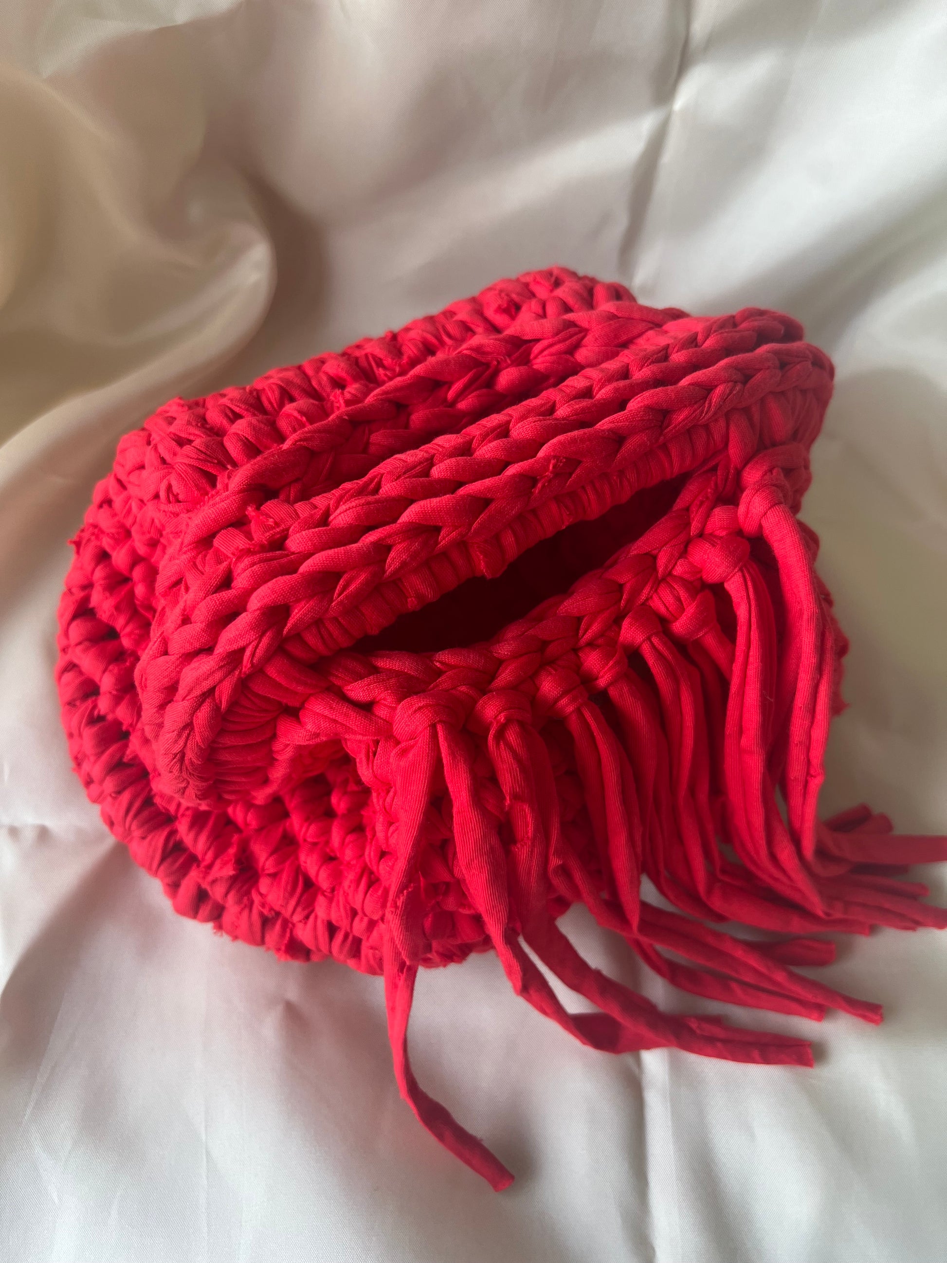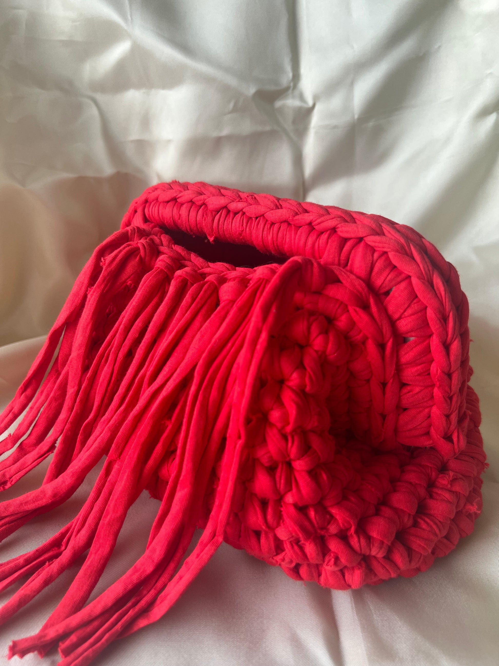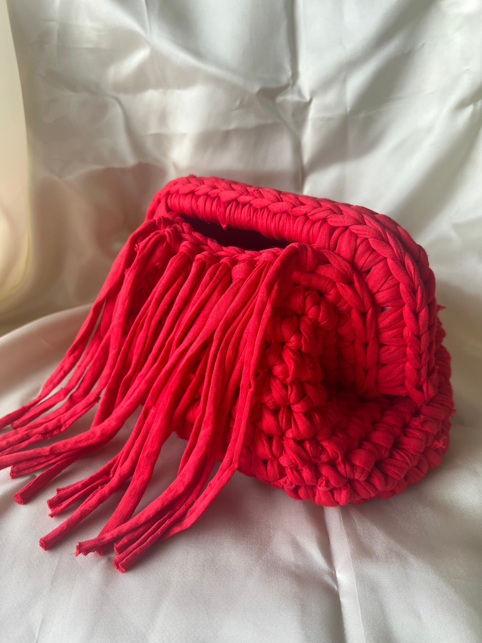 Bellissima clutch in colore rosso con frange. Filato naturalmente sfilacciato.