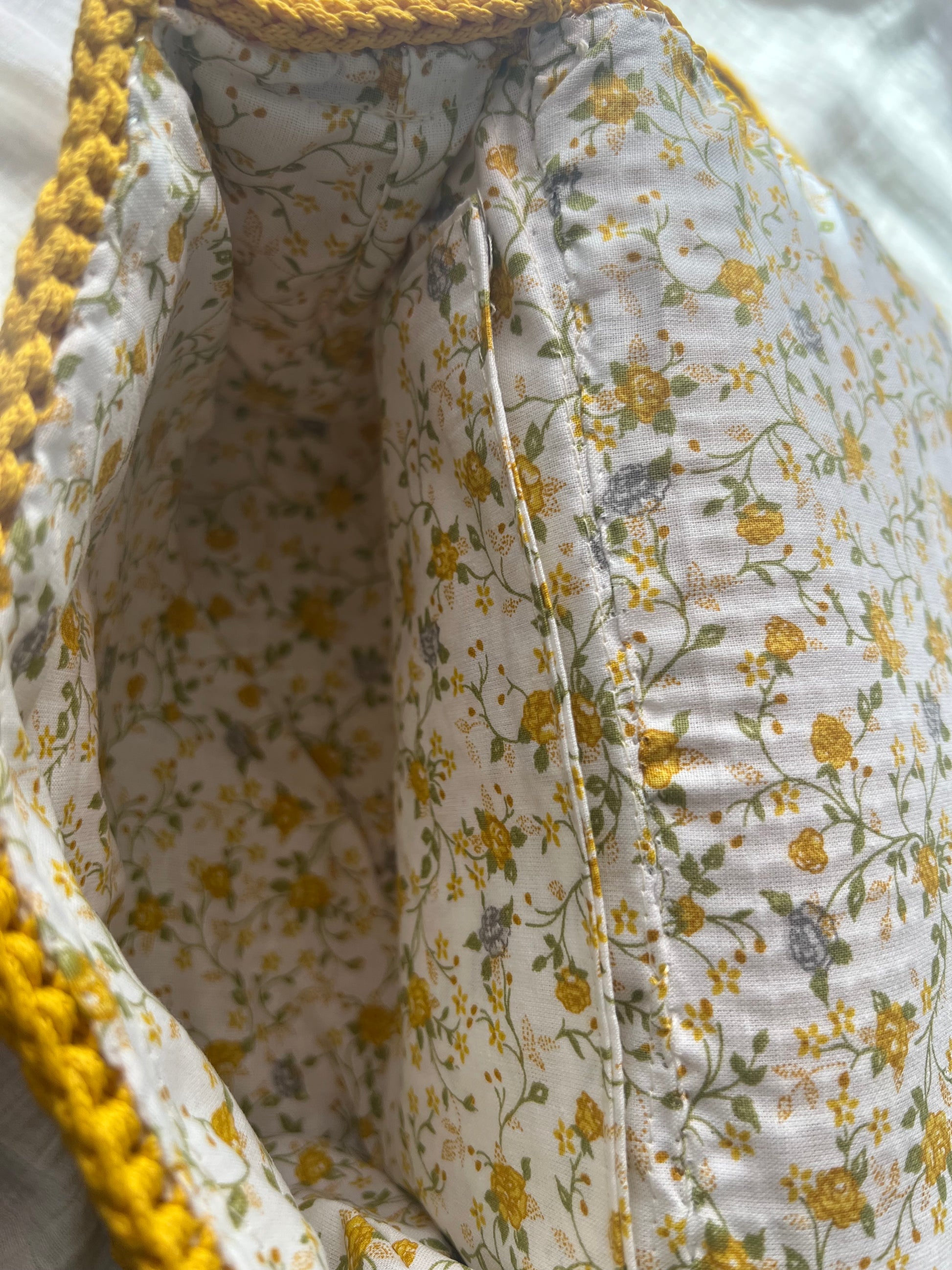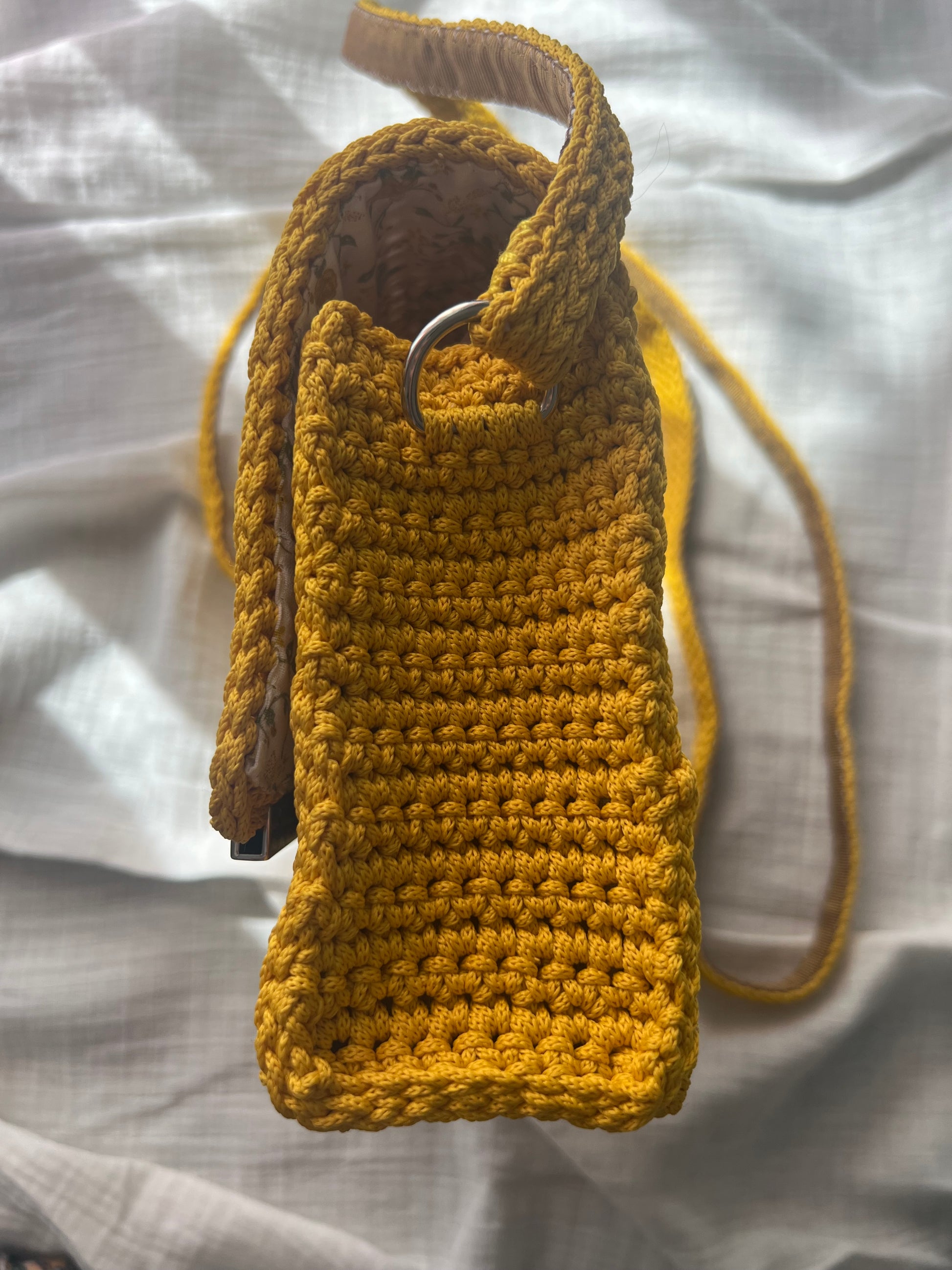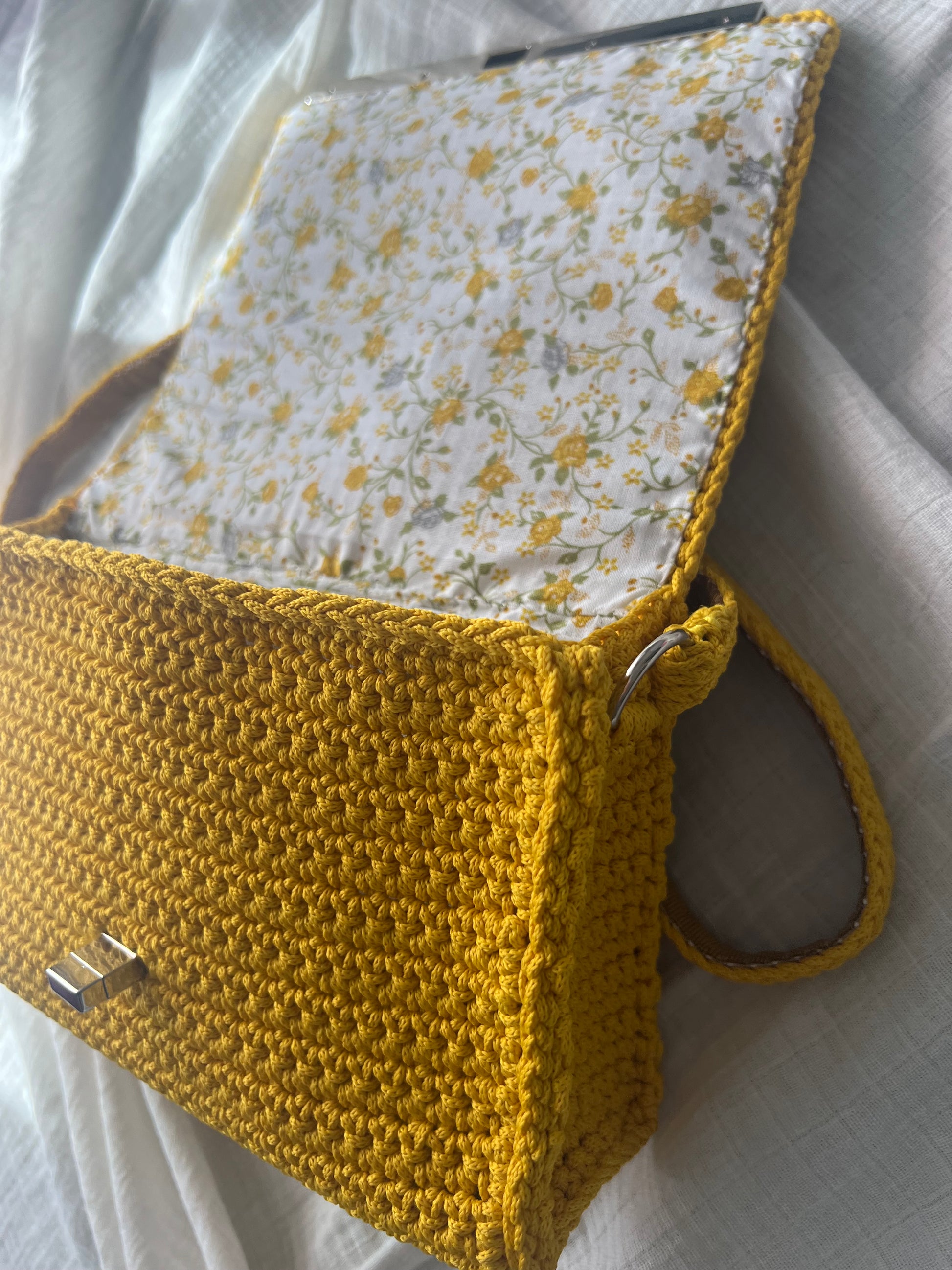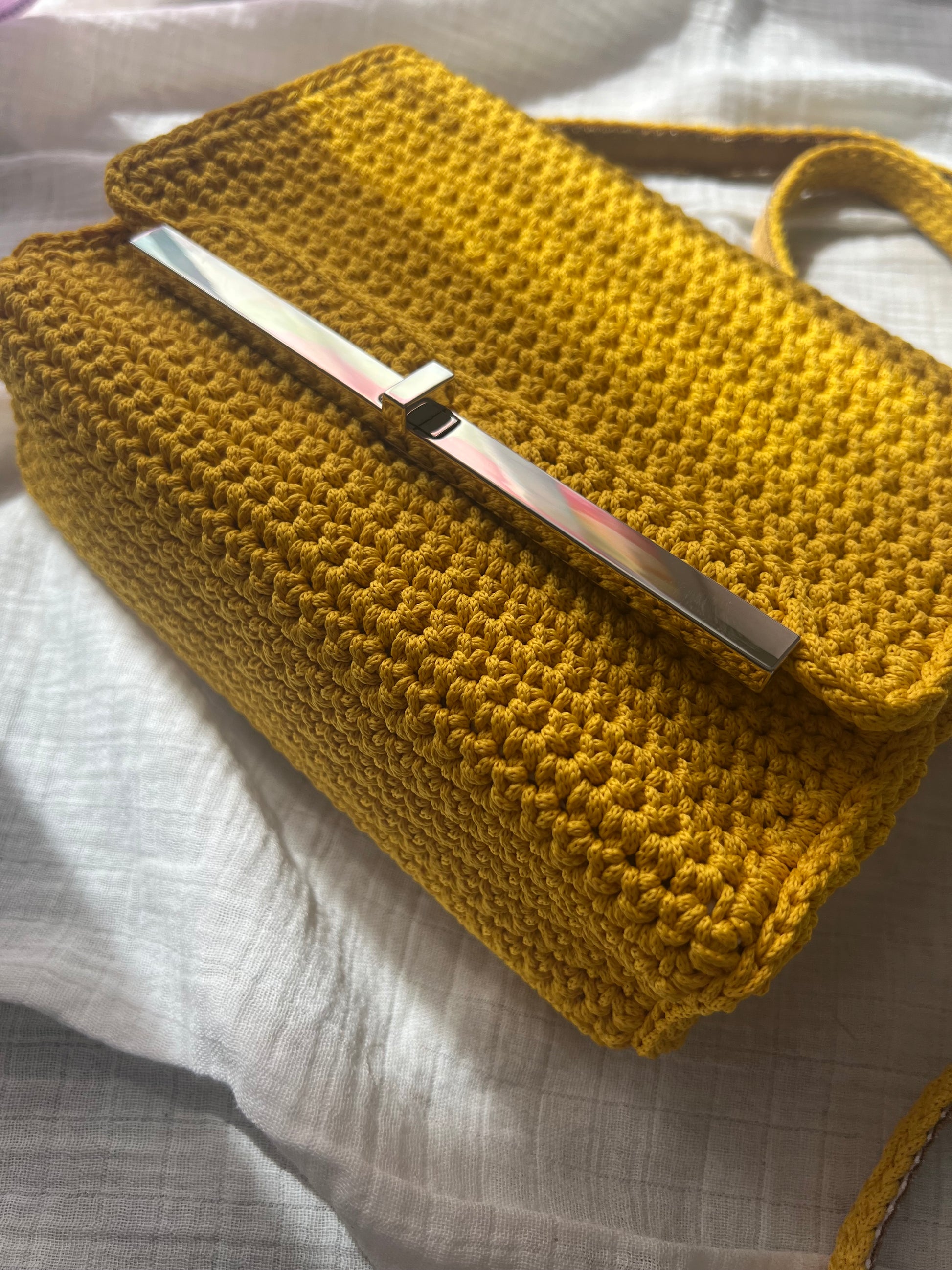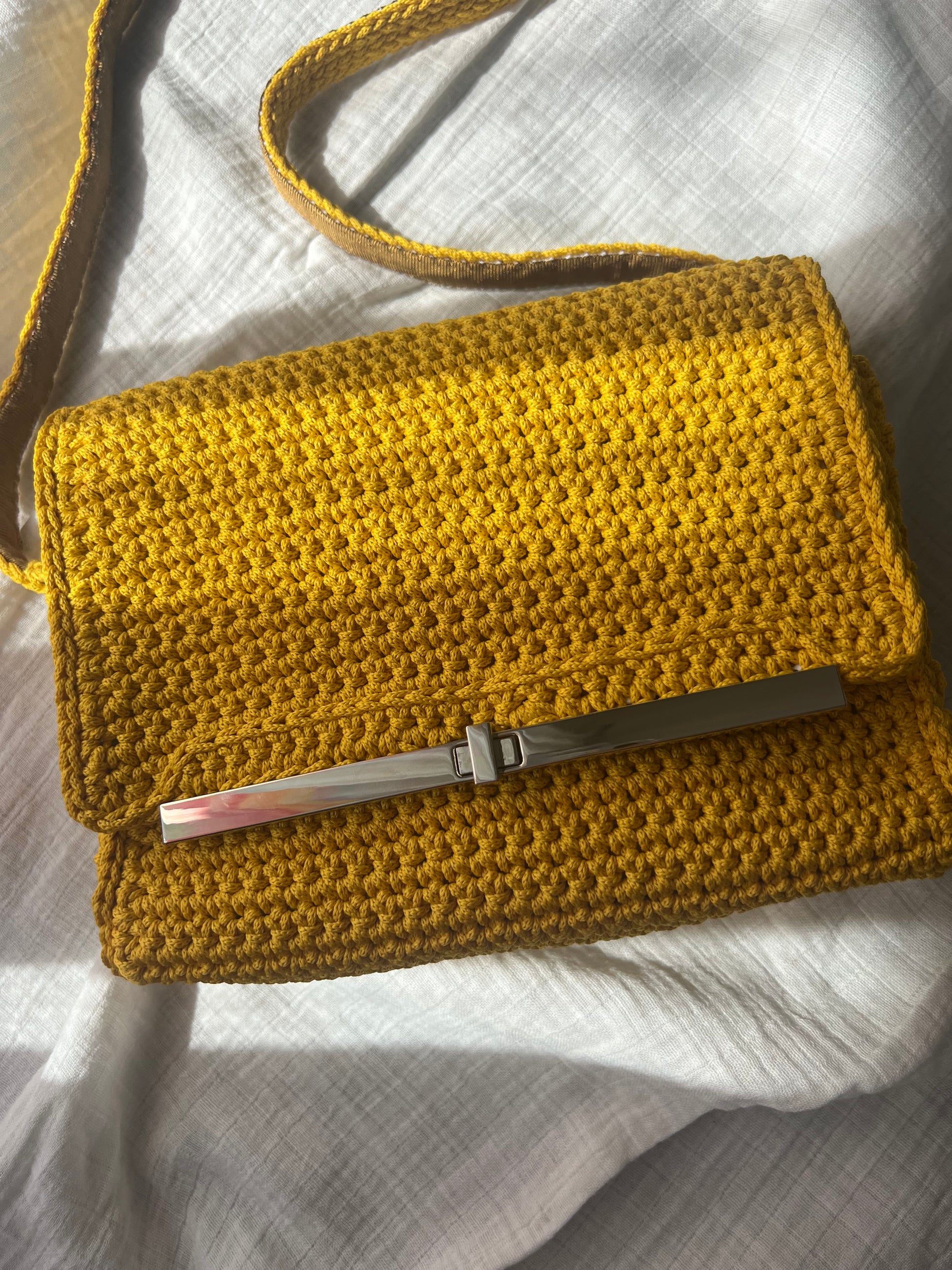 Borsa crochet in cordino color senape, realizzata interamente a mano. Linea essenziale, texture compatta, chiusura metallica. Un accessorio contemporaneo che non passa inosservato.