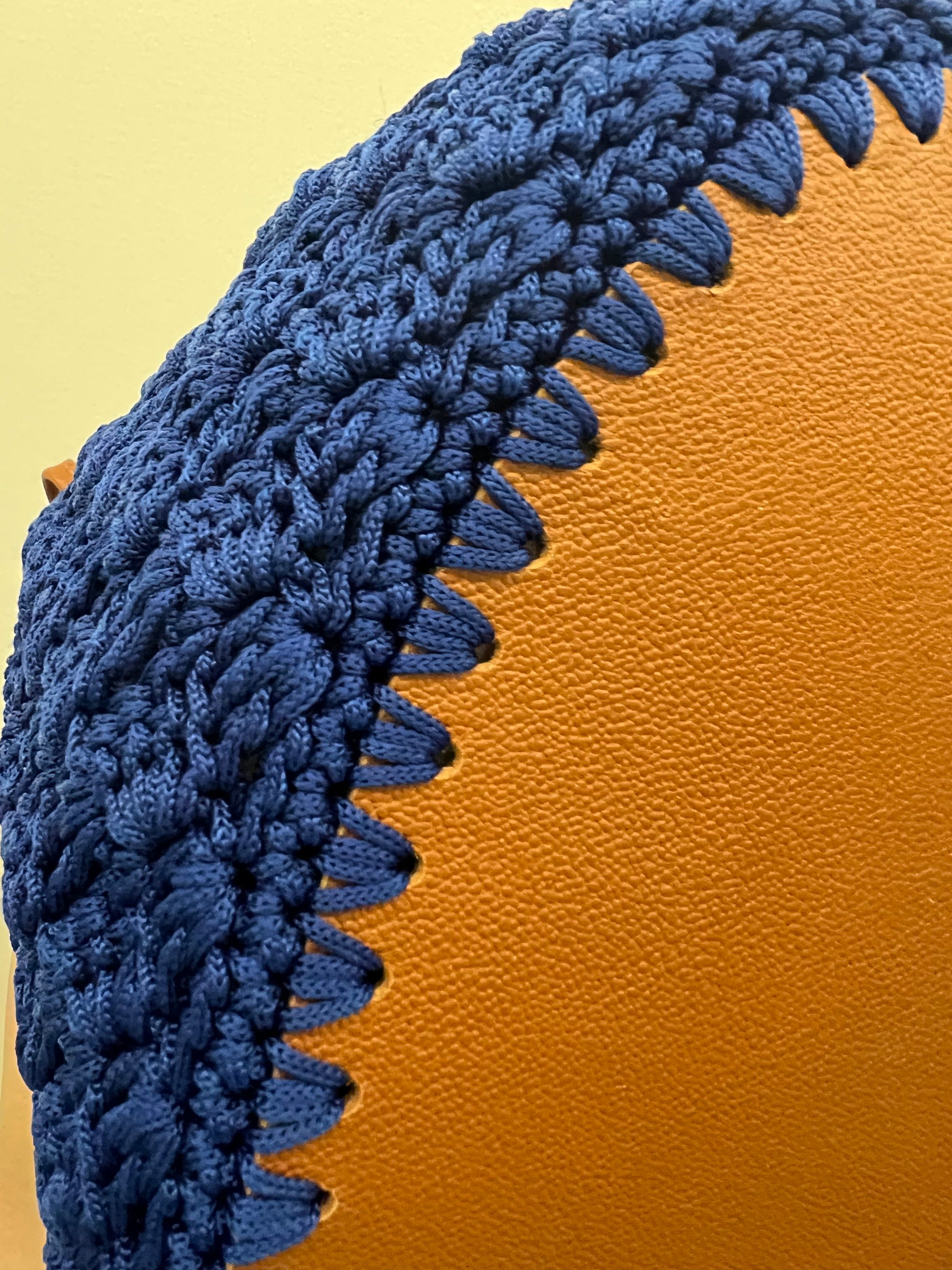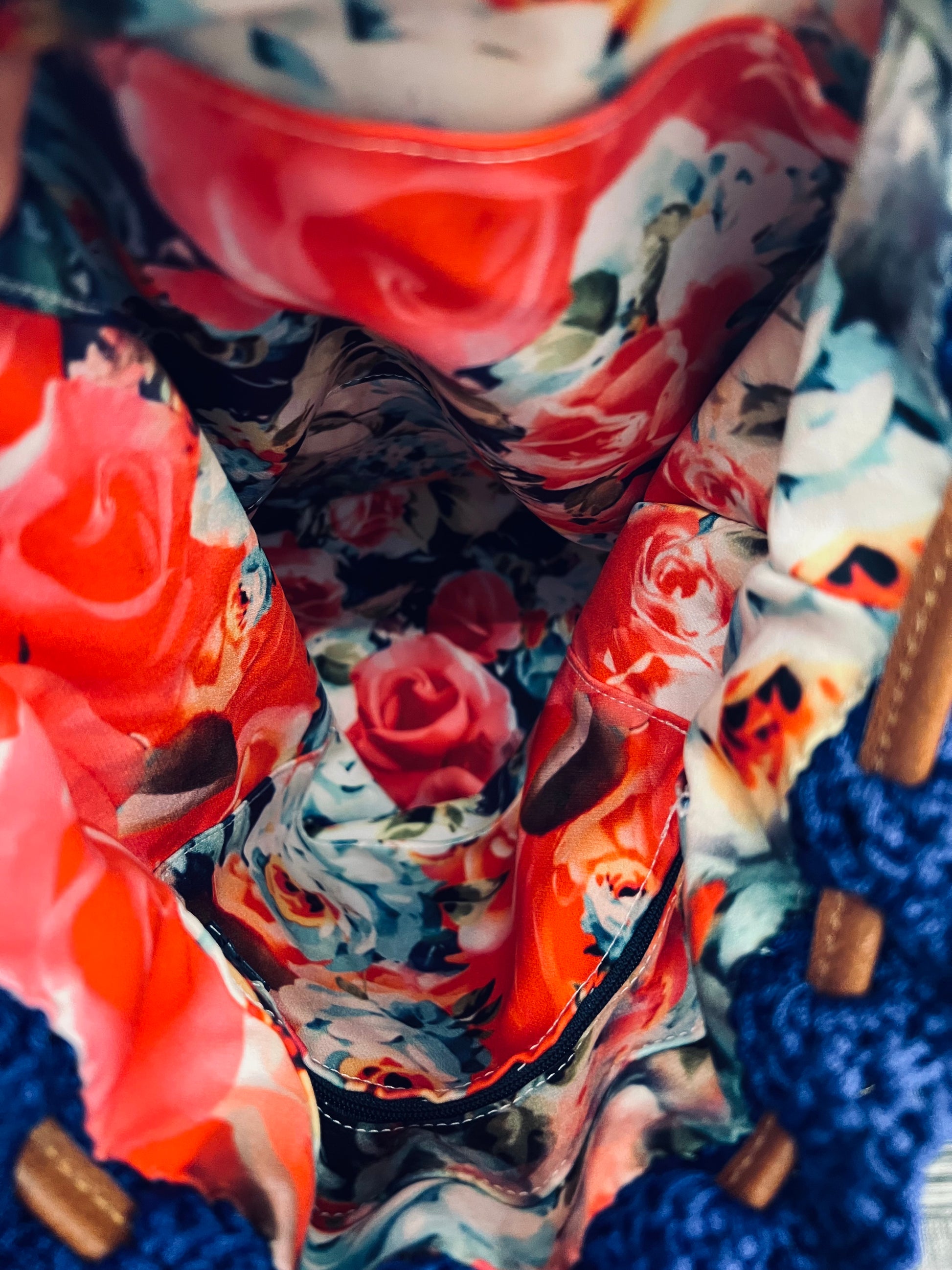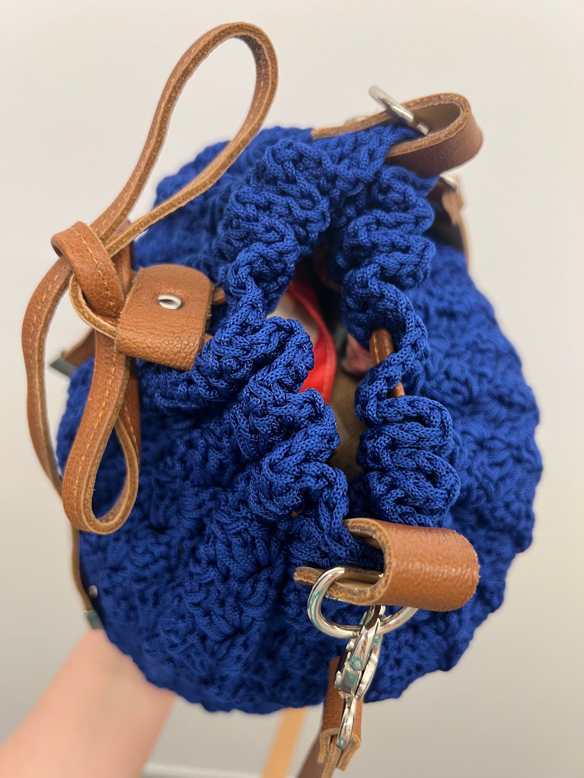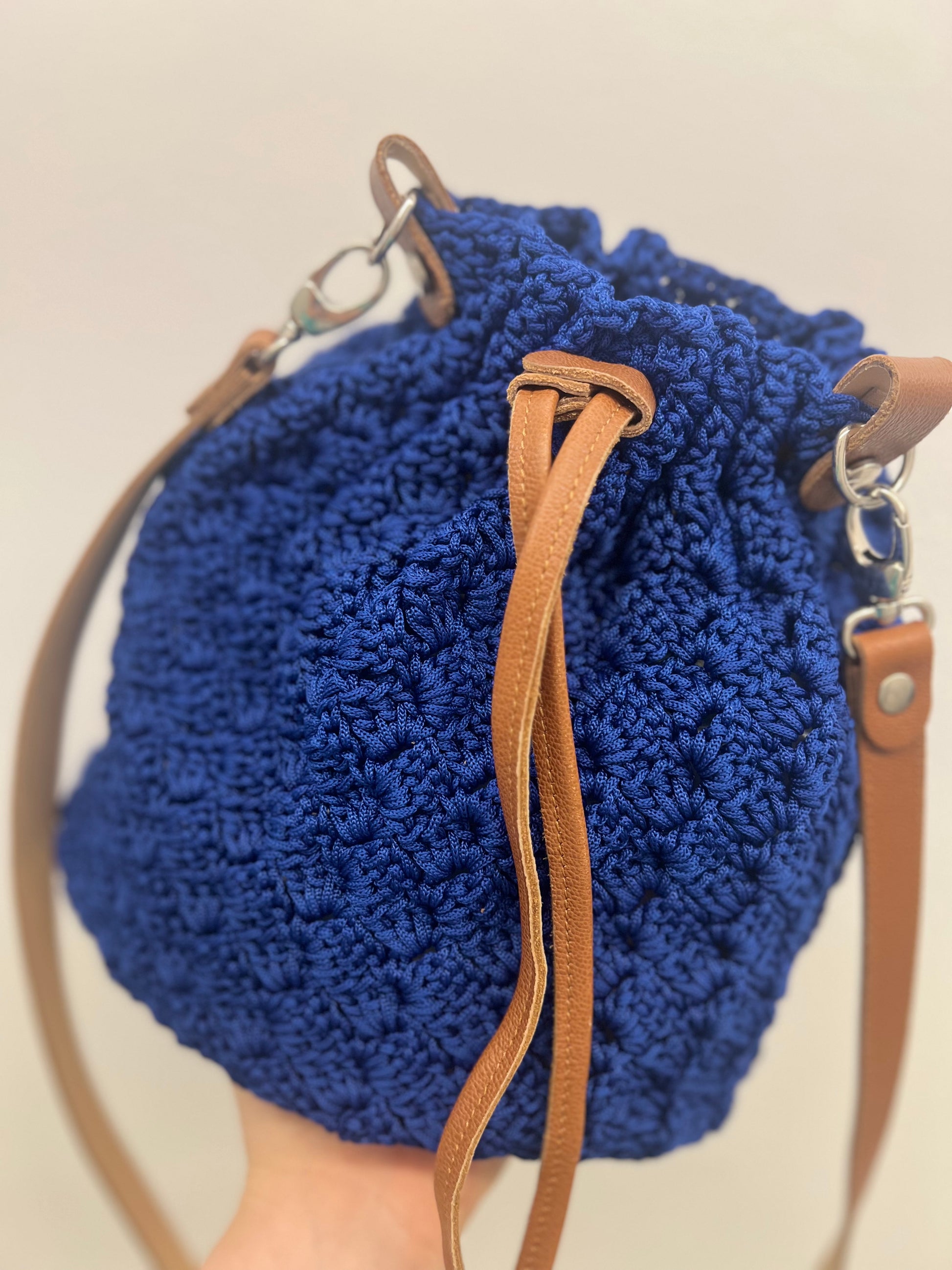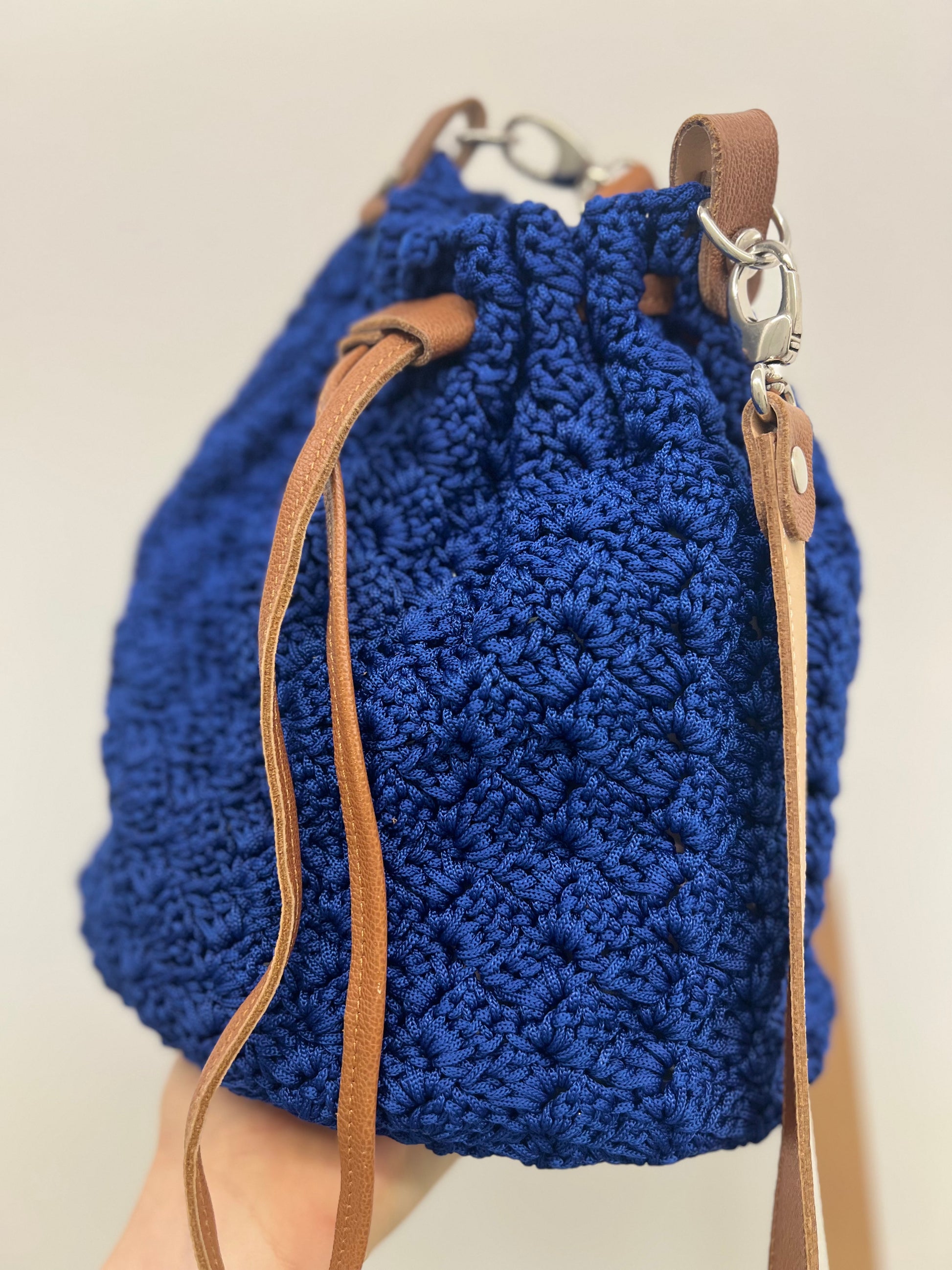 Secchiello blu elettrico in crochet con dettagli in pelle, capiente e pratico, con tracolla in pelle, inserti cuoio e chiusura a coulisse. Un mix di artigianalità e stile deciso. Fodera interna floreale con taschino.