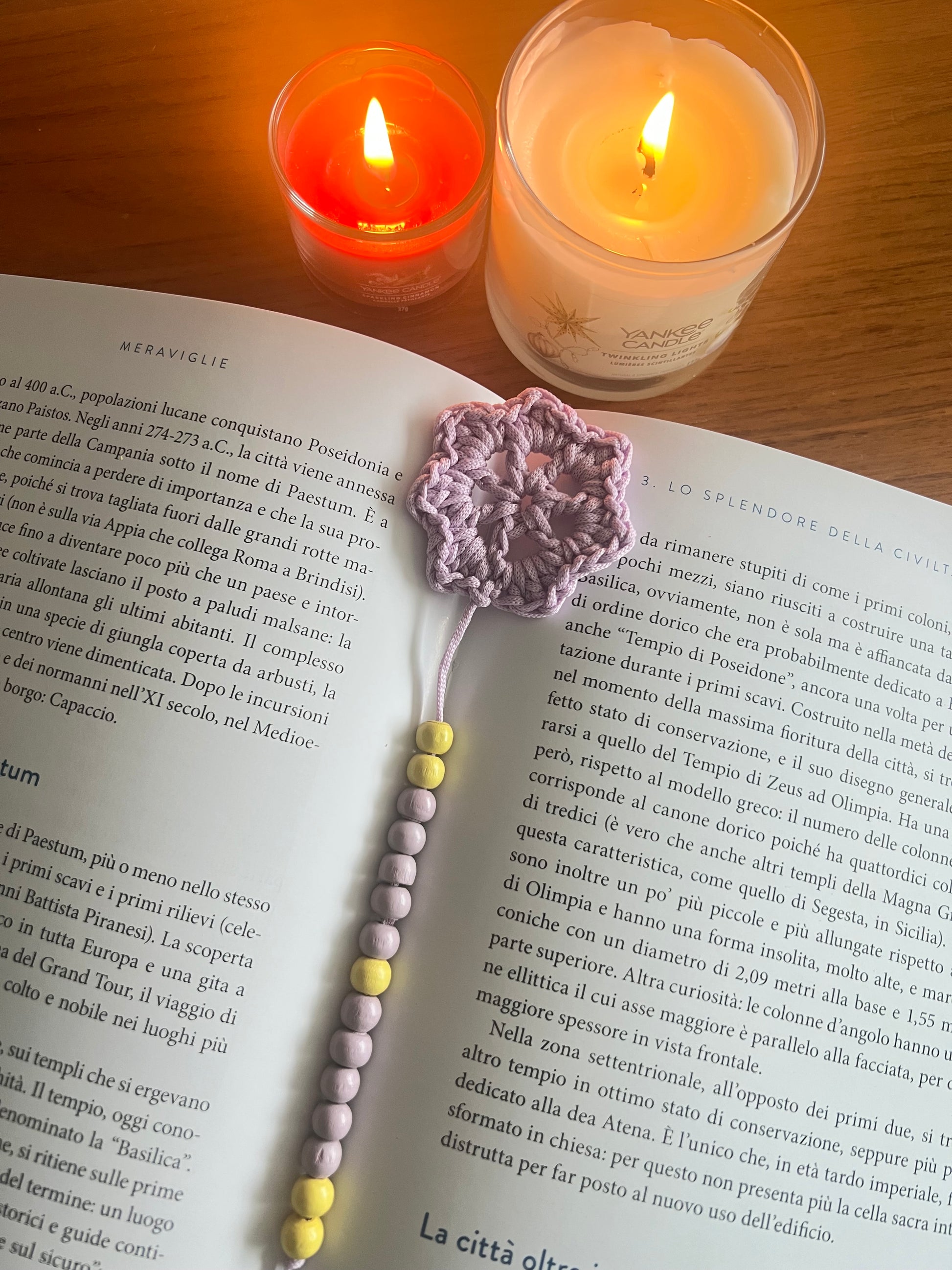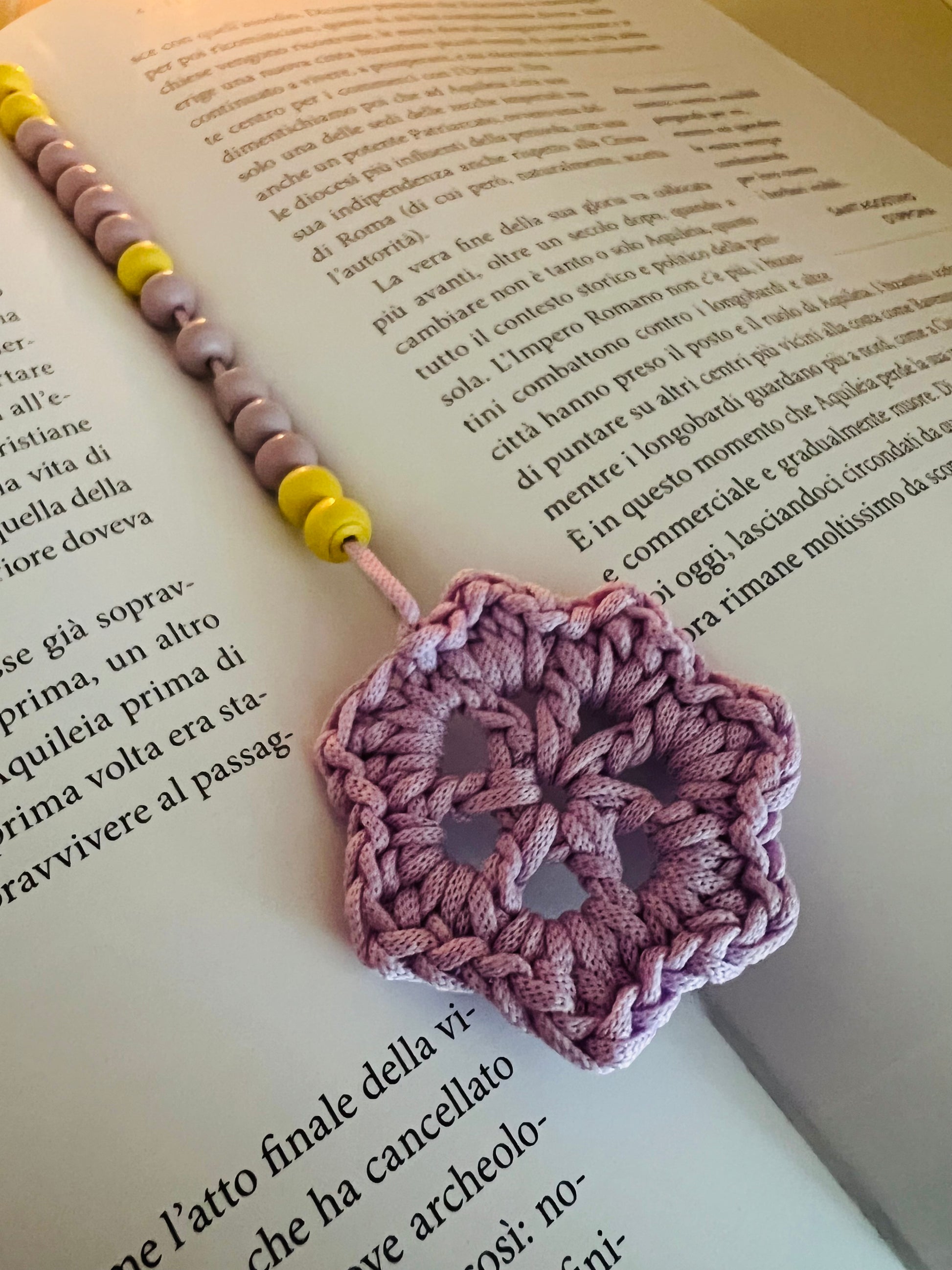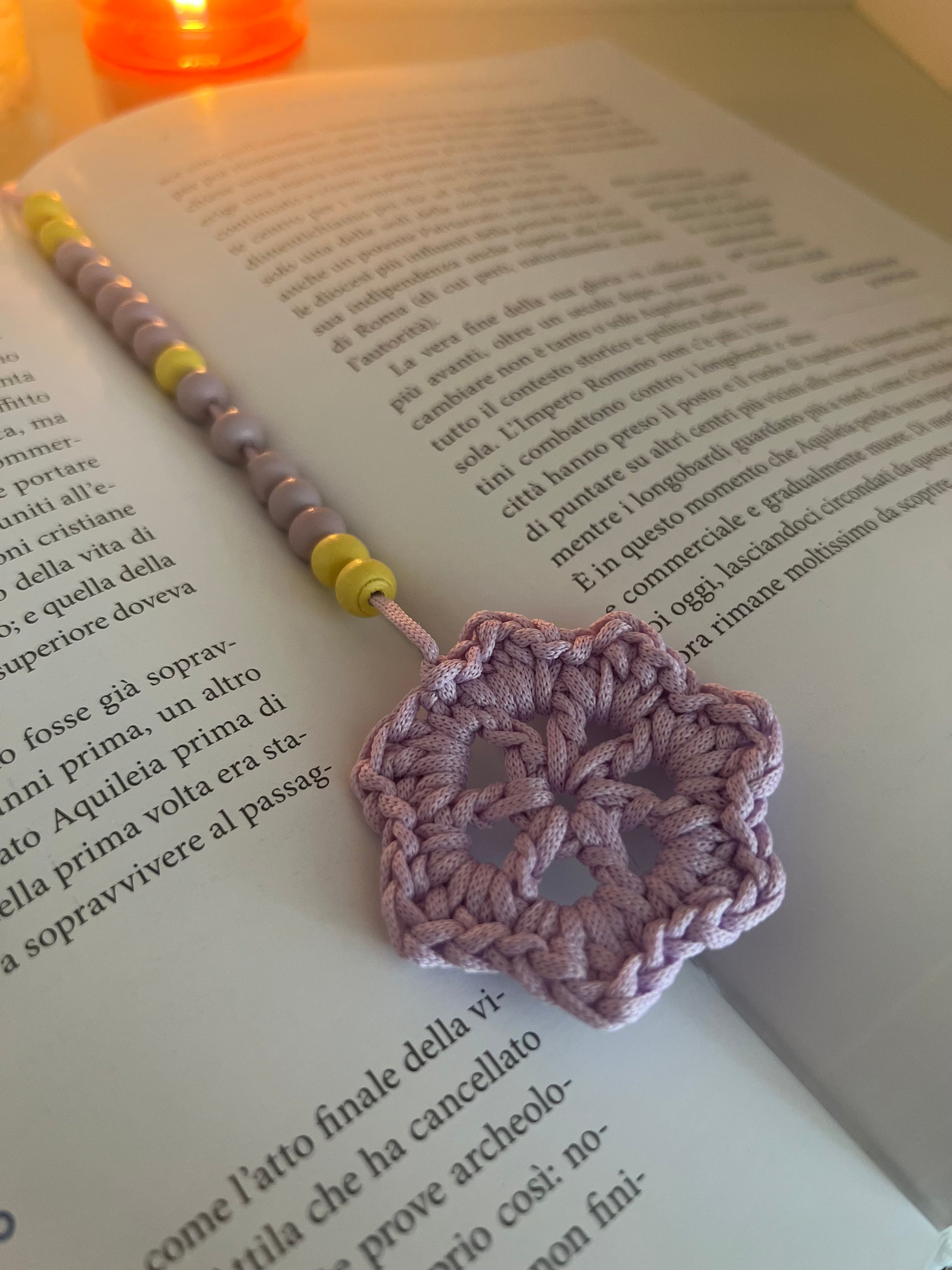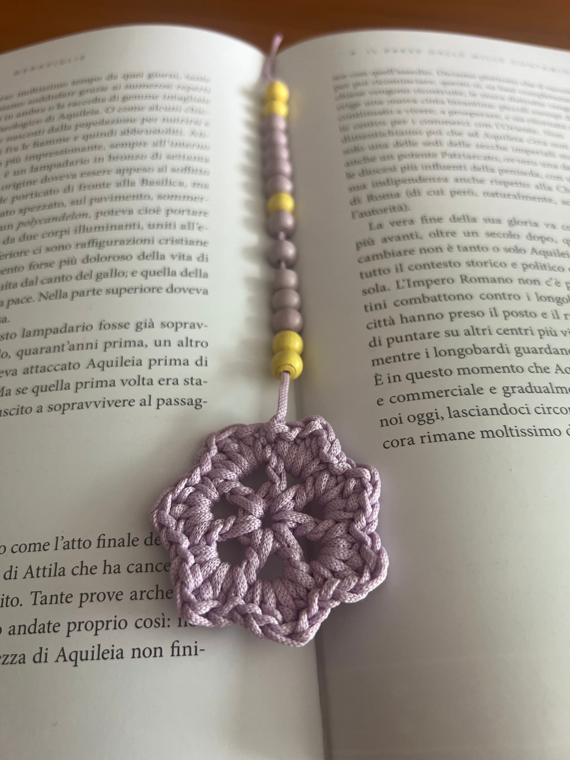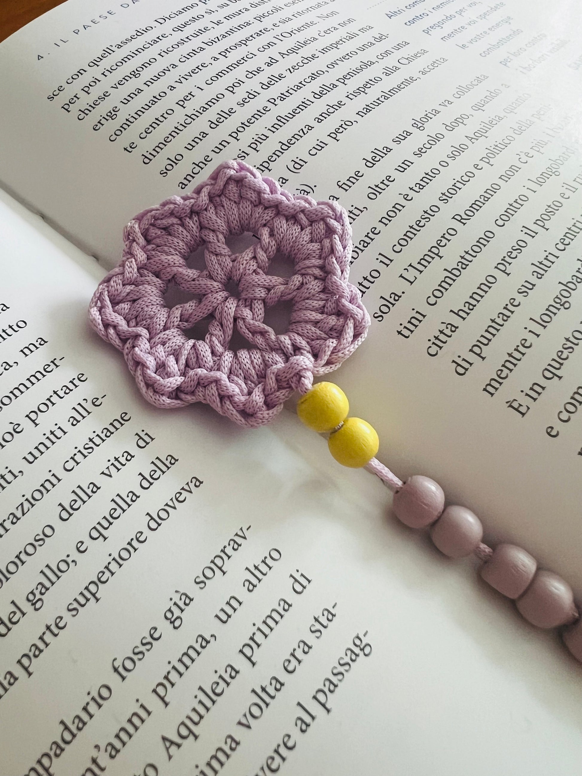 Una piccola stella viola veglia sulle pagine, come un pensiero che brilla nel silenzio della lettura. Le perline di legno, nei toni del viola e del giallo, si rincorrono come luci lontane in un cielo di carta.