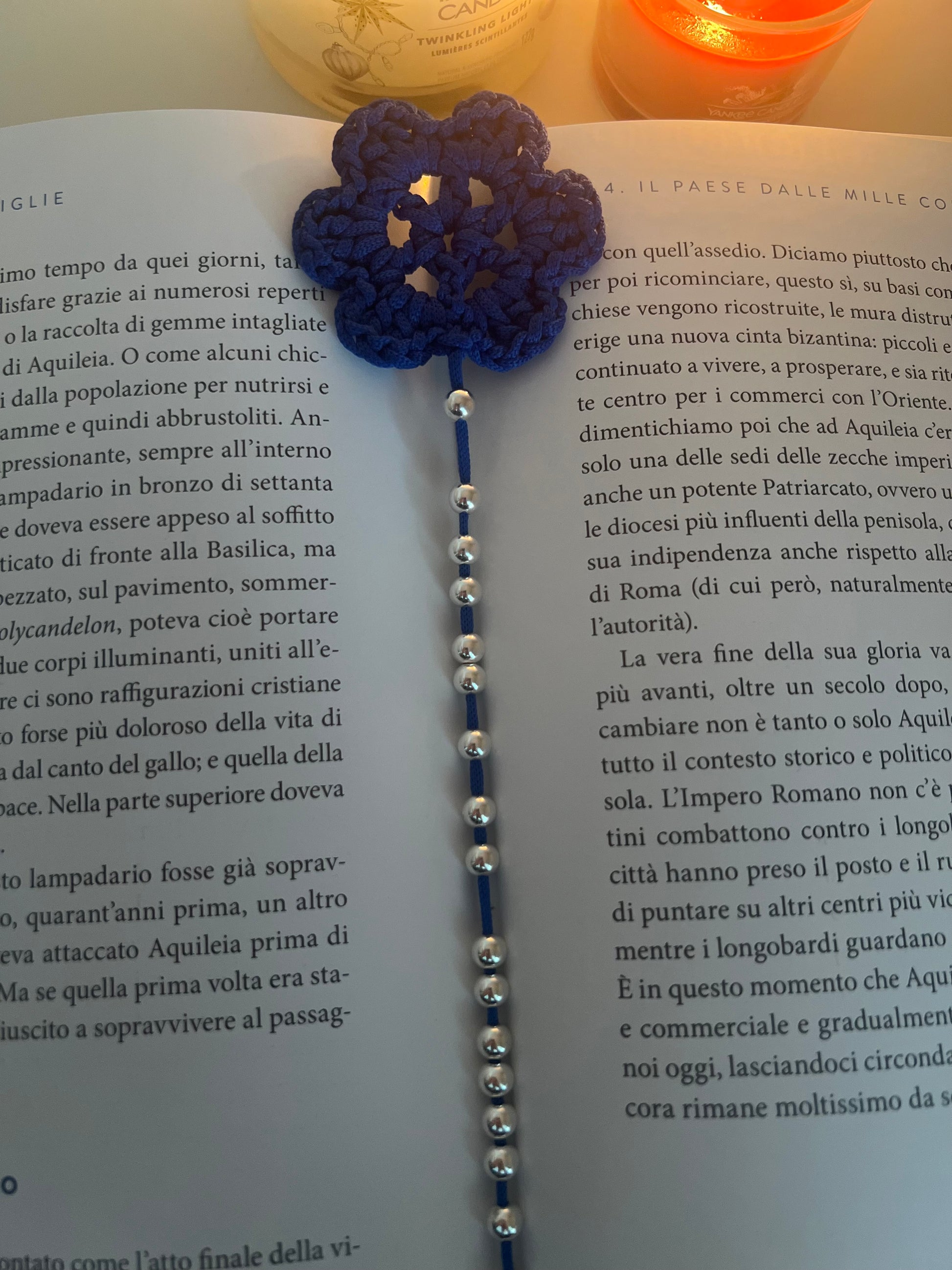 Sboccia tra le pagine un piccolo fiore blu, come nato in una notte d’estate sotto la luce quieta della luna. I suoi petali custodiscono l’eleganza dell’attesa, la dolcezza di ciò che non ha fretta.