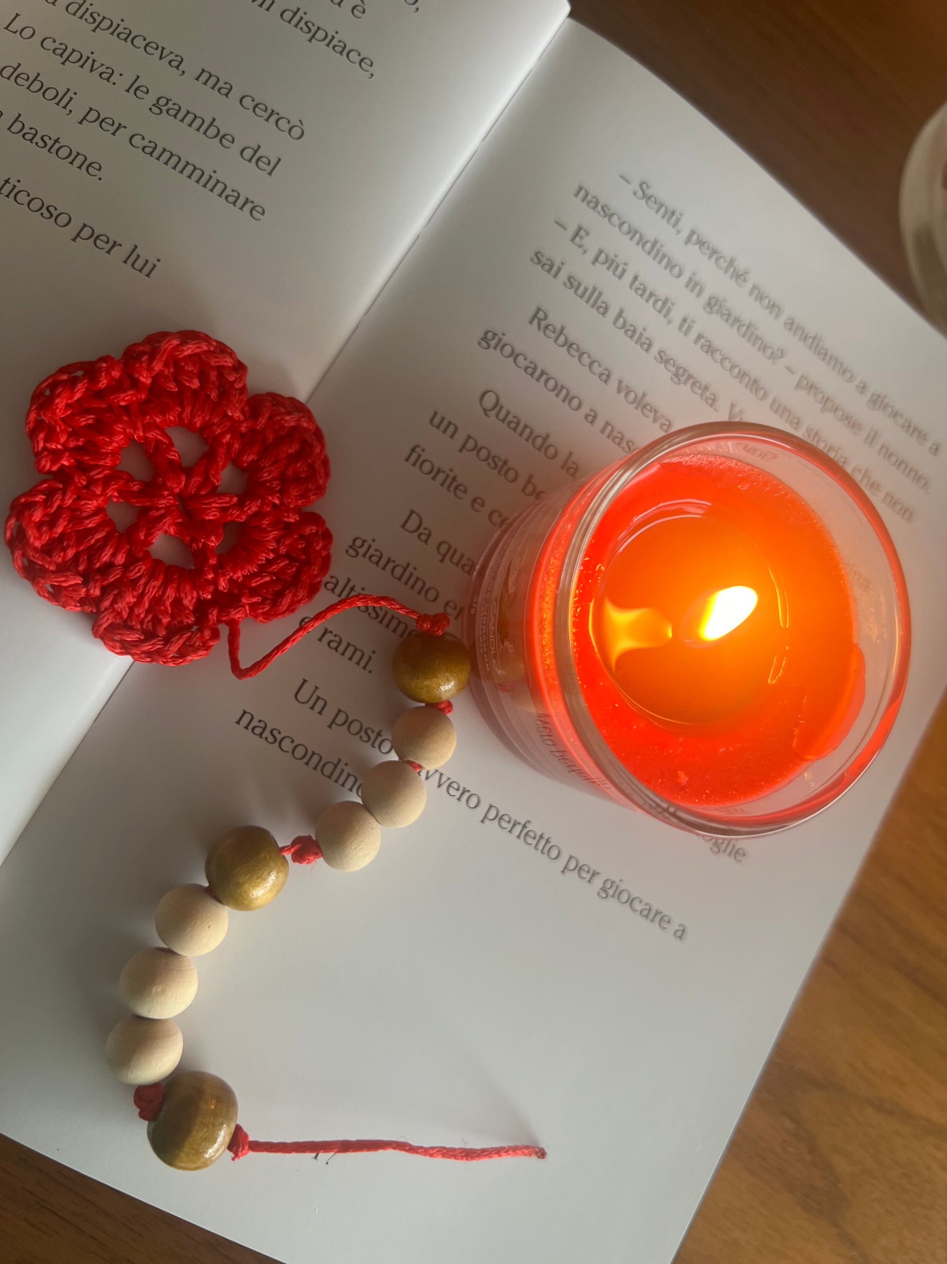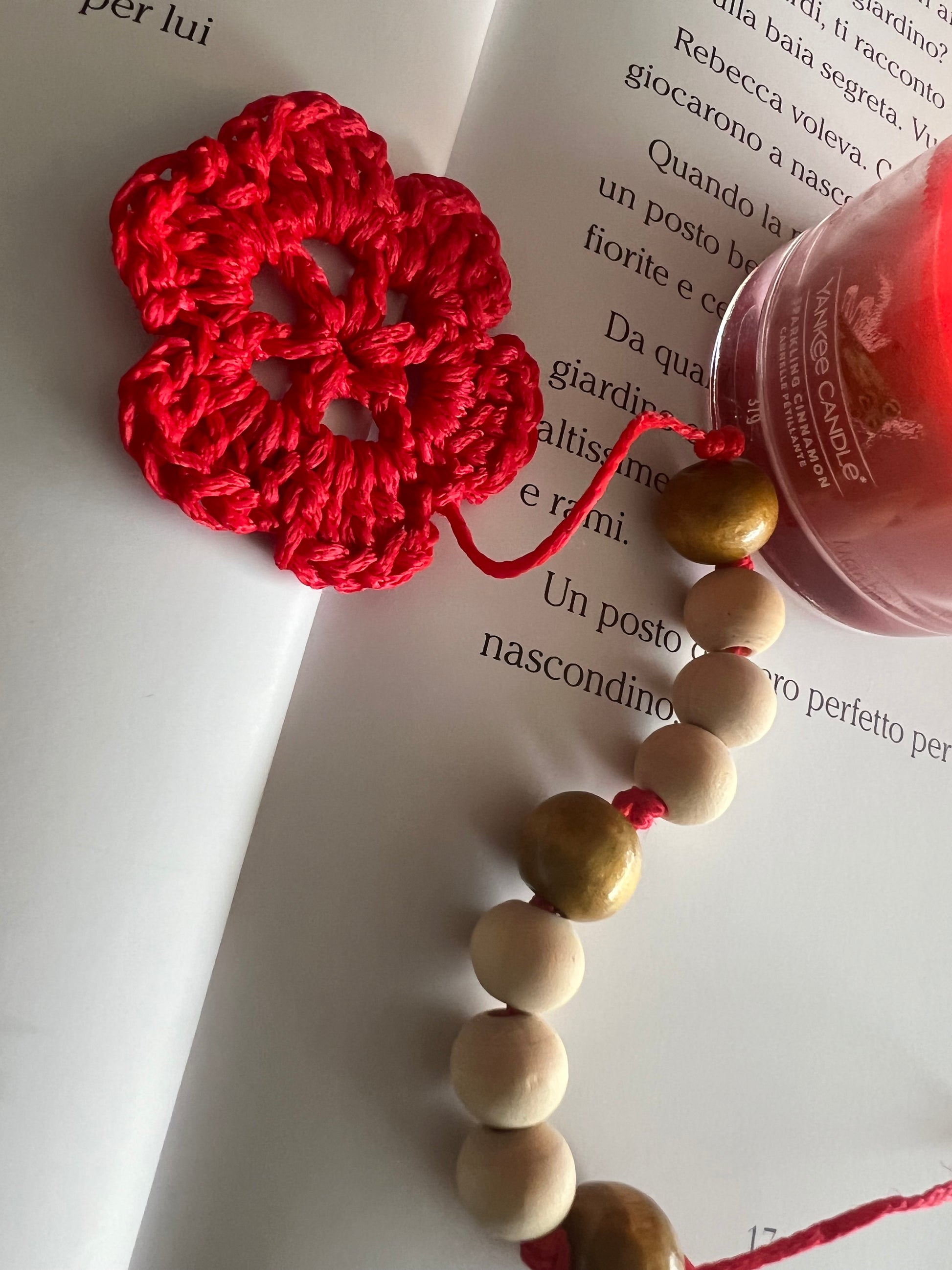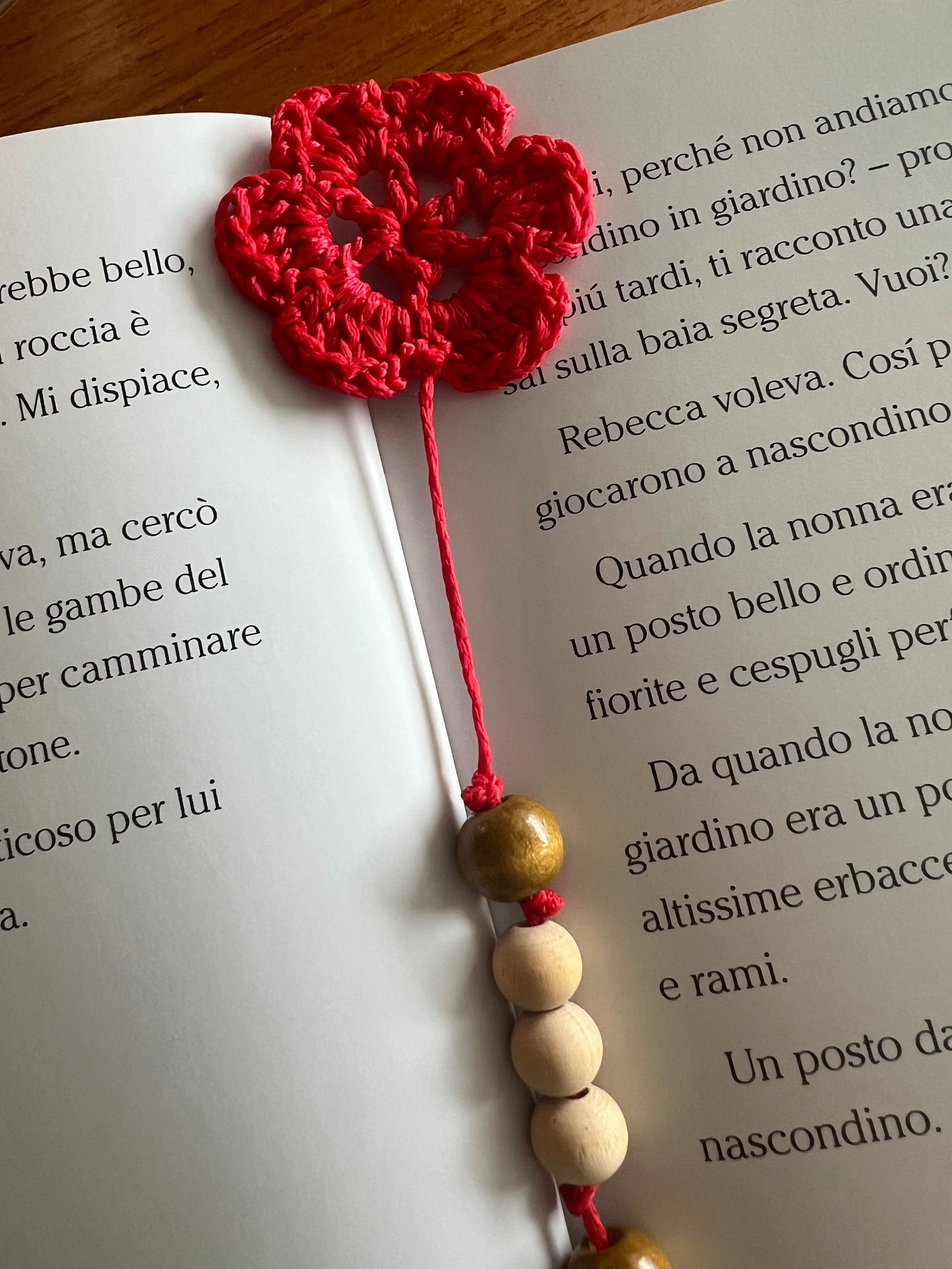 Un fiore rosso, acceso come un pensiero improvviso, sboccia all’uncinetto tra le pagine di un libro. È un segnalibro che profuma di lentezza e poesia, intrecciato a mano per chi ama perdersi tra le righe e ritrovarsi tra i colori.