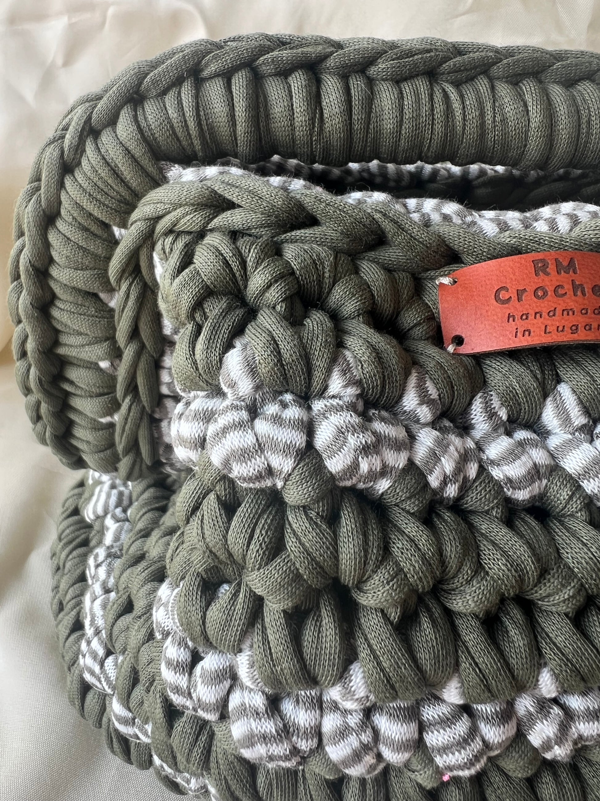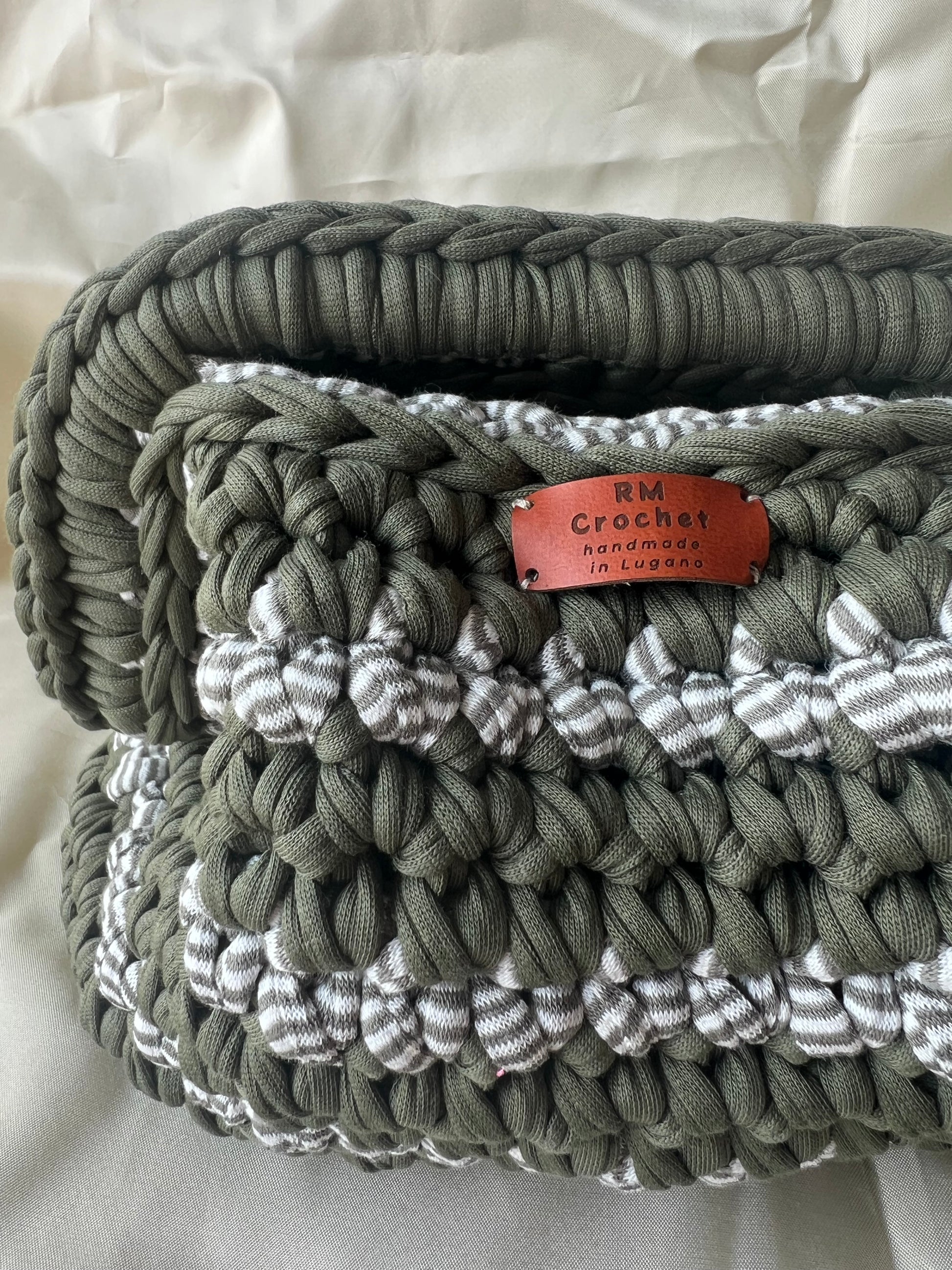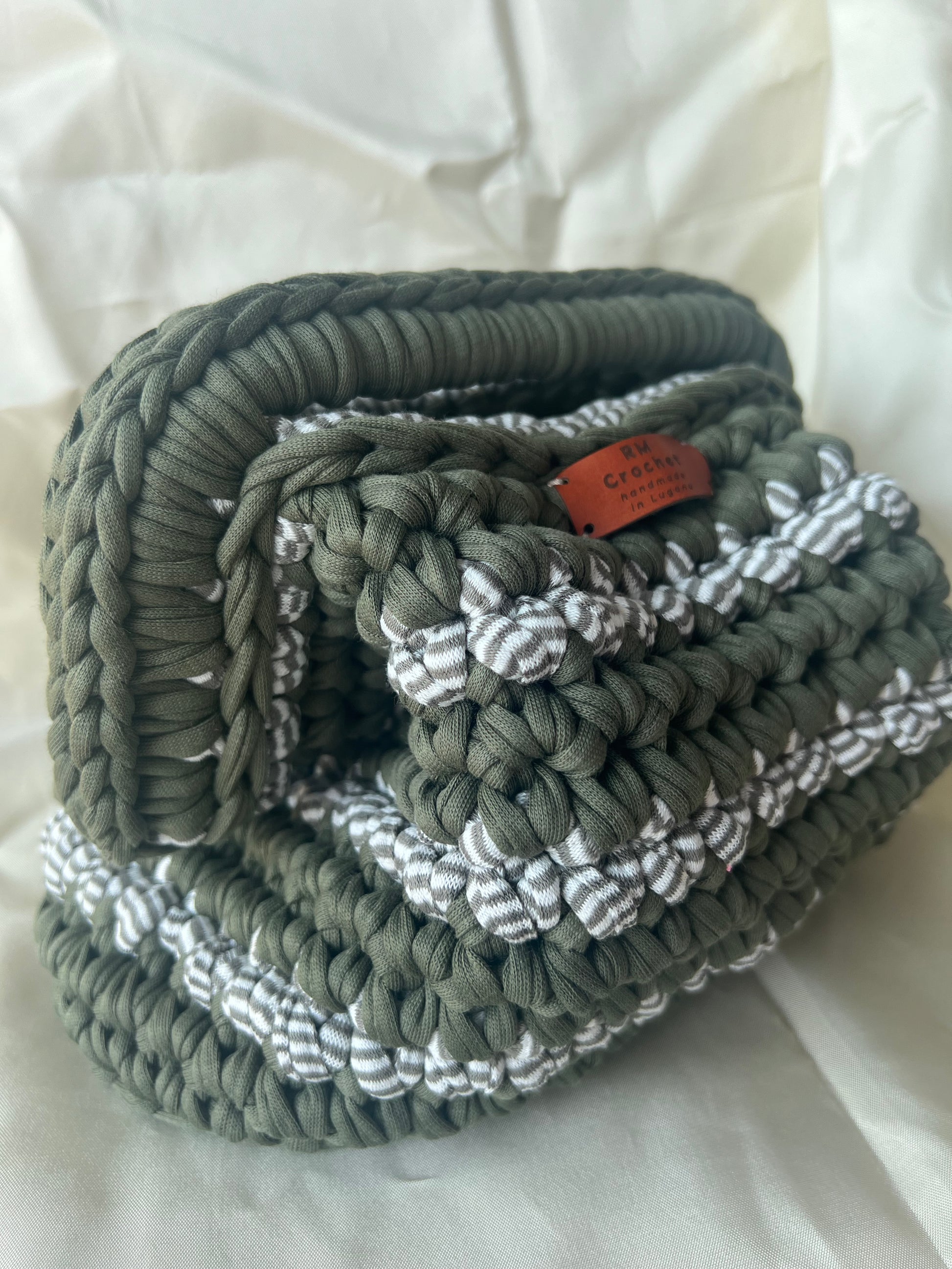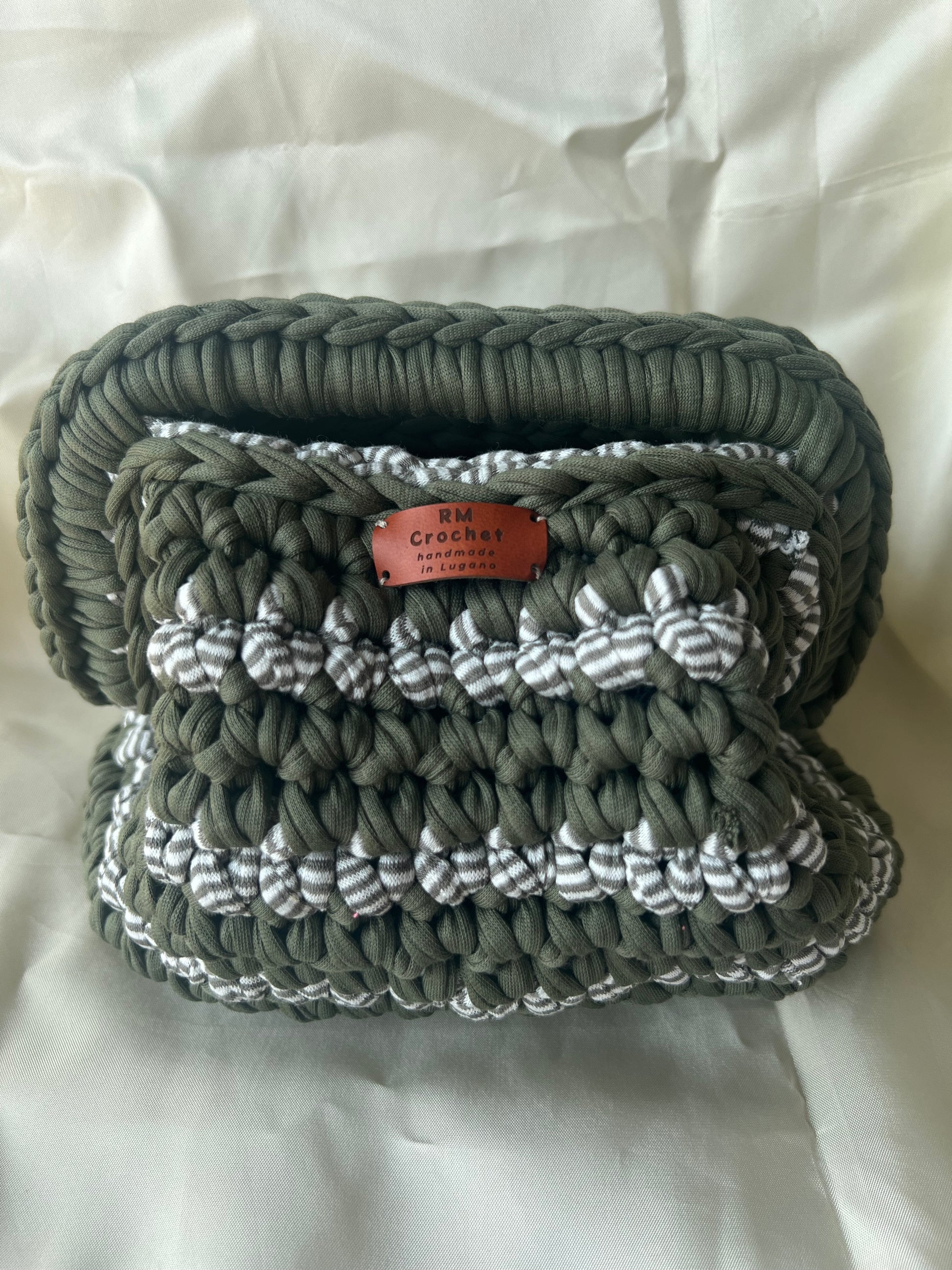Clutch bicolore verde e bianca, realizzata con filato intrecciato che crea un elegante motivo naturale nei toni del verde e del bianco. Il design unico richiama texture organiche e fresche, perfetto per la stagione estiva. Ampia, raffinata e predisposta per l’aggiunta di tracolla.